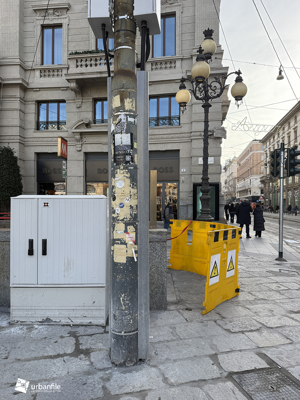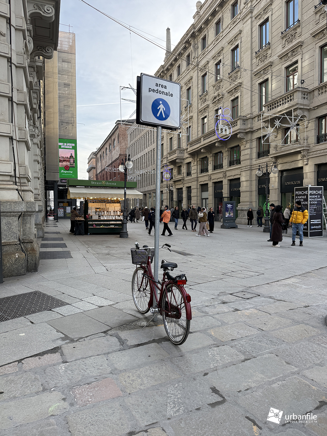 Avremmo inoltre gradito una maggiore attenzione all’arredo urbano. Pali, paletti, semafori e lampioni appaiono disordinati e privi di un disegno coerente: alcuni gialli, altri in metallo nudo, uno verde (perché?) e altri ancora in grigio (per non menzionare i fari di supporto, così brutti). Il solito, purtroppo, assente coordinamento milanese. Abbiamo notato anche l’aggiunta di un palo con il cartello “area pedonale” prima di imboccare via dei Mercanti, la cui utilità resta poco chiara, trovandosi già in piena area pedonale.