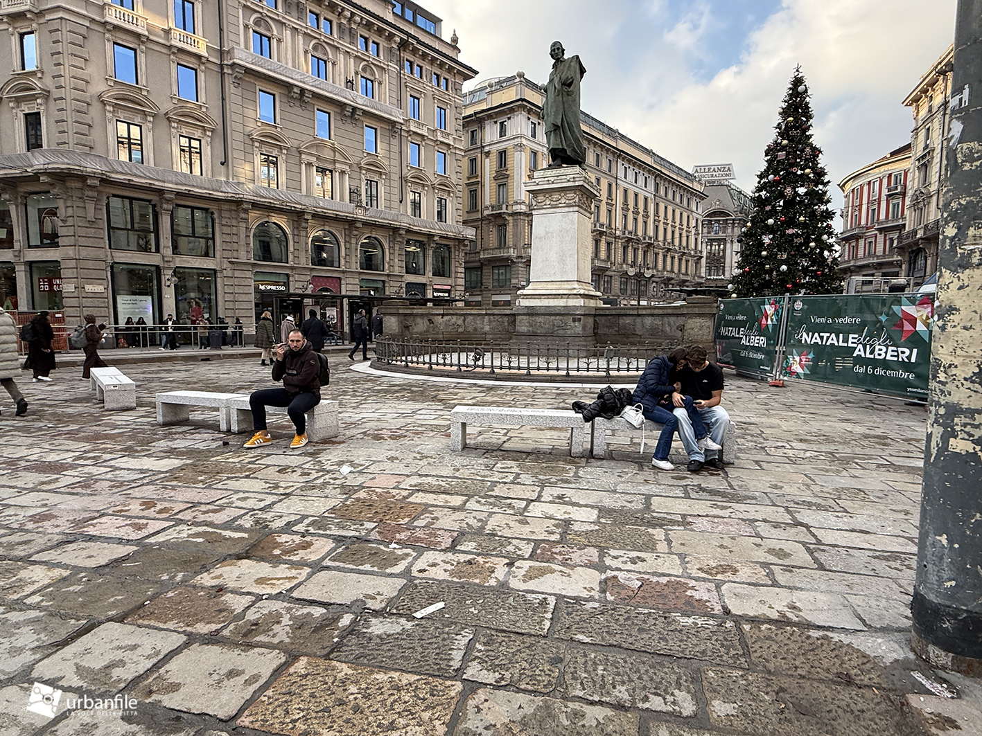 In piazza sono finalmente arrivate anche le panchine: 28 panche in granito, quattro delle quali riportano incisioni letterarie. Davanti alla statua di Parini si legge: «Chi de la gloria è vago sol di virtù sia pago». Poco più in là Manzoni ricorda: «Al Cordusio s’era posto l’assedio a un forno». Grossi scrive: «L’onore della sua dolce Milano andava innanzi a ogni cosa», mentre Verri annota: «Alberigo Conte governava nell’865, di alloggio in Curia Ducis, dove è ora il Cordùs».
