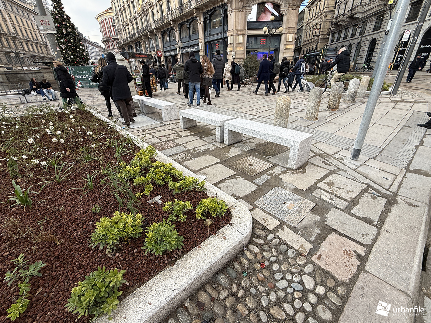 Dicembre 2025. Presentato definitivamente (dopo alcuni anni di studi e lavori – 2024) ad aprile di quest’anno e avviato subito dopo, con un cambio di direzione a lavori avviati sul verde da inserire nella piazza, il progetto di riqualificazione di piazza Cordusio si è concluso in circa sei mesi e a tempo record – non avremmo mai sperato tanto. La piazza è stata finalmente liberata dalle cesate di cantiere (mancano solo piccoli ritocchi qua e là) ed è tornata fruibile.