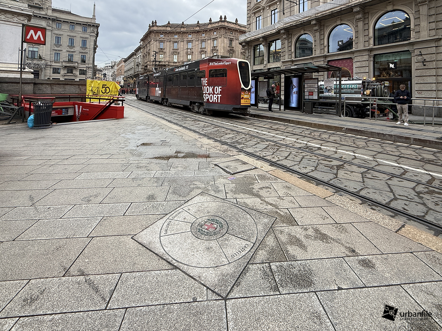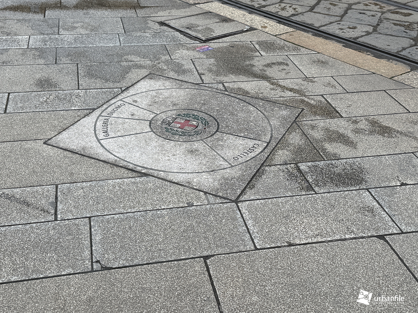 Accanto alla pensilina ATM compare infine un nuovo segno a terra, una piccola “rivelazione geometrica”: il punto esatto dal quale, ruotando su se stessi, si allineano Duomo, Castello e Galleria.