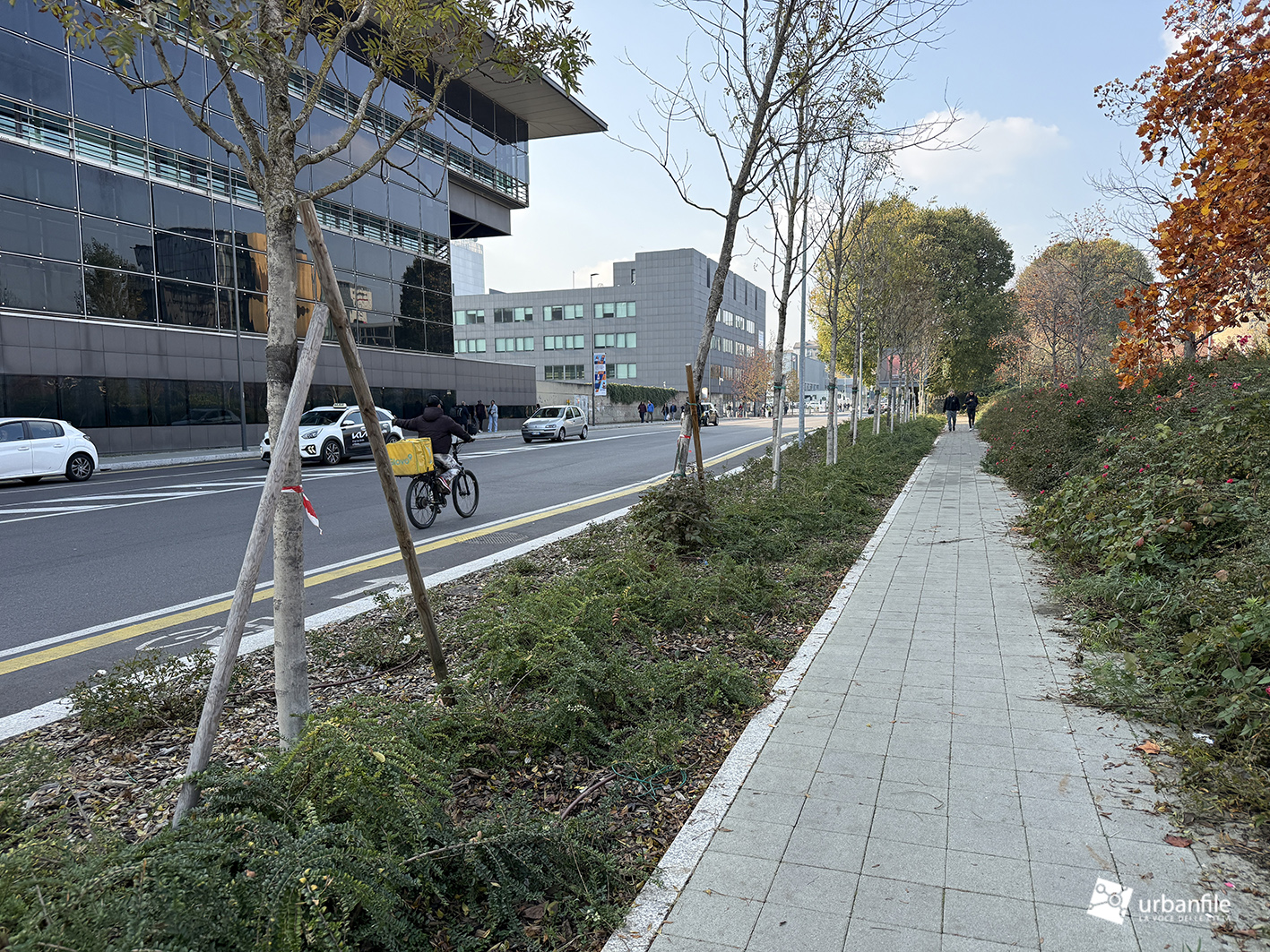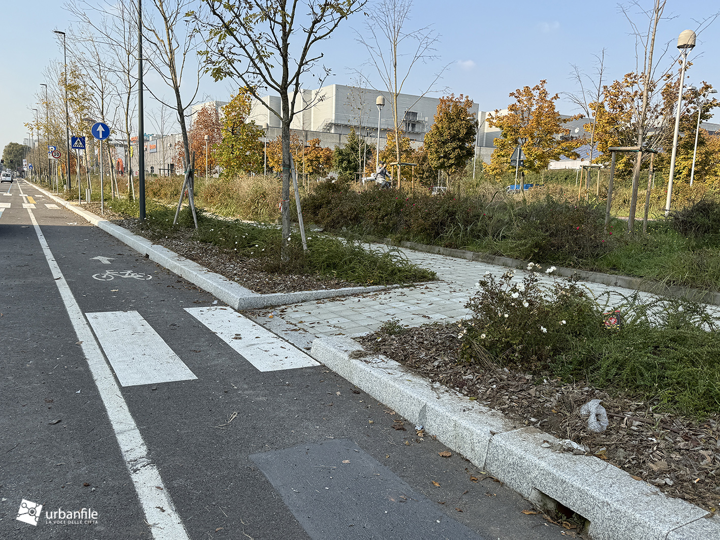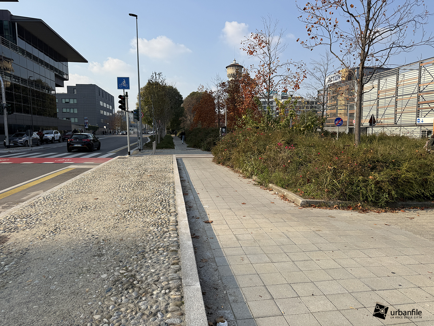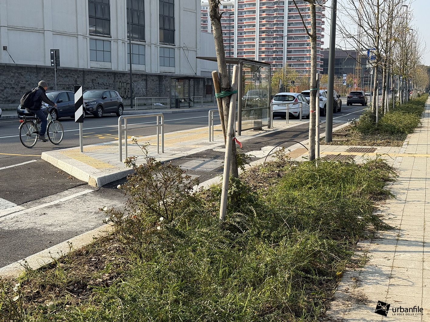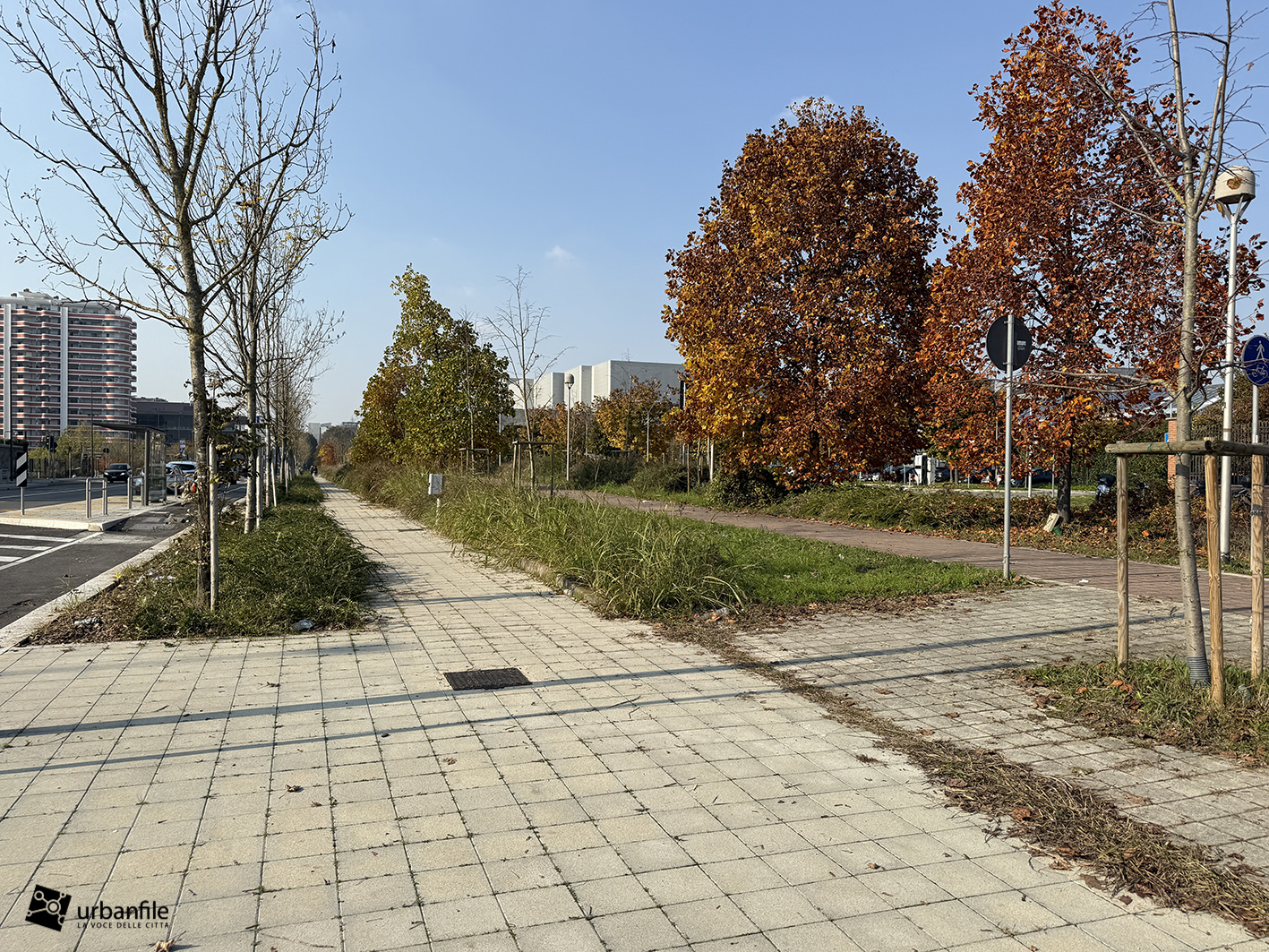 Sul lato meridionale, oltre alla ciclabile, sono stati rinnovati gli ampi marciapiedi – piastrellati, come si addice al quartiere Bicocca – e sistemate vaste aiuole con arbusti e alberi. In alcuni punti sono state realizzate anche aree di sosta con panchine, in attesa che vengano costruite le “misteriose” case previste nel comparto ancora inedificato adiacente.