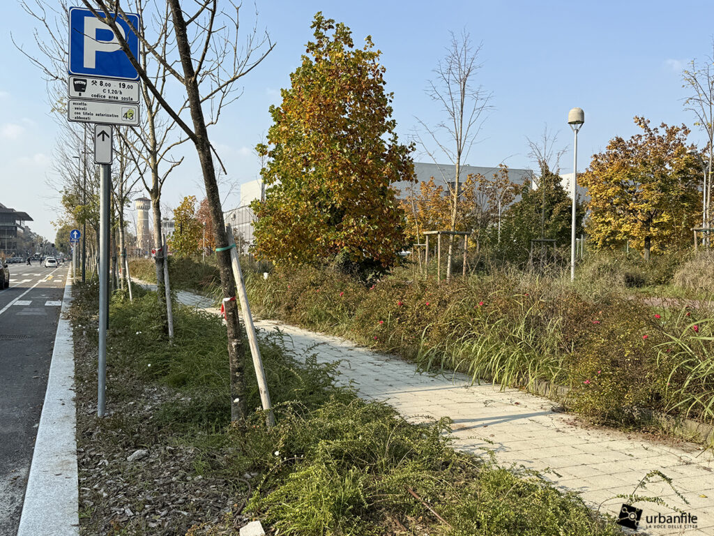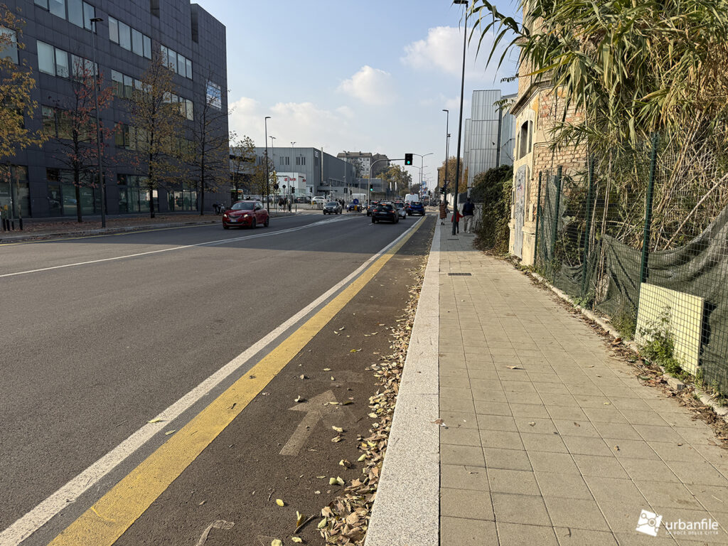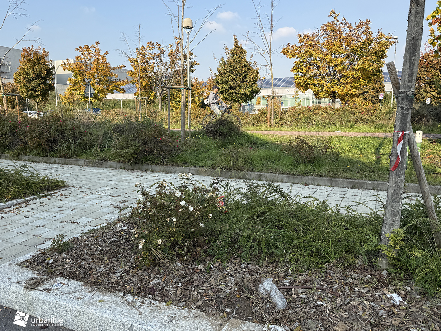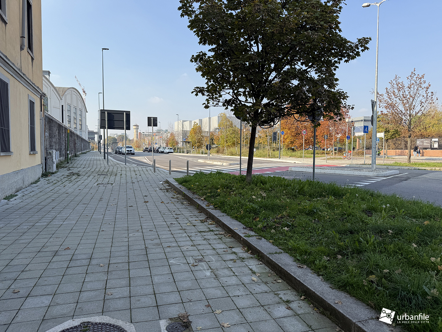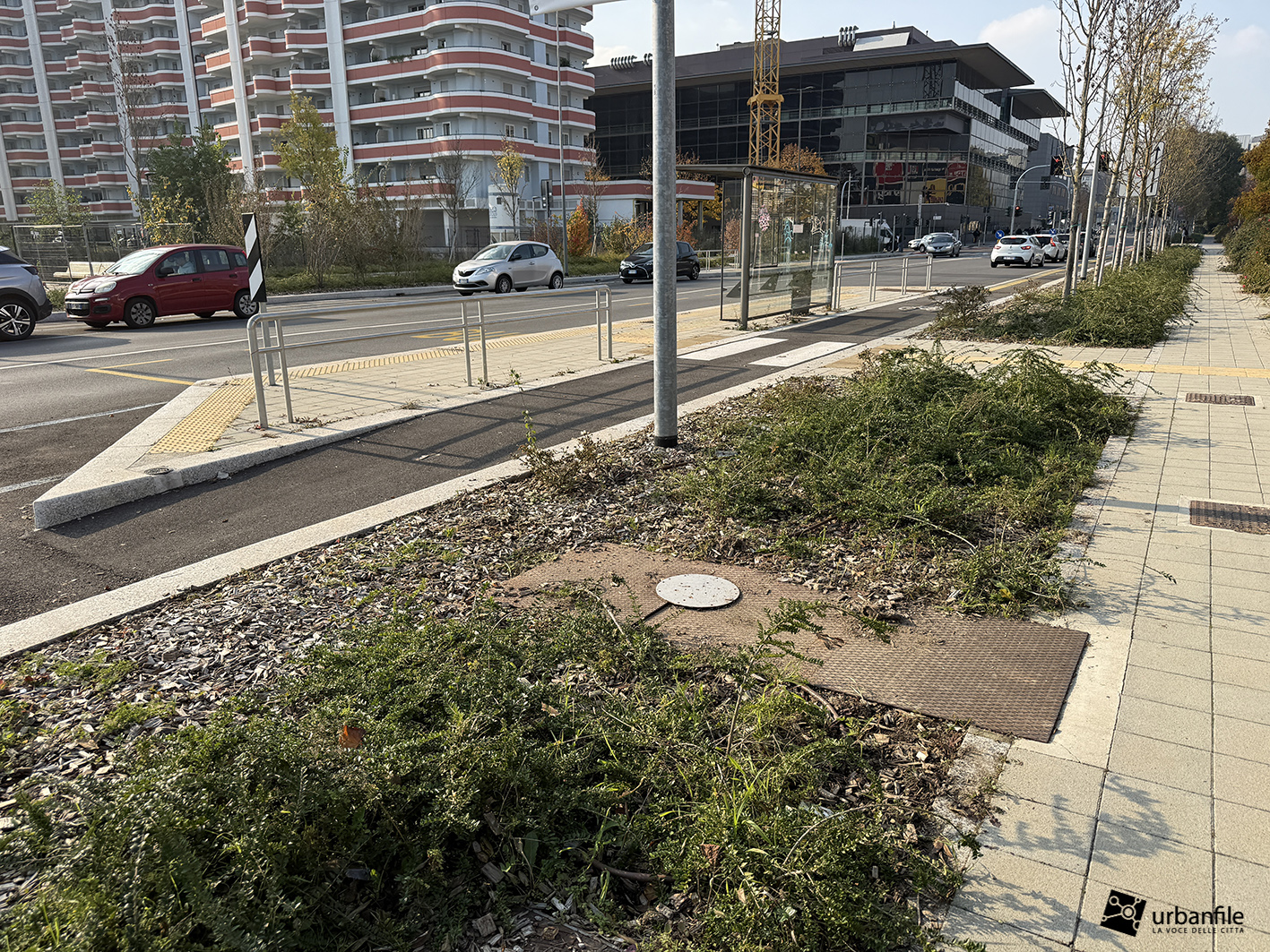 Sul lato meridionale, oltre alla ciclabile, sono stati rinnovati gli ampi marciapiedi – piastrellati, come si addice al quartiere Bicocca – e sistemate vaste aiuole con arbusti e alberi. In alcuni punti sono state realizzate anche aree di sosta con panchine, in attesa che vengano costruite le “misteriose” case previste nel comparto ancora inedificato adiacente.