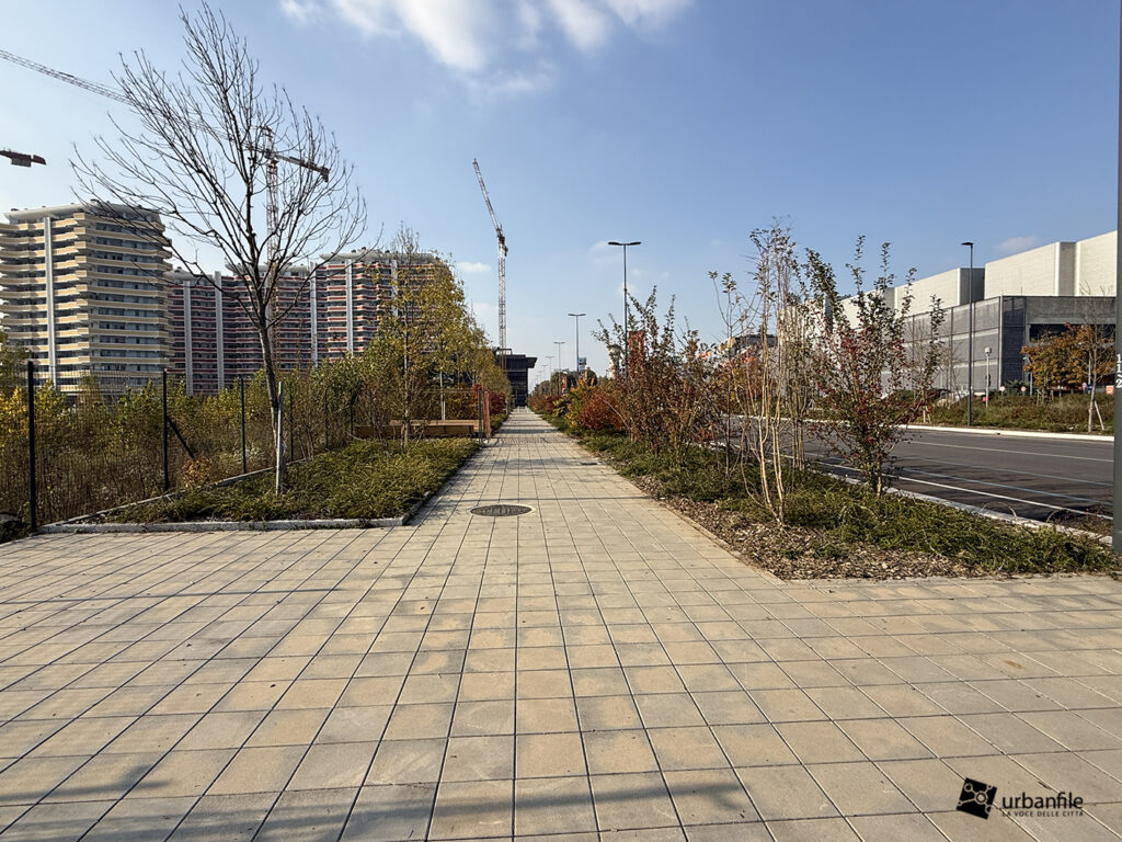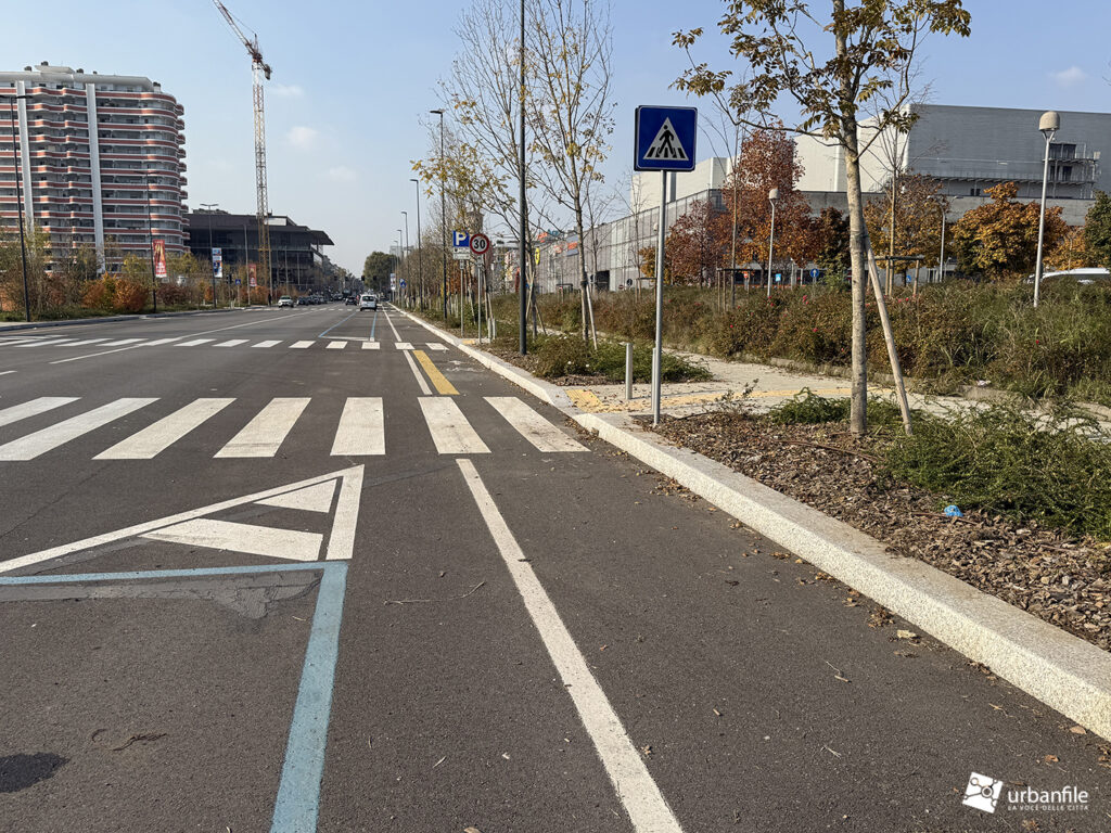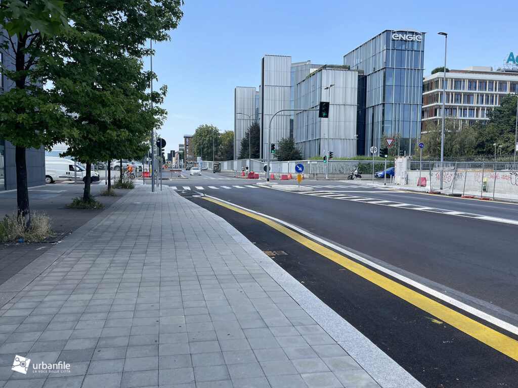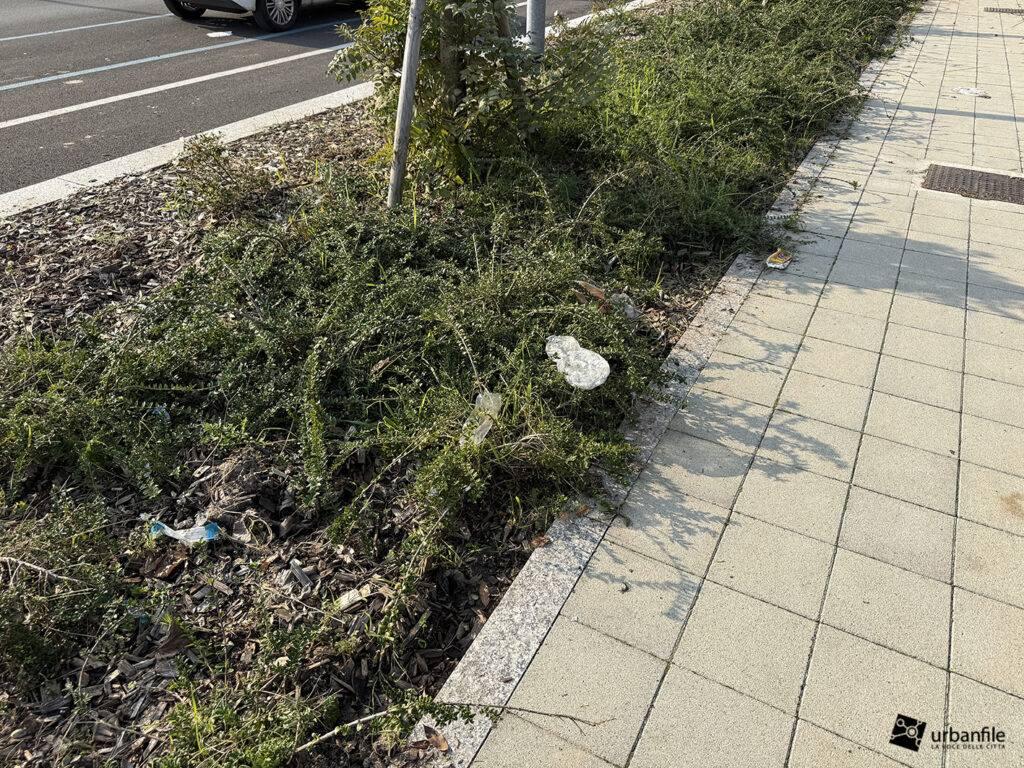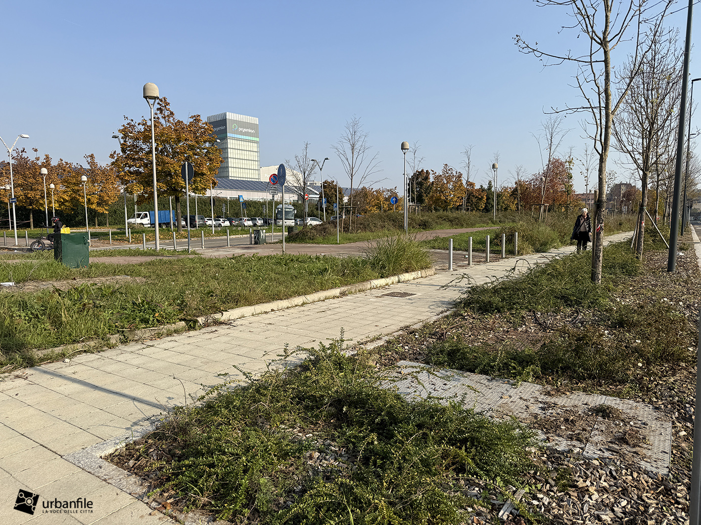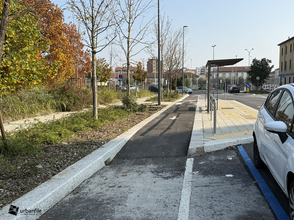 Sul lato meridionale, oltre alla ciclabile, sono stati rinnovati gli ampi marciapiedi – piastrellati, come si addice al quartiere Bicocca – e sistemate vaste aiuole con arbusti e alberi. In alcuni punti sono state realizzate anche aree di sosta con panchine, in attesa che vengano costruite le “misteriose” case previste nel comparto ancora inedificato adiacente.
