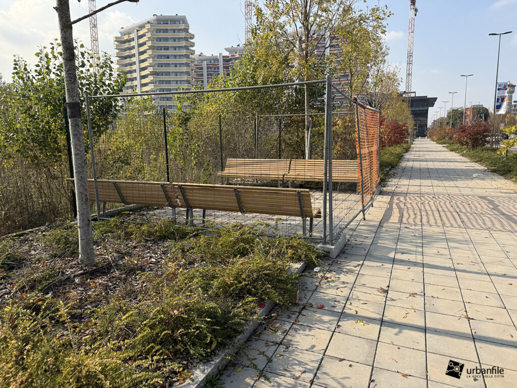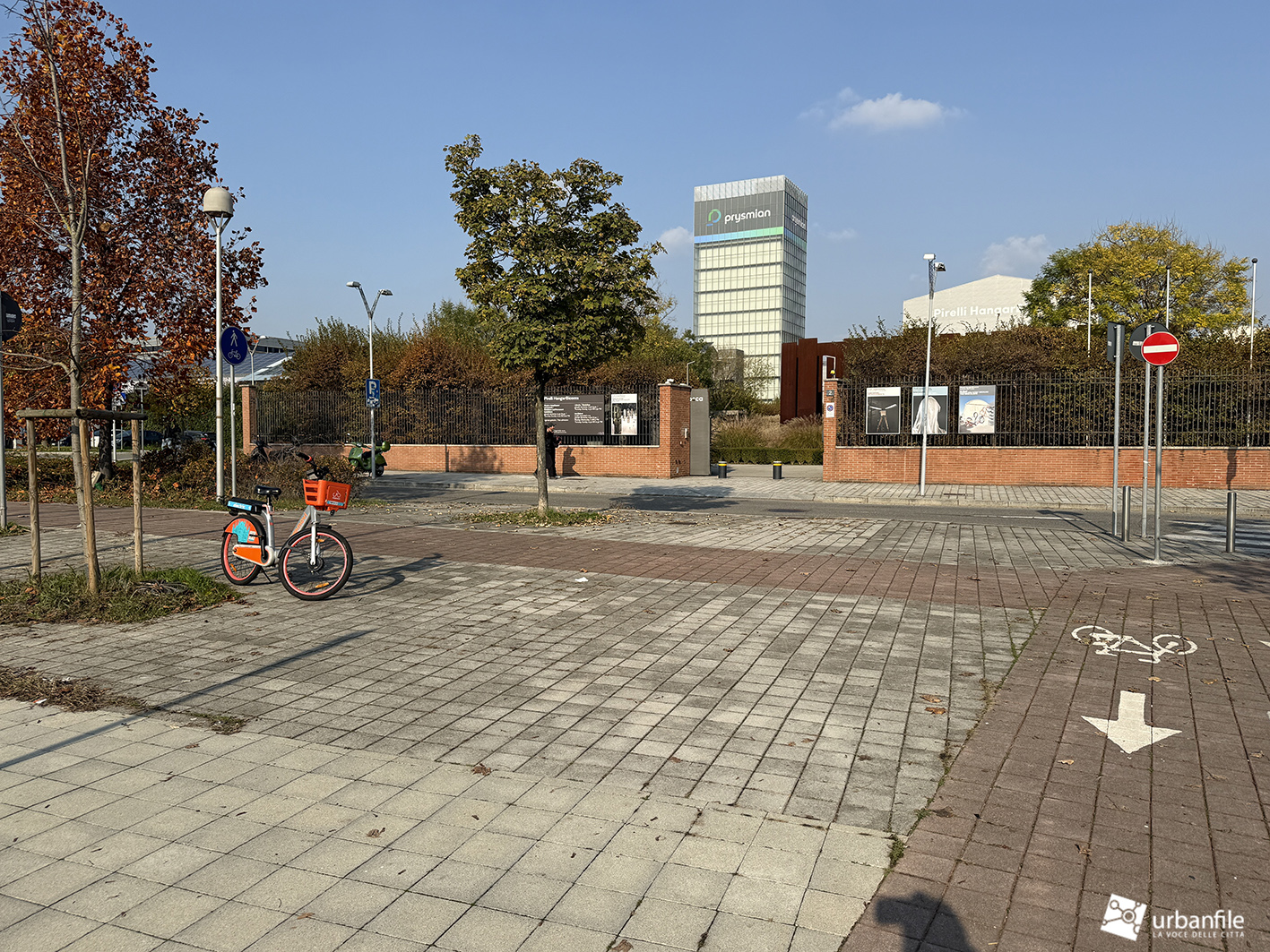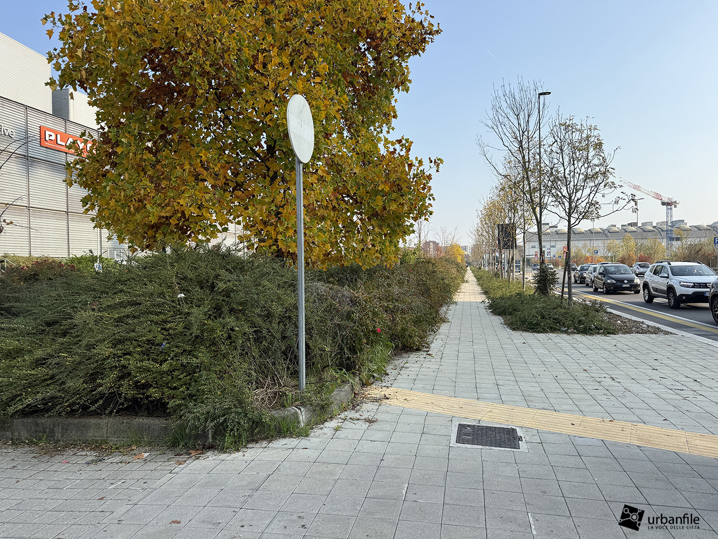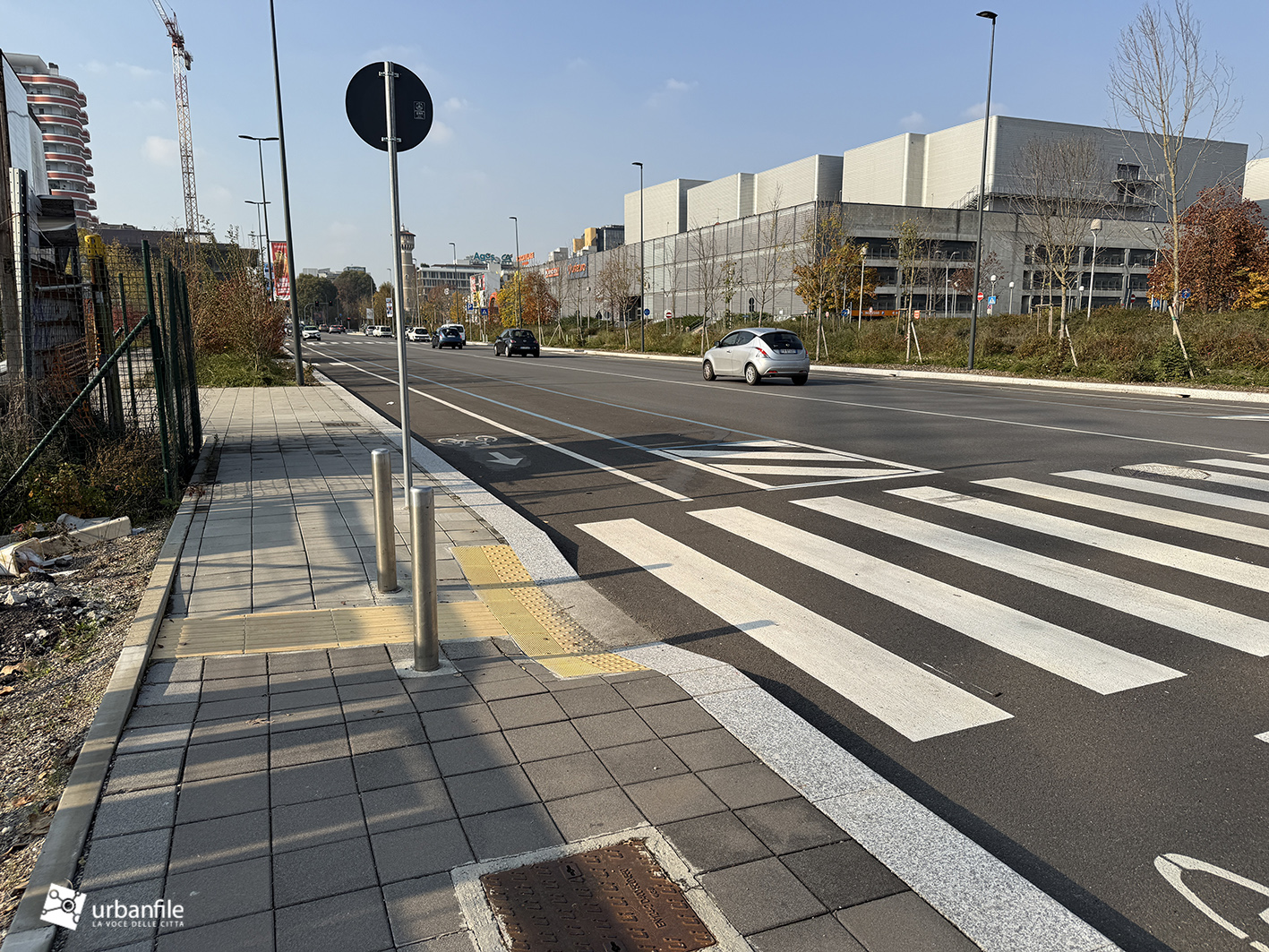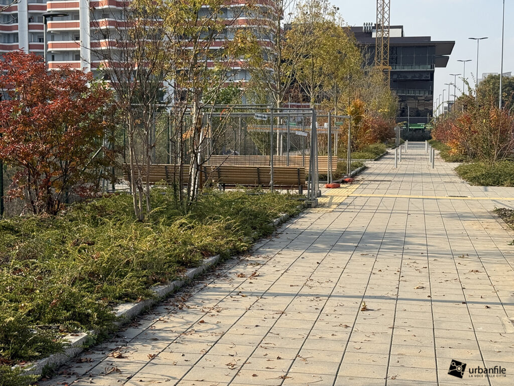 Sul lato meridionale, oltre alla ciclabile, sono stati rinnovati gli ampi marciapiedi – piastrellati, come si addice al quartiere Bicocca – e sistemate vaste aiuole con arbusti e alberi. In alcuni punti sono state realizzate anche aree di sosta con panchine, in attesa che vengano costruite le “misteriose” case previste nel comparto ancora inedificato adiacente.