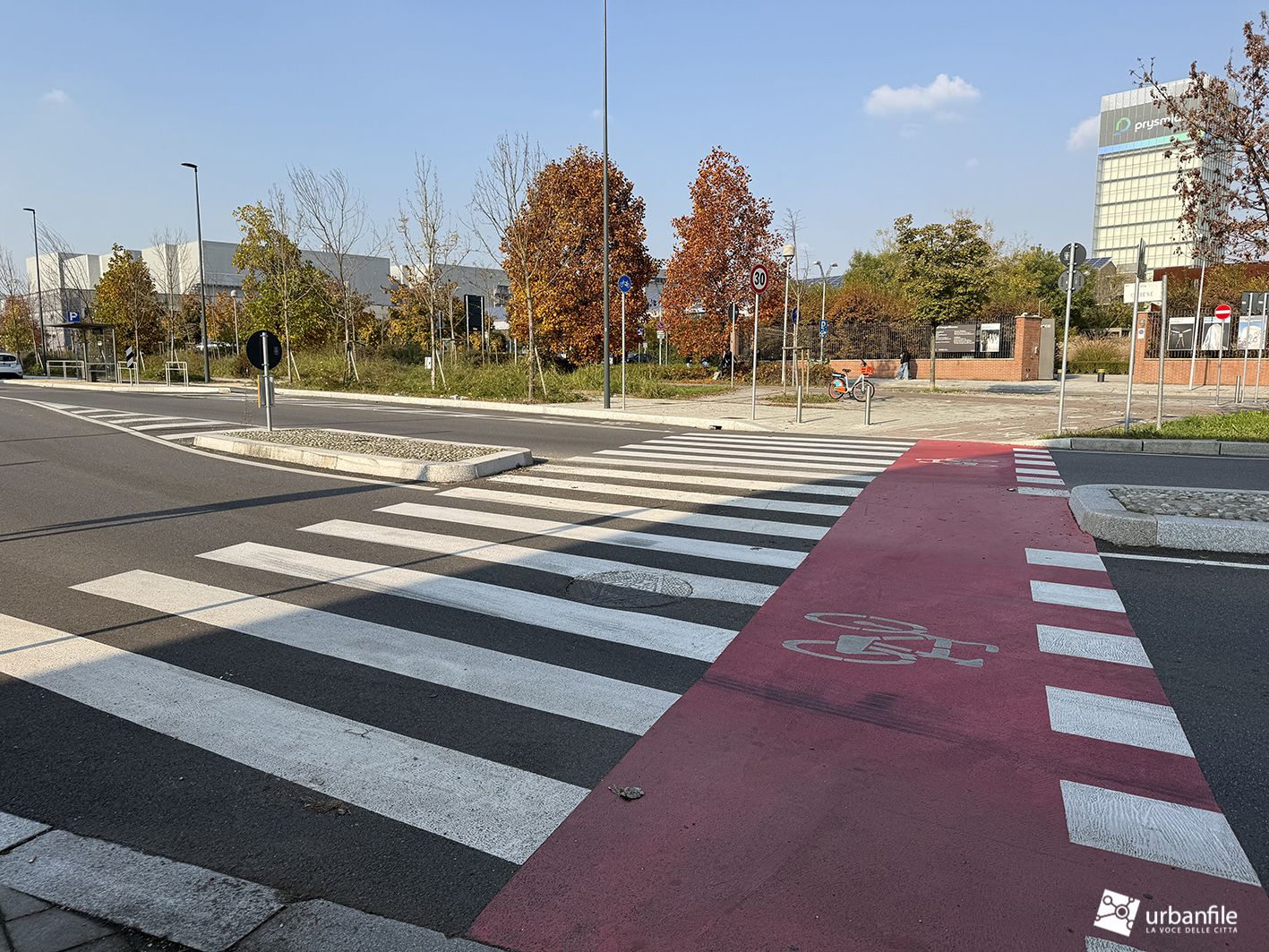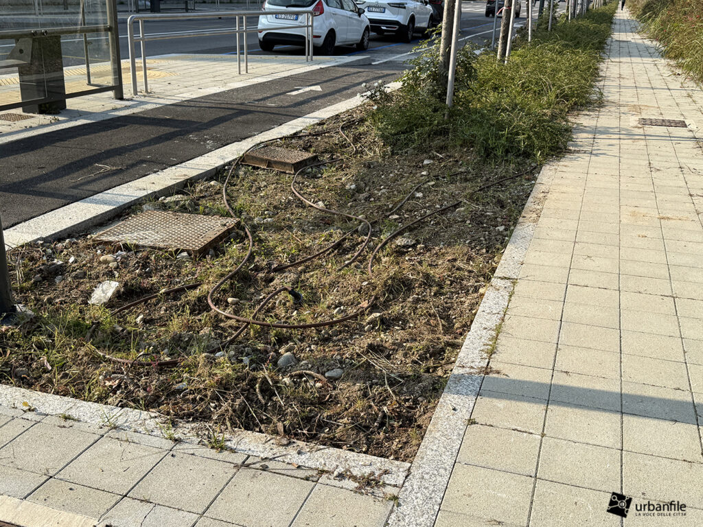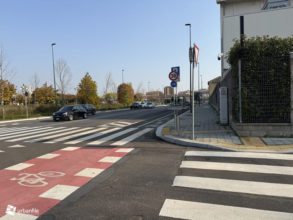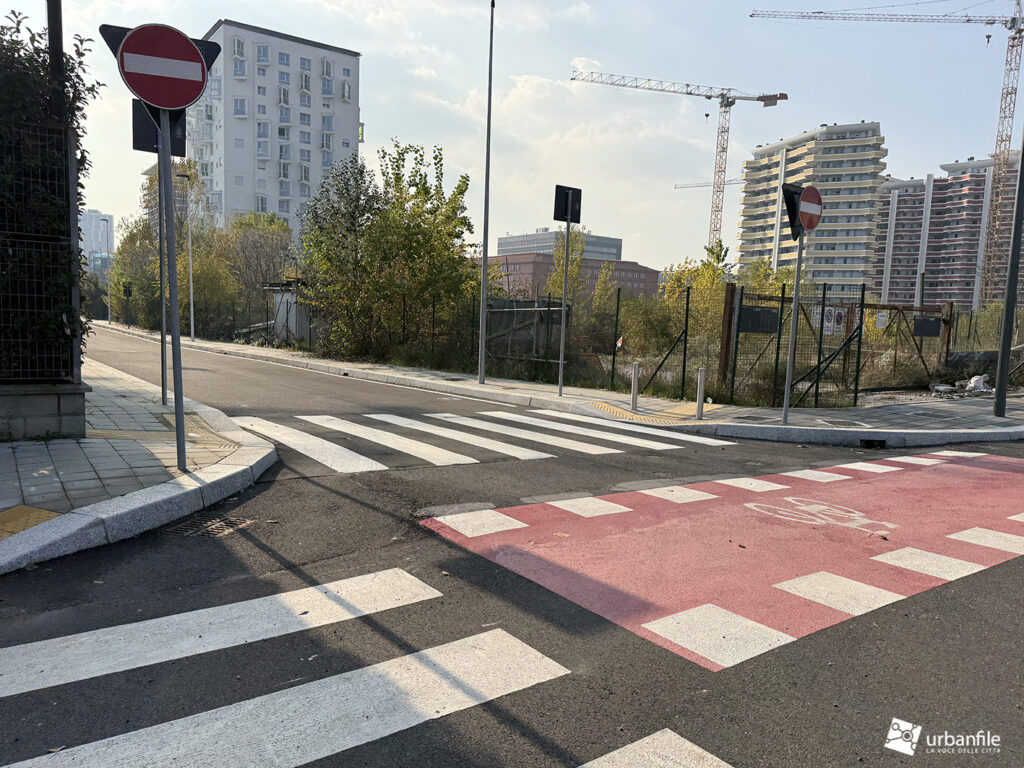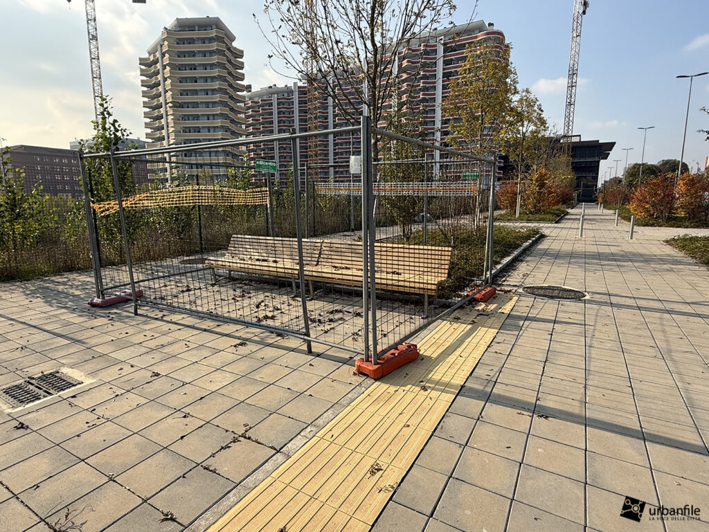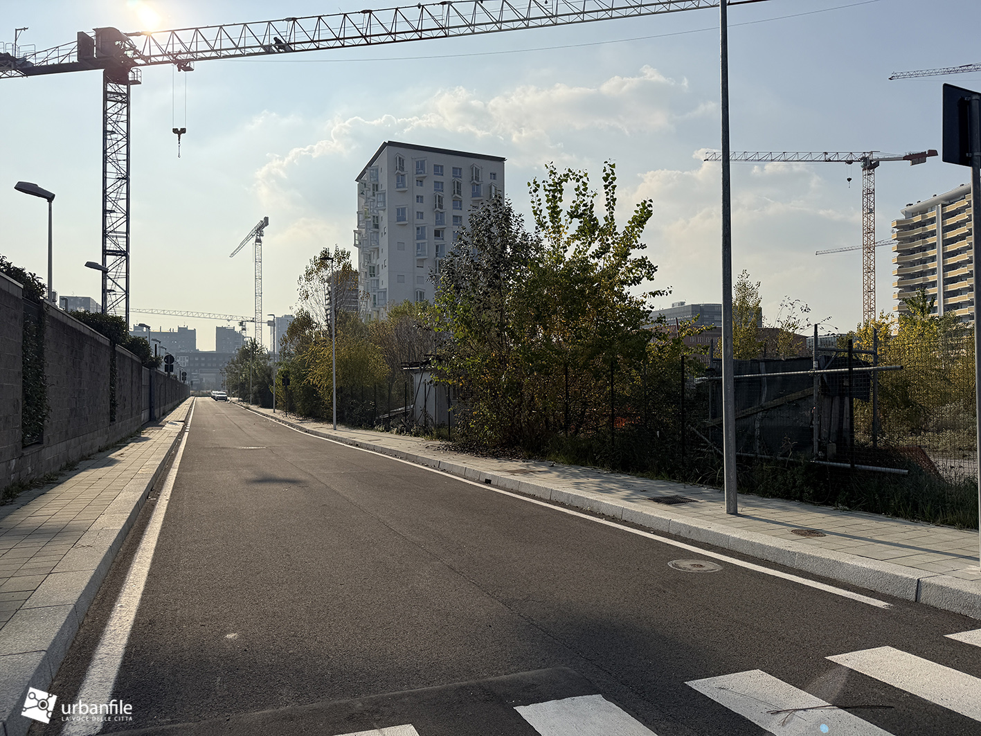 Sul lato meridionale, oltre alla ciclabile, sono stati rinnovati gli ampi marciapiedi – piastrellati, come si addice al quartiere Bicocca – e sistemate vaste aiuole con arbusti e alberi. In alcuni punti sono state realizzate anche aree di sosta con panchine, in attesa che vengano costruite le “misteriose” case previste nel comparto ancora inedificato adiacente.