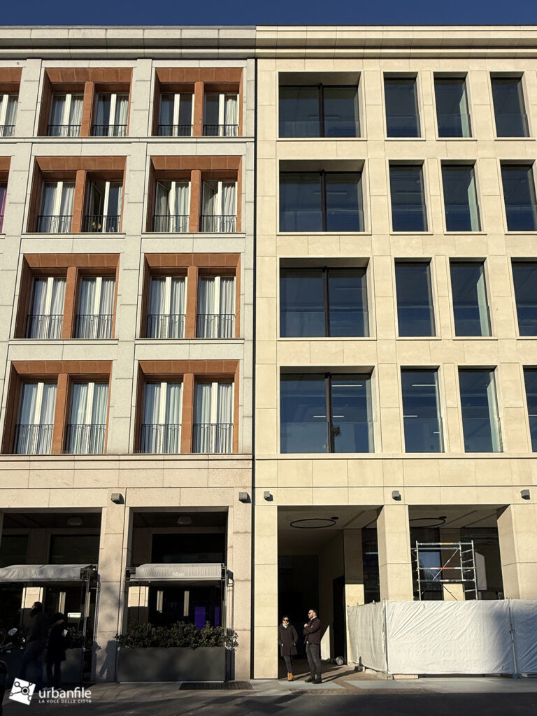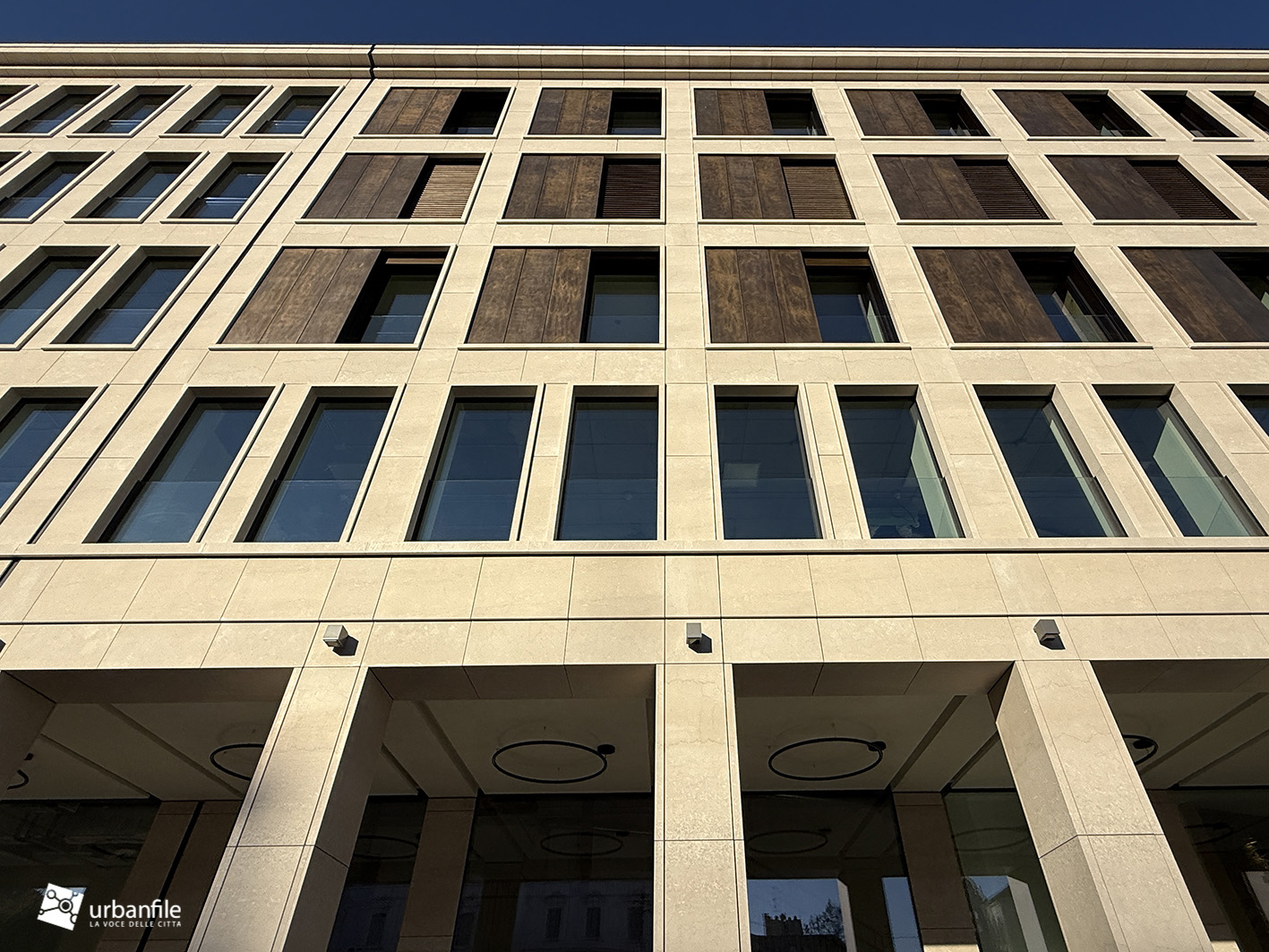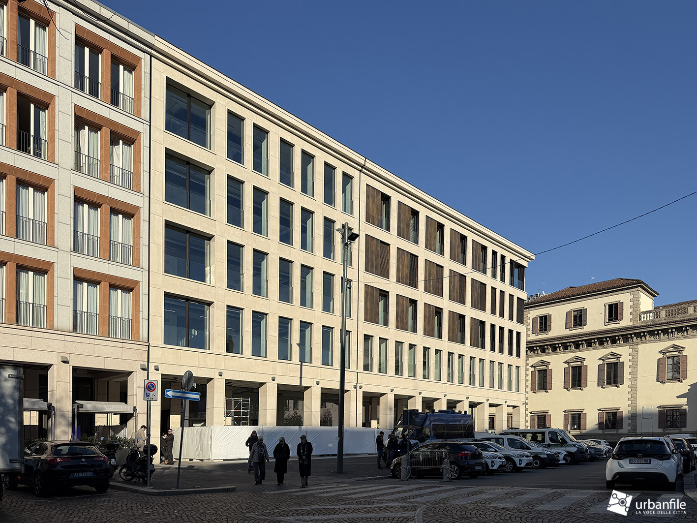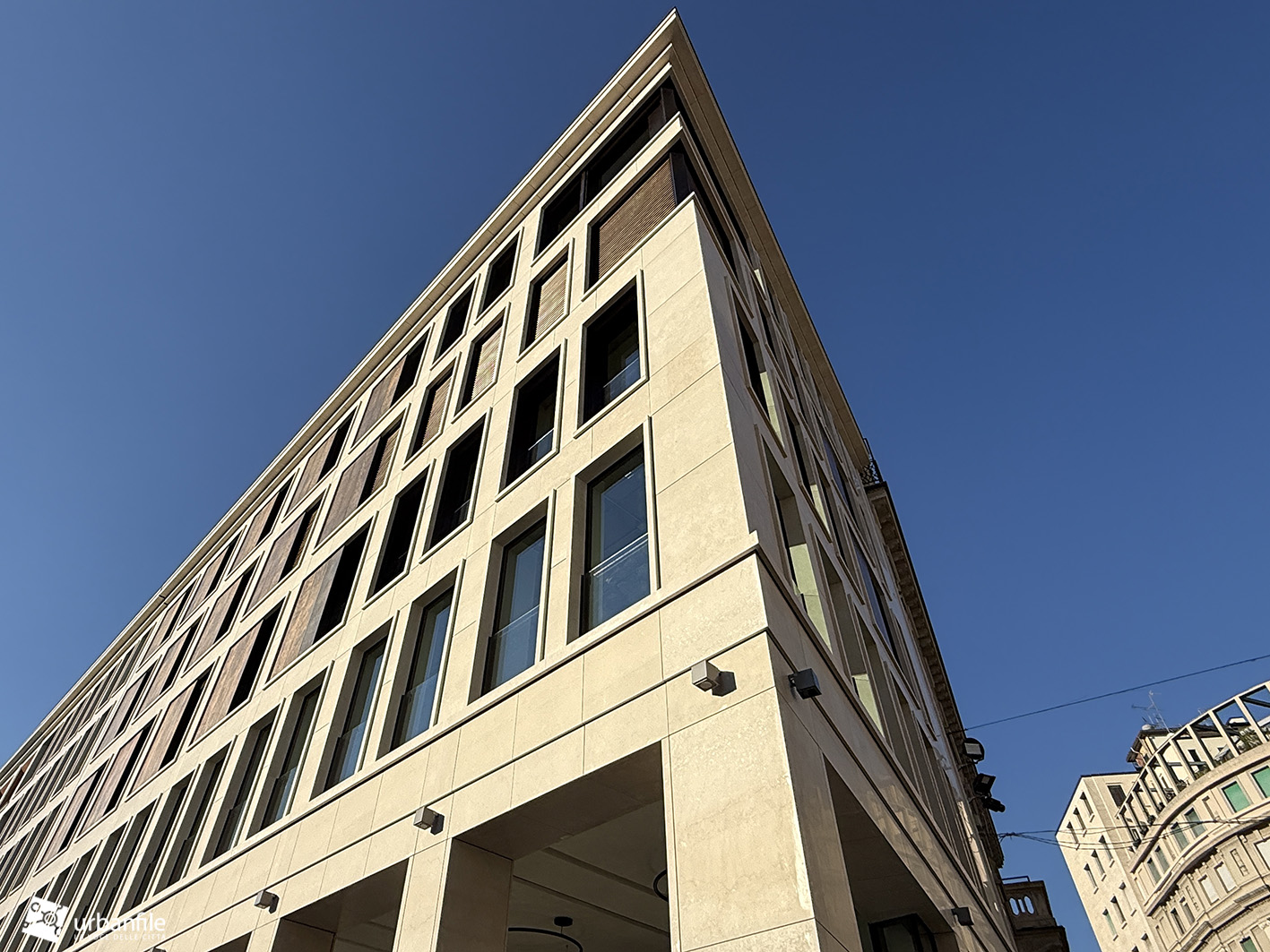 Si tratta di un edificio porticato che riprende e completa le forme progettate già nel 2000 dallo studio Arassociati per ricostruire la quinta interrotta negli anni Cinquanta. Il progetto era stato realizzato solo in parte con il completamento, nel 2009, dell’Hotel Rosa Grand, mentre il lato verso piazza Beccaria era rimasto irrisolto.