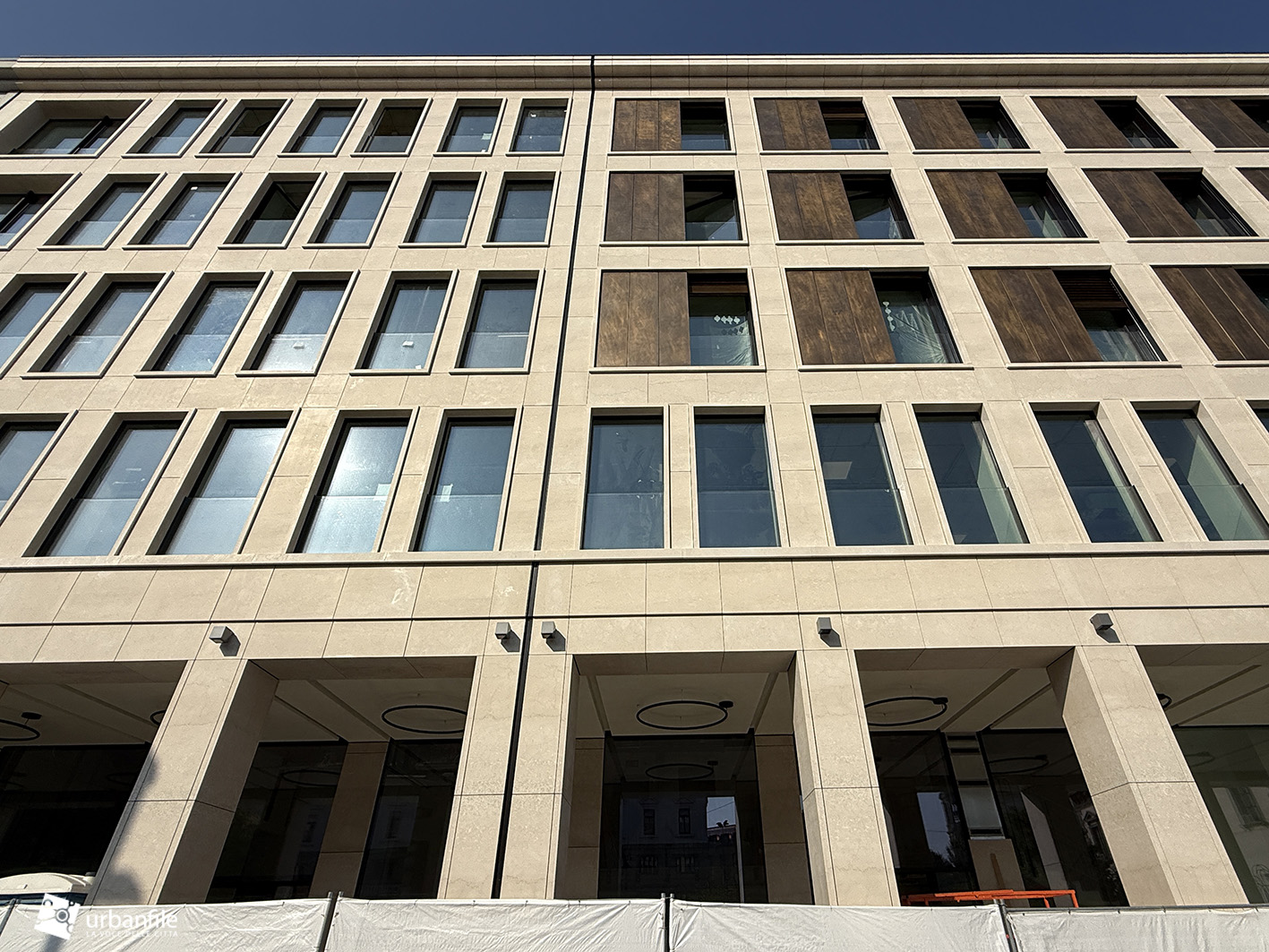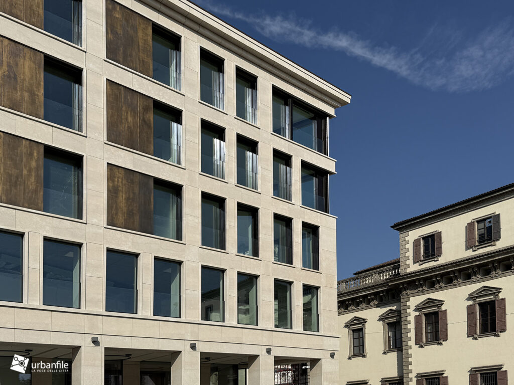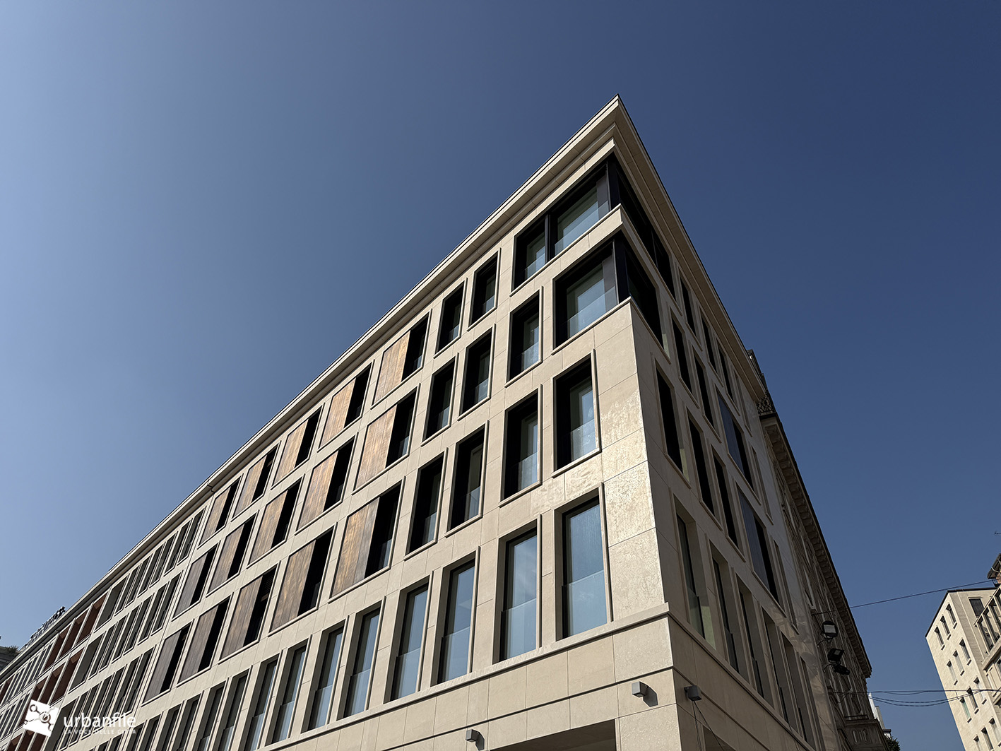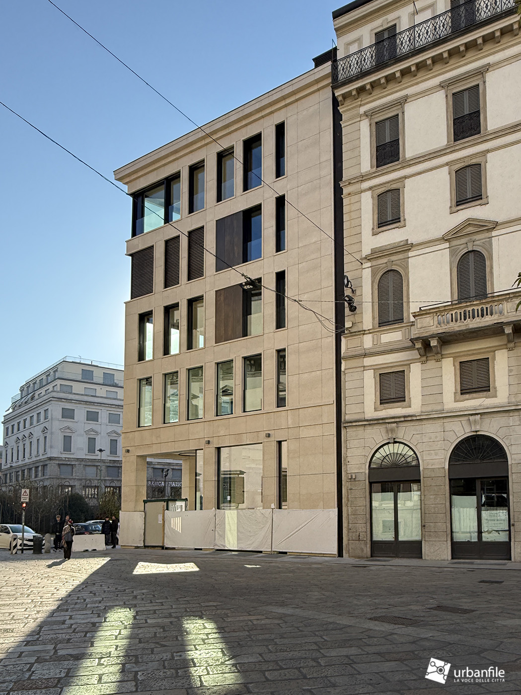 Si tratta di un edificio porticato che riprende e completa le forme progettate già nel 2000 dallo studio Arassociati per ricostruire la quinta interrotta negli anni Cinquanta. Il progetto era stato realizzato solo in parte con il completamento, nel 2009, dell’Hotel Rosa Grand, mentre il lato verso piazza Beccaria era rimasto irrisolto.