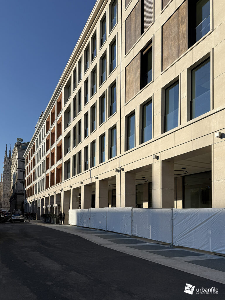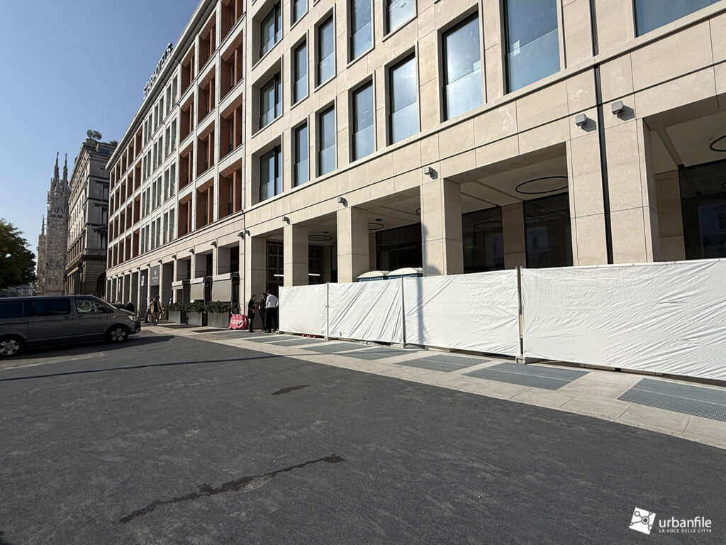 Un tempo, qui sorgeva l’Albergo Commercio di piazza Fontana, danneggiato dalla guerra e rimasto in stato di abbandono fino alla sua occupazione da parte degli studenti nel 1968. Nell’agosto del 1969, la polizia sgomberò l’edificio, che venne poi demolito. Da allora, quest’area dietro il Duomo è rimasta in degrado e abbandono sino alla costruzione dell’Hotel, ora affiancato finalmente dal nuovo edificio.