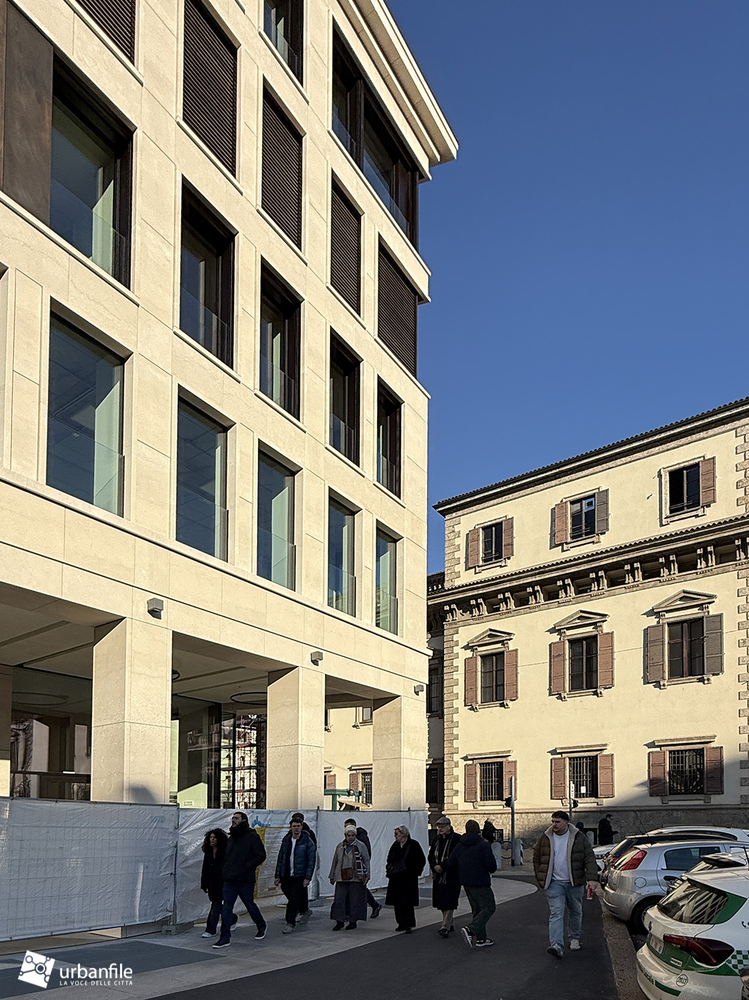 Dicembre 2025. Ormai il cantiere per la costruzione del nuovo edificio in piazza Fontana, destinato a completare la “quinta” sul lato settentrionale della piazza, rimasta incompleta per oltre 70 anni, è giunto a conclusione o quasi.