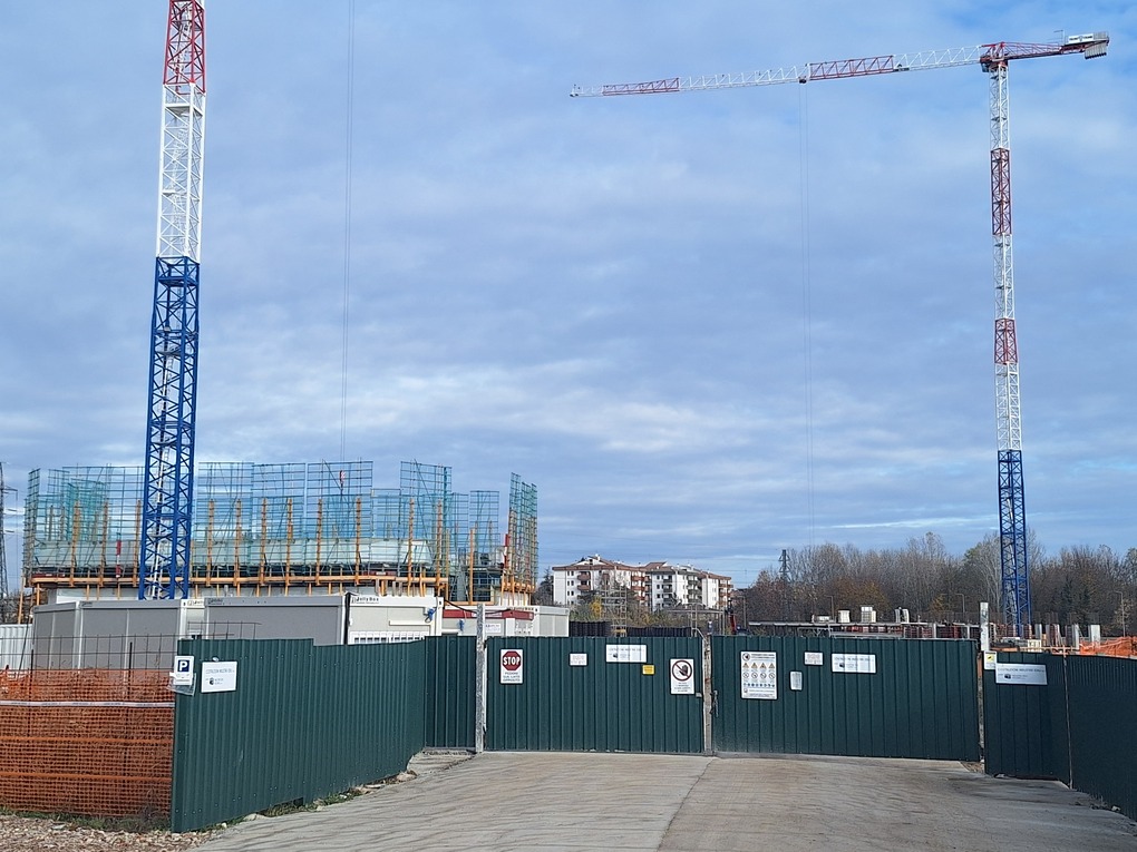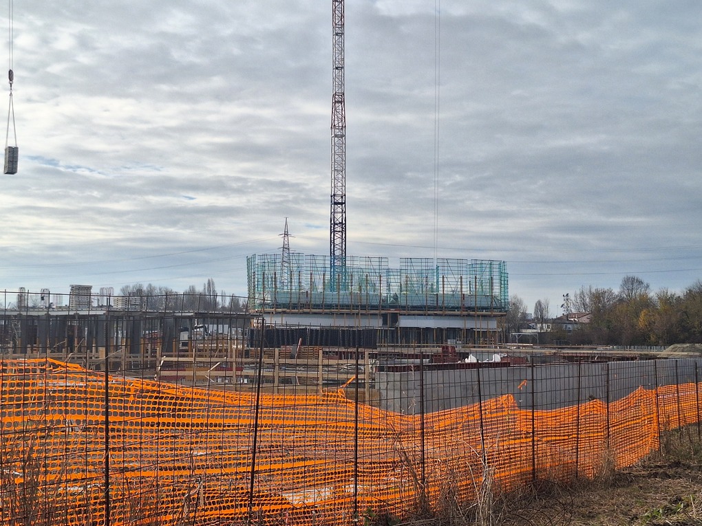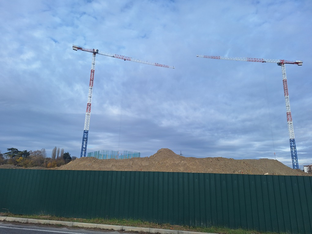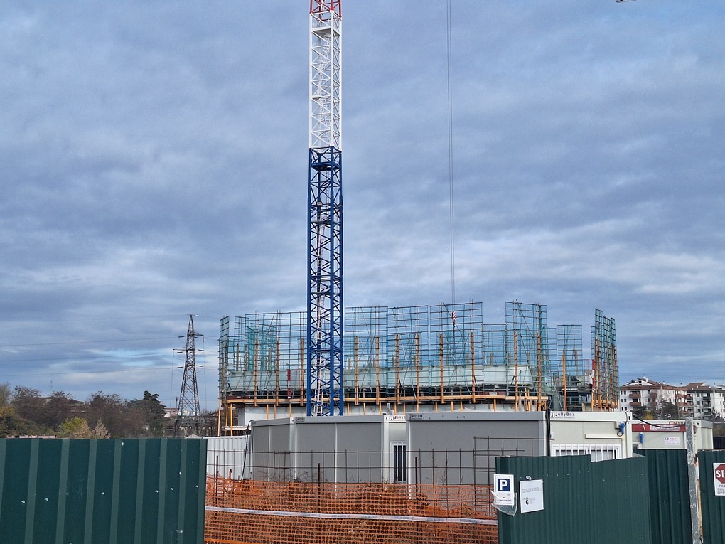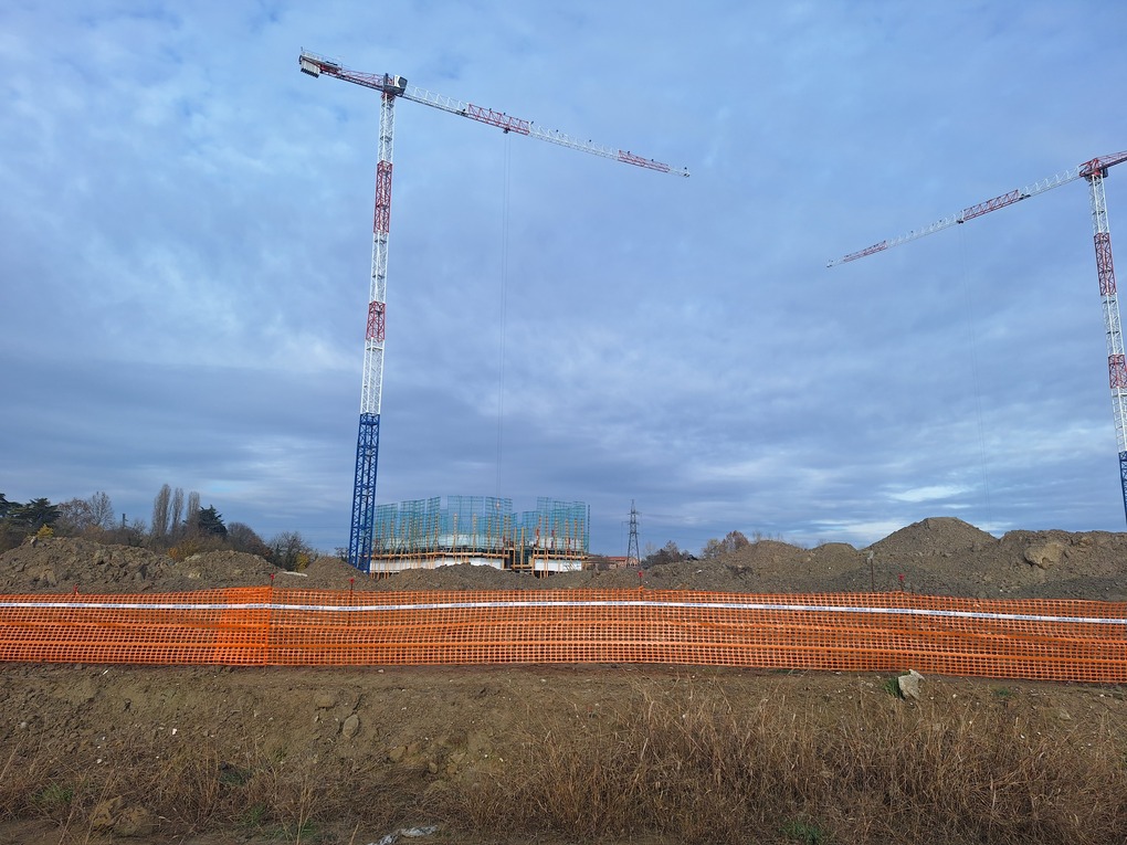 Dopo l’installazione delle due grandi gru edili brandeggianti, sono finalmente in corso i lavori per le prime due torri. Entrambe hanno già la struttura portante fuori dai piani interrati. Grandi cumuli di terra sono stati accumulati lungo la recinzione a bordo strada dopo lo svuotamento del sedime destinato alle future torri.