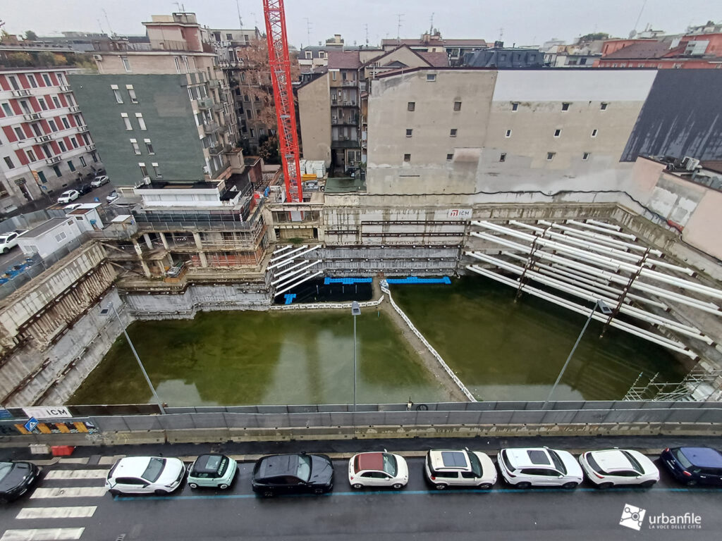 Il cantiere, dopo lo scavo e il montaggio dell’altissima gru nell’agosto 2024, è fermo completamente, senza traccia di alcun intervento, dallo scorso marzo. La falda acquifera si è presa possesso dello scavo trasformandolo in un gigantesco acquitrino a due passi dalla stazione Centrale. Non siamo riusciti a scoprire le motivazioni di questo ritardo che inizia ad essere preoccupante.