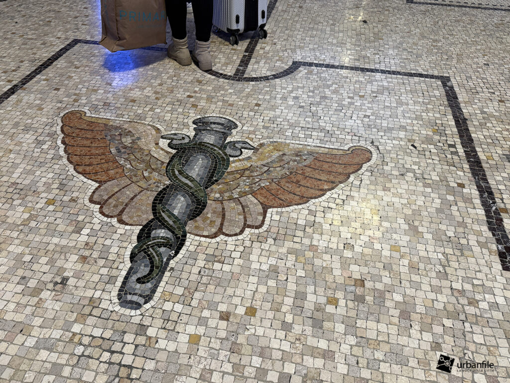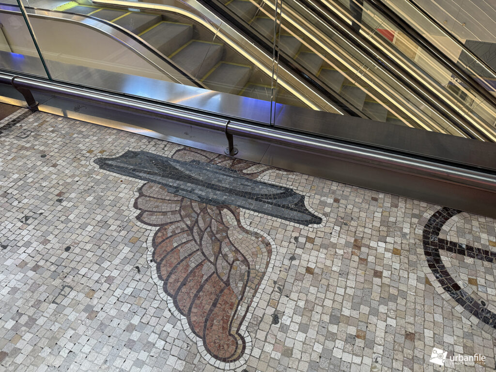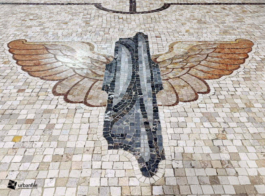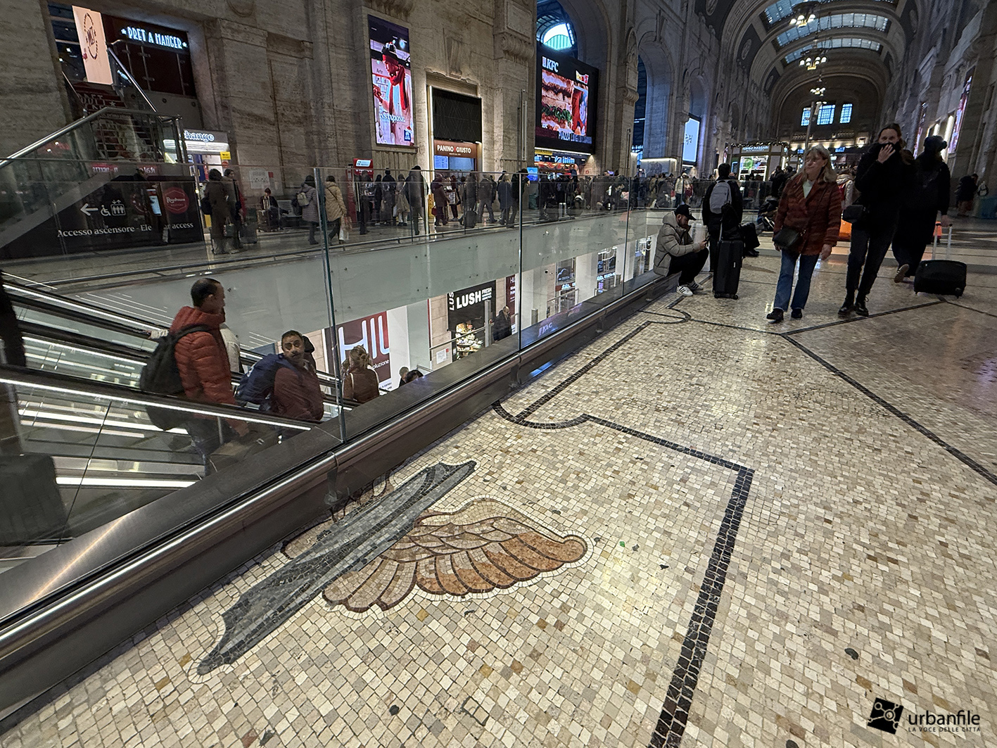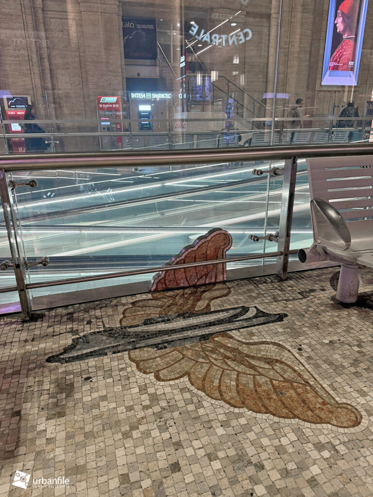 Veniamo al punto. Nel 2010-2011, quando furono praticati i tagli per l’apertura delle due “buche” destinate ai tapis roulant, i motivi principali del mosaico raffiguranti i simboli alati vennero “ricomposti” in verticale, affiancandoli alla balaustra in vetro dando una parvenza di continuità della decorazione.