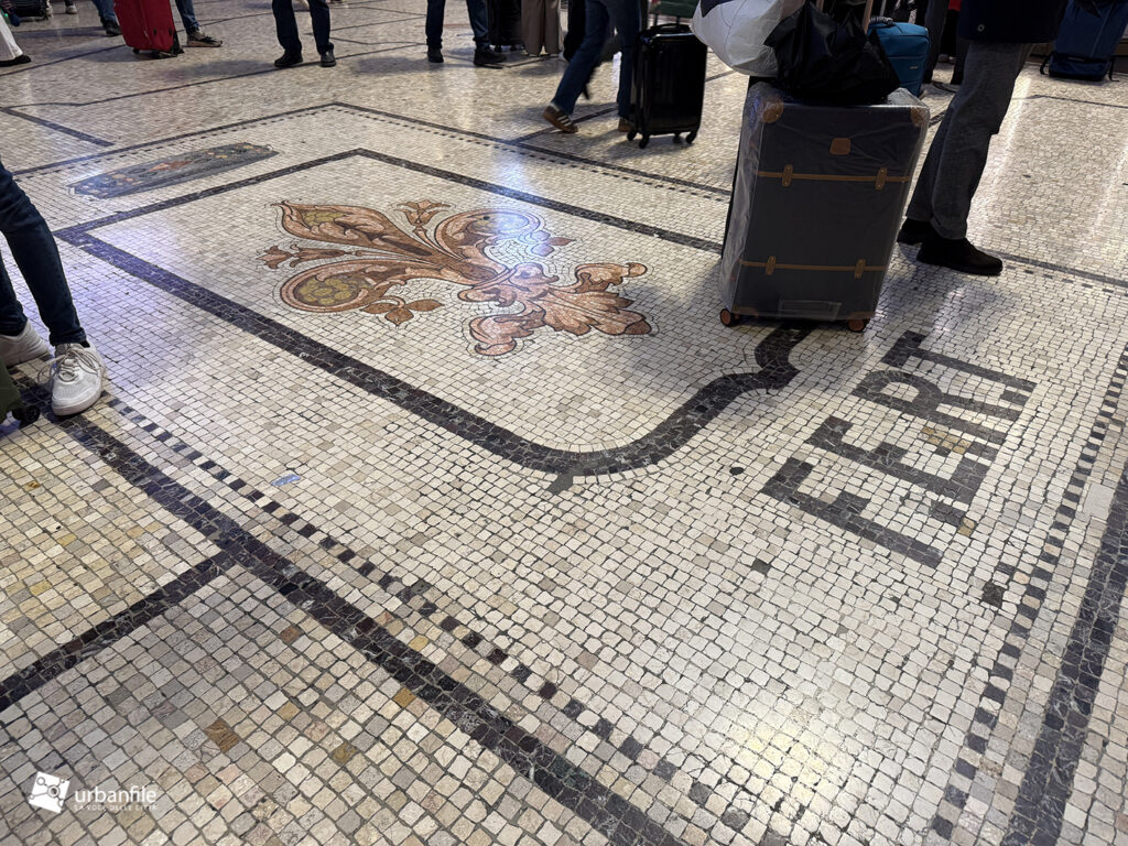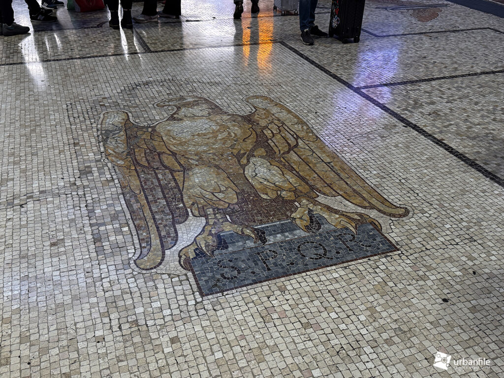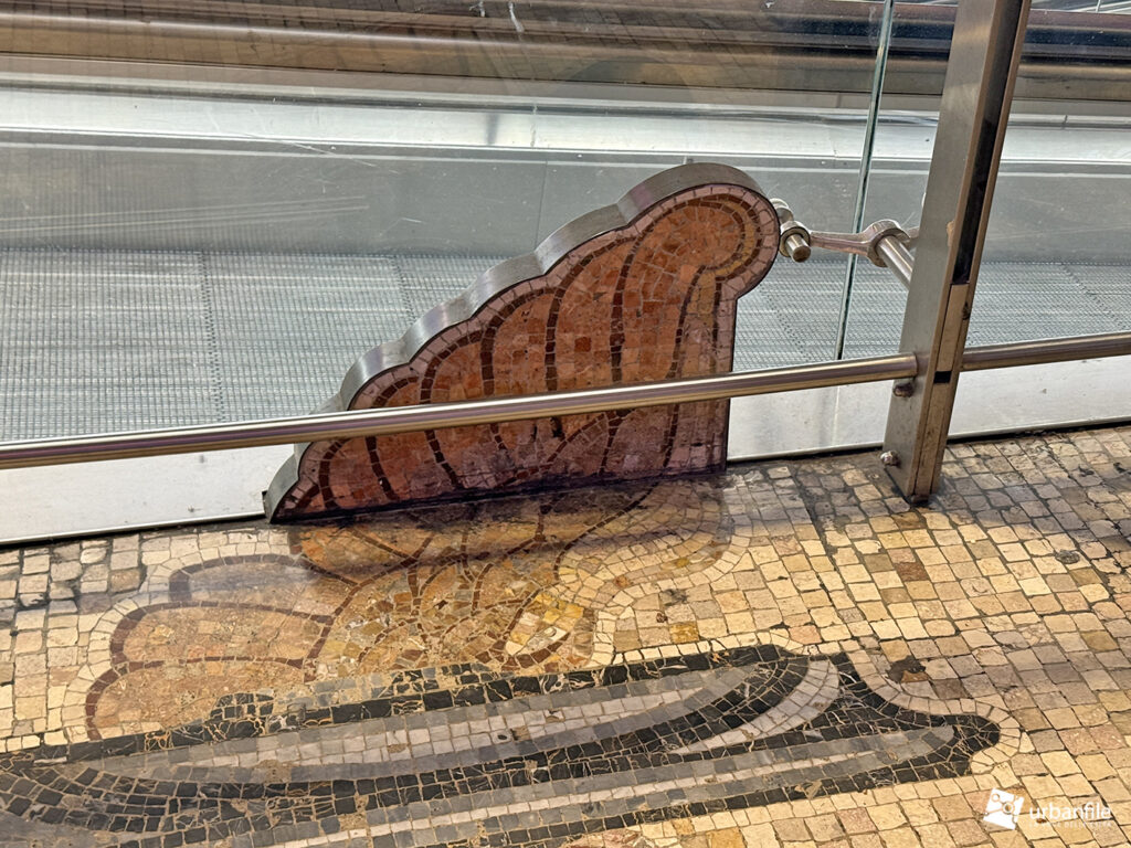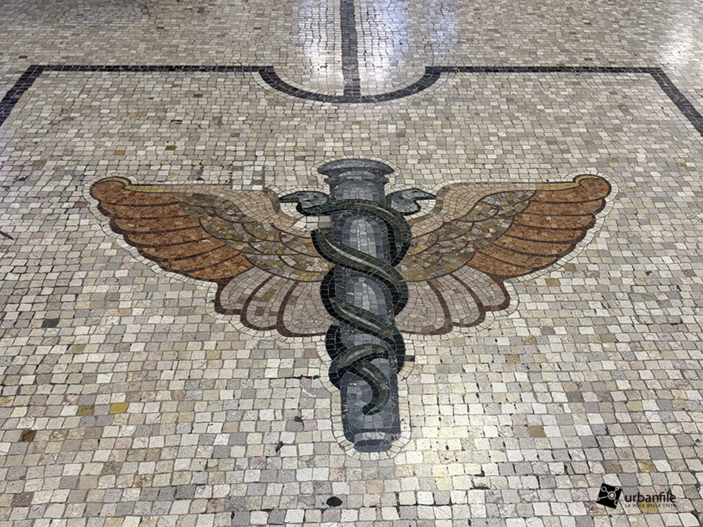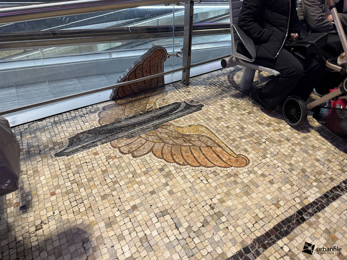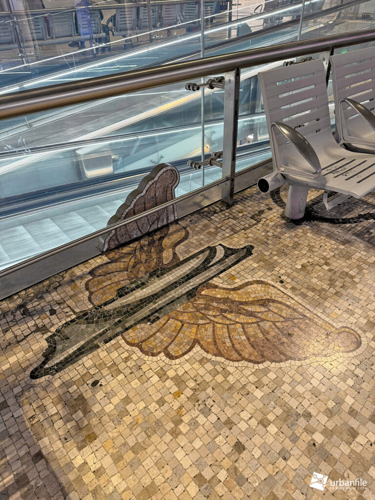 Veniamo al punto. Nel 2010-2011, quando furono praticati i tagli per l’apertura delle due “buche” destinate ai tapis roulant, i motivi principali del mosaico raffiguranti i simboli alati vennero “ricomposti” in verticale, affiancandoli alla balaustra in vetro dando una parvenza di continuità della decorazione.