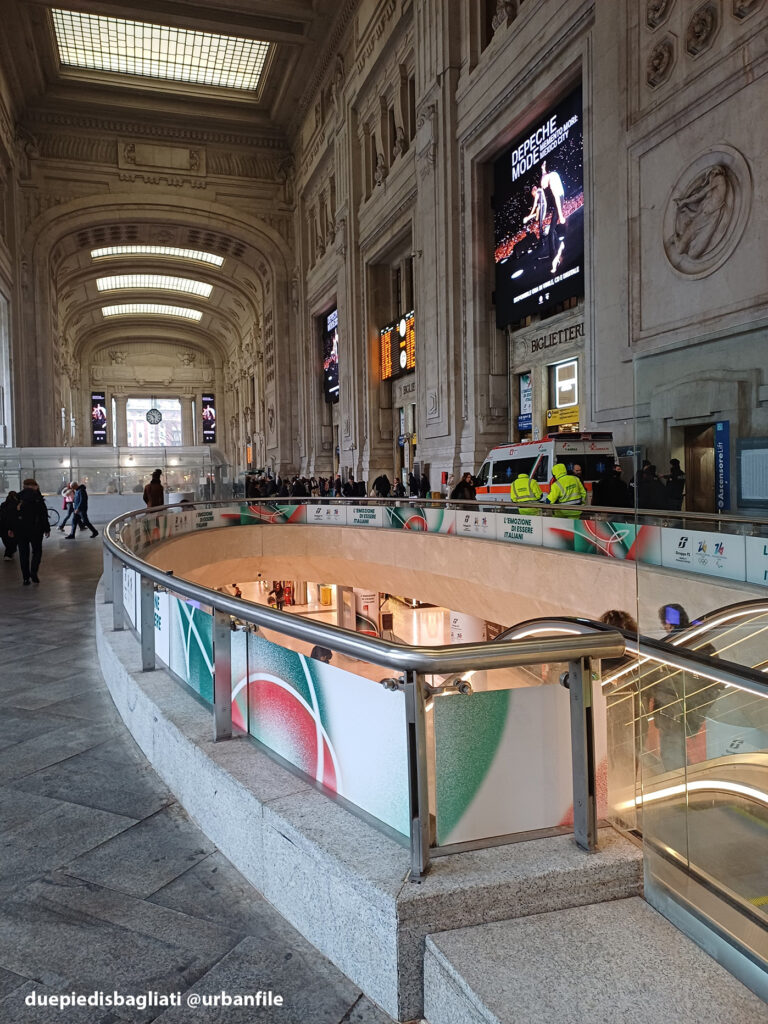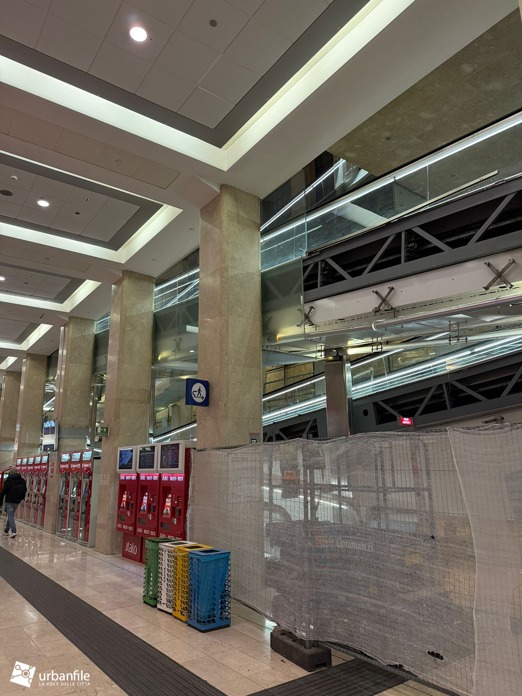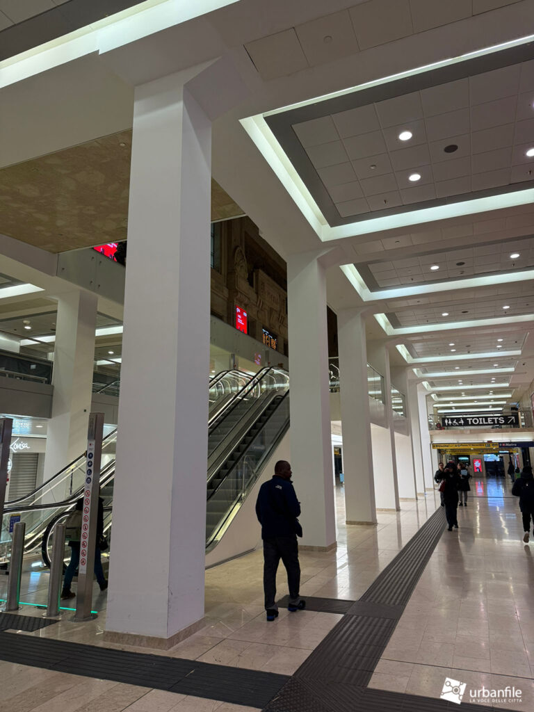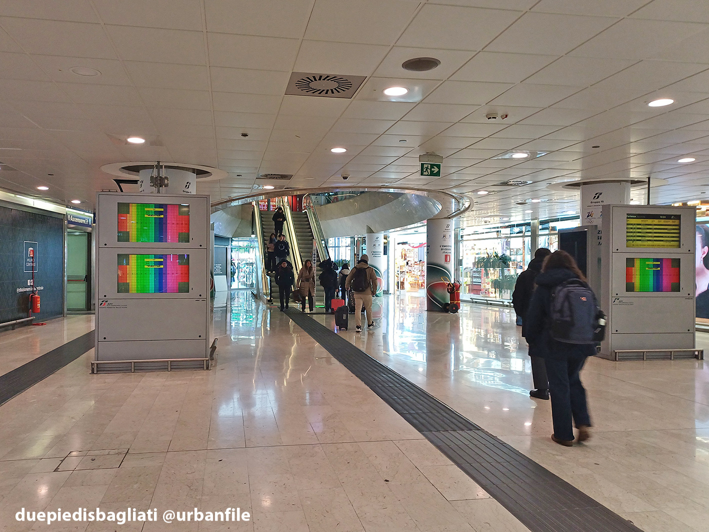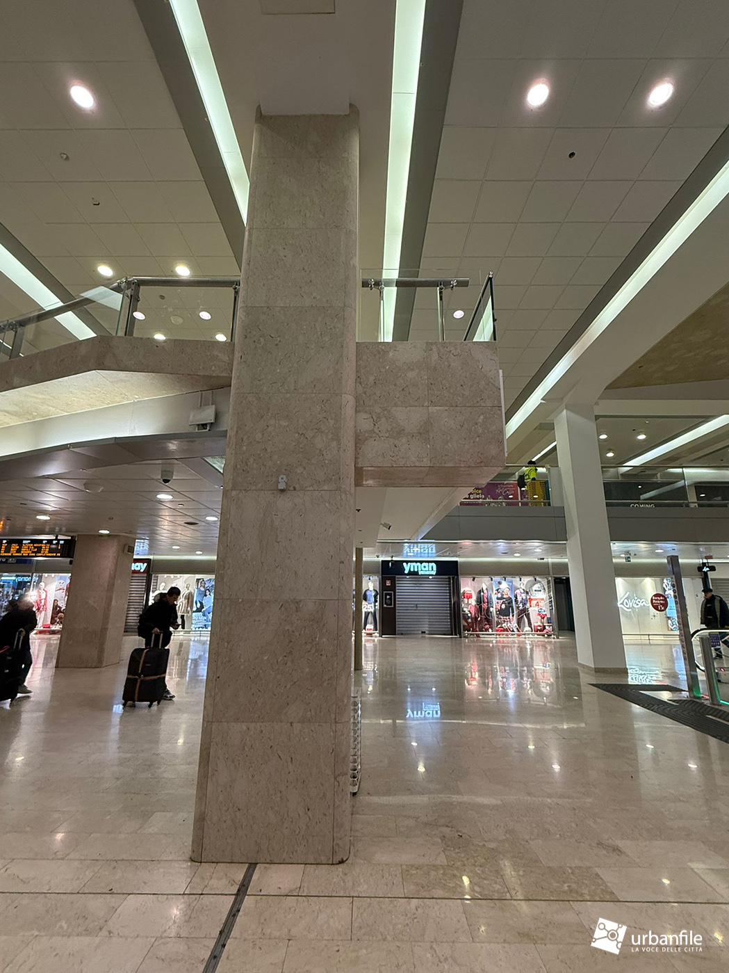Inoltre, contrariamente a quanto mostrato nei rendering, le lastre di marmo che rivestivano i pilastri non sono state reinstallate, lasciandoli a intonaco a vista. Ci si augura che possano resistere agli urti di bagagli e a utilizzi maldestri.
