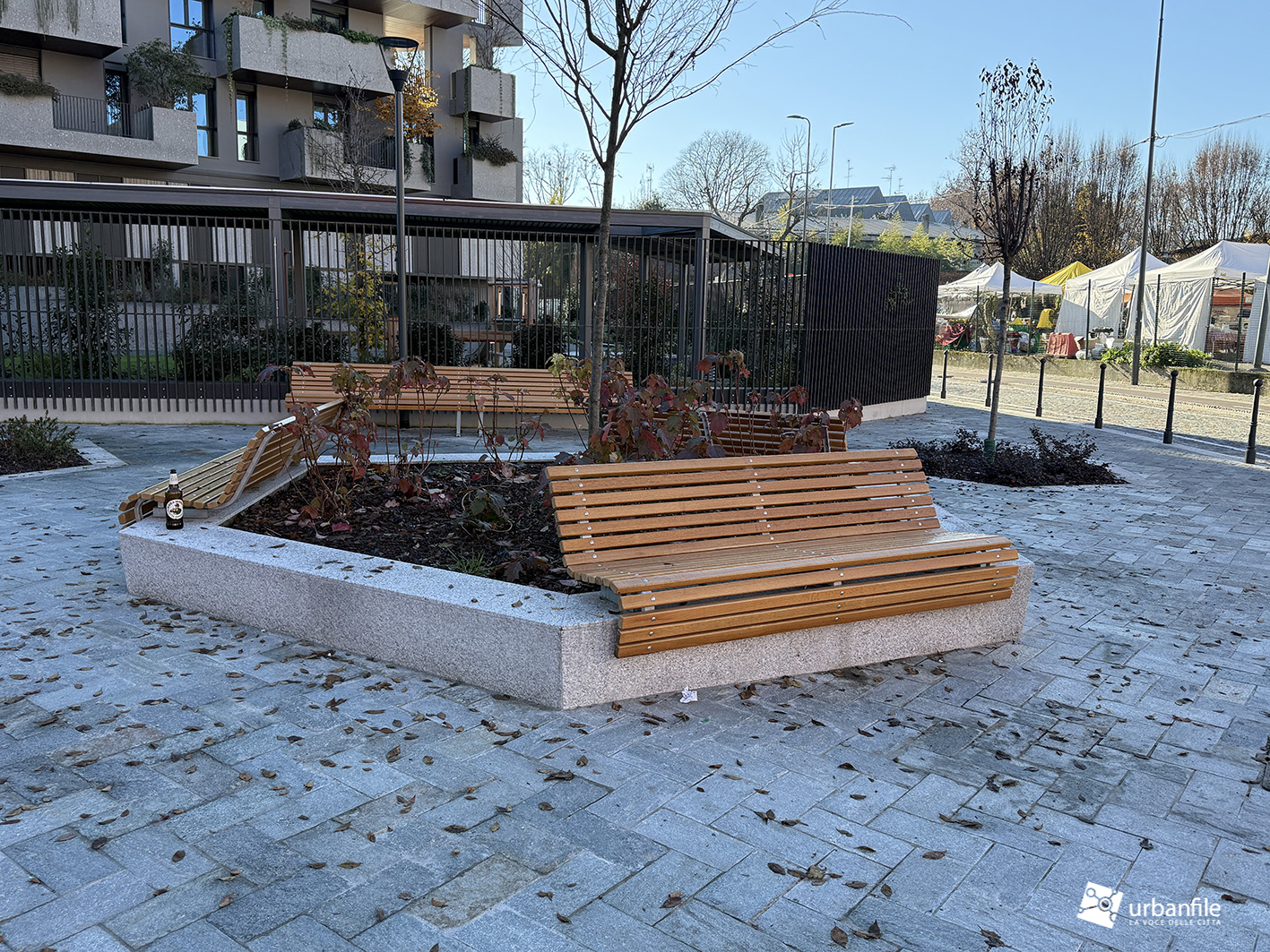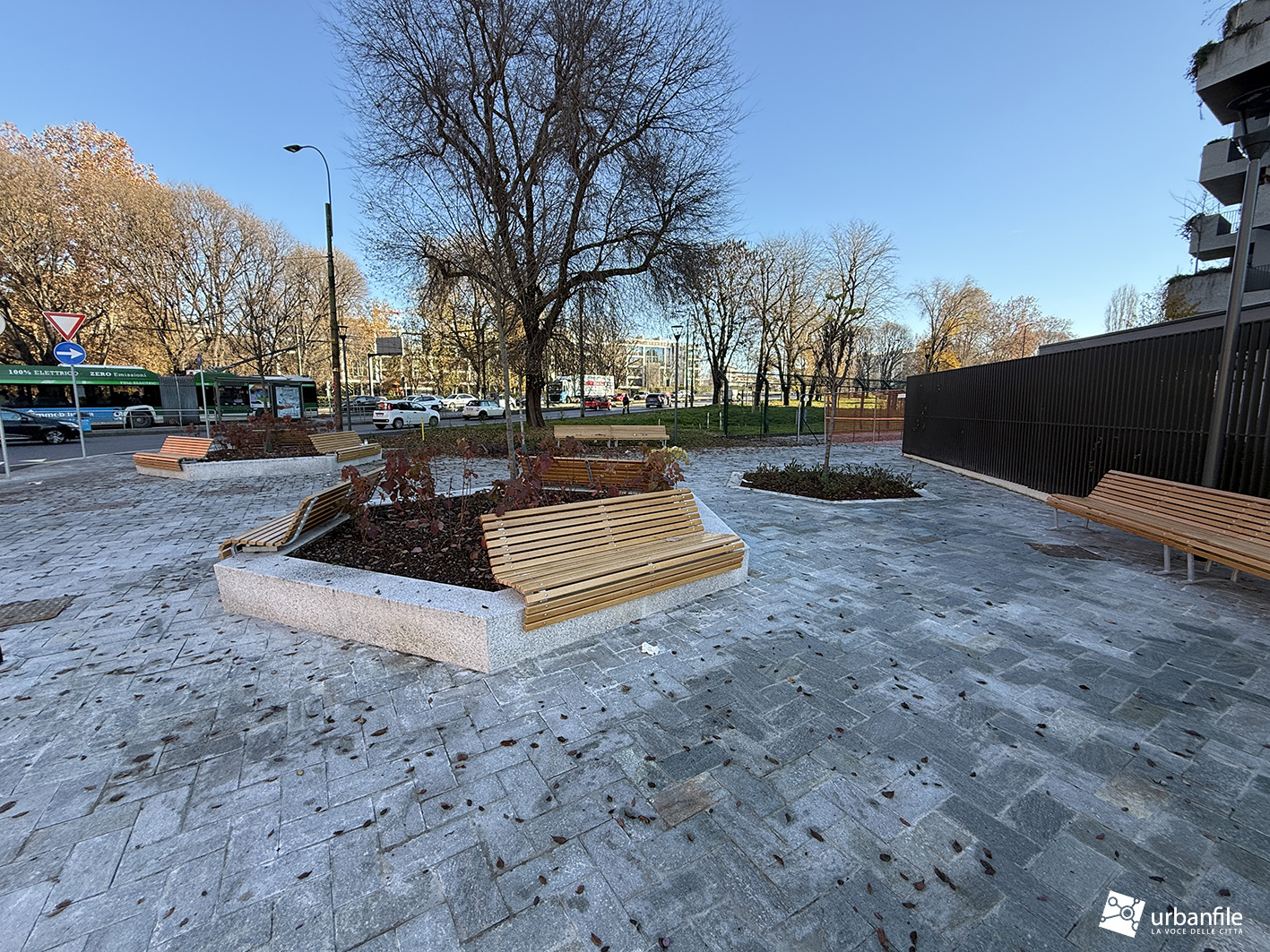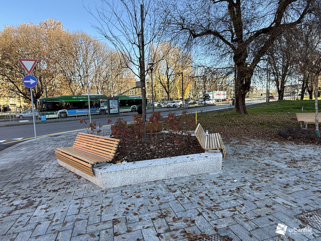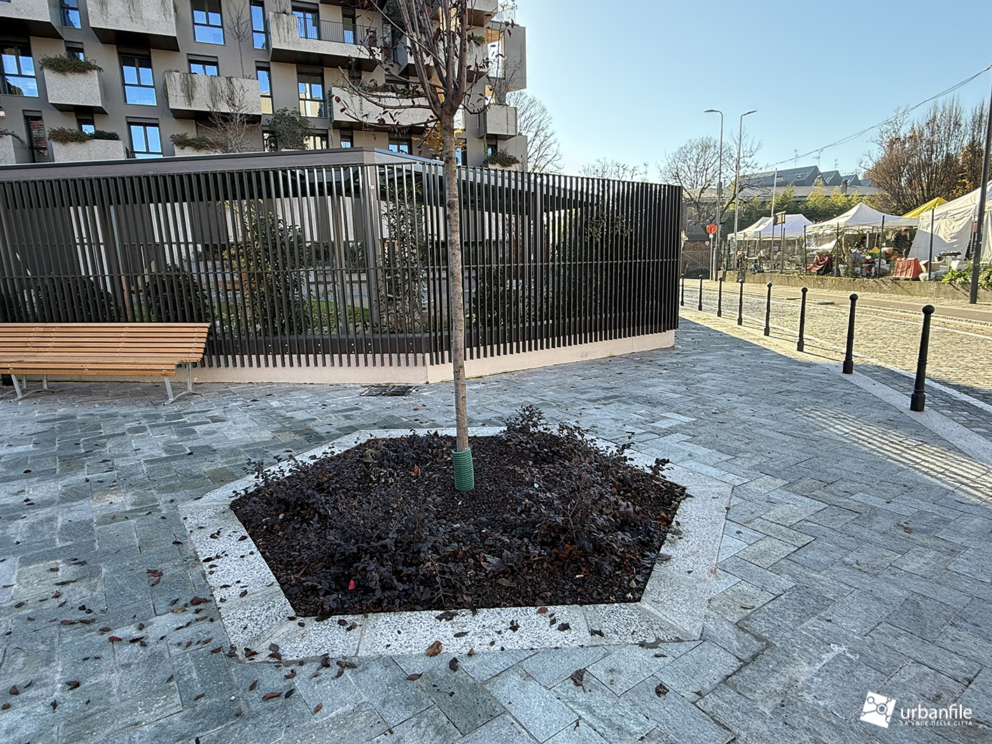 Questo spazio è stato abbellito da 4 aiuole esagonali, due delle quali sono state rialzate per accogliere anche delle panchine in legno. Naturalmente ogni panchina possiede un’alberello. Spazio molto semplice ma bello.