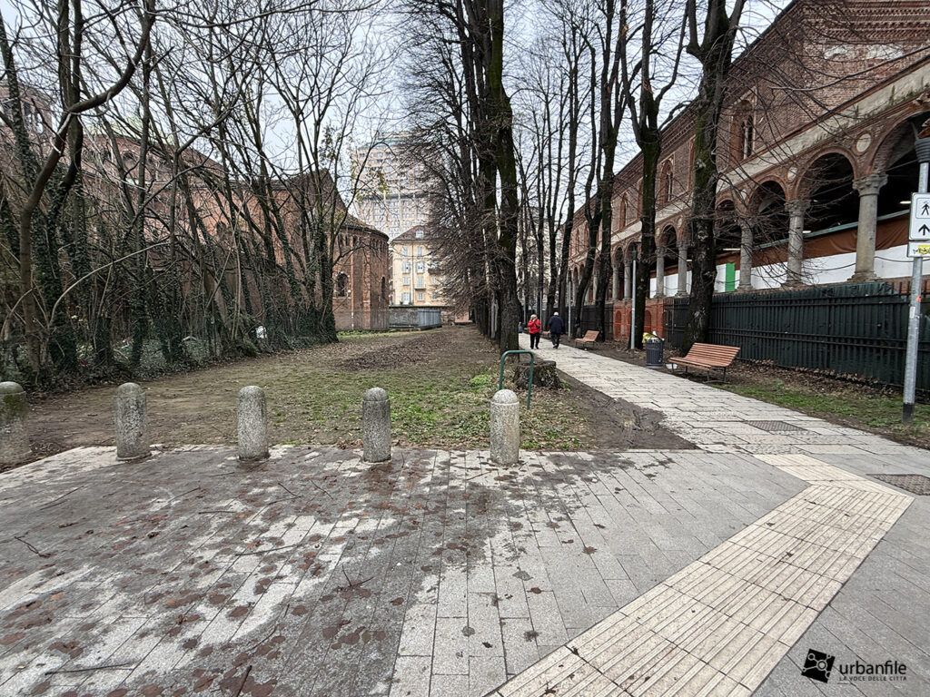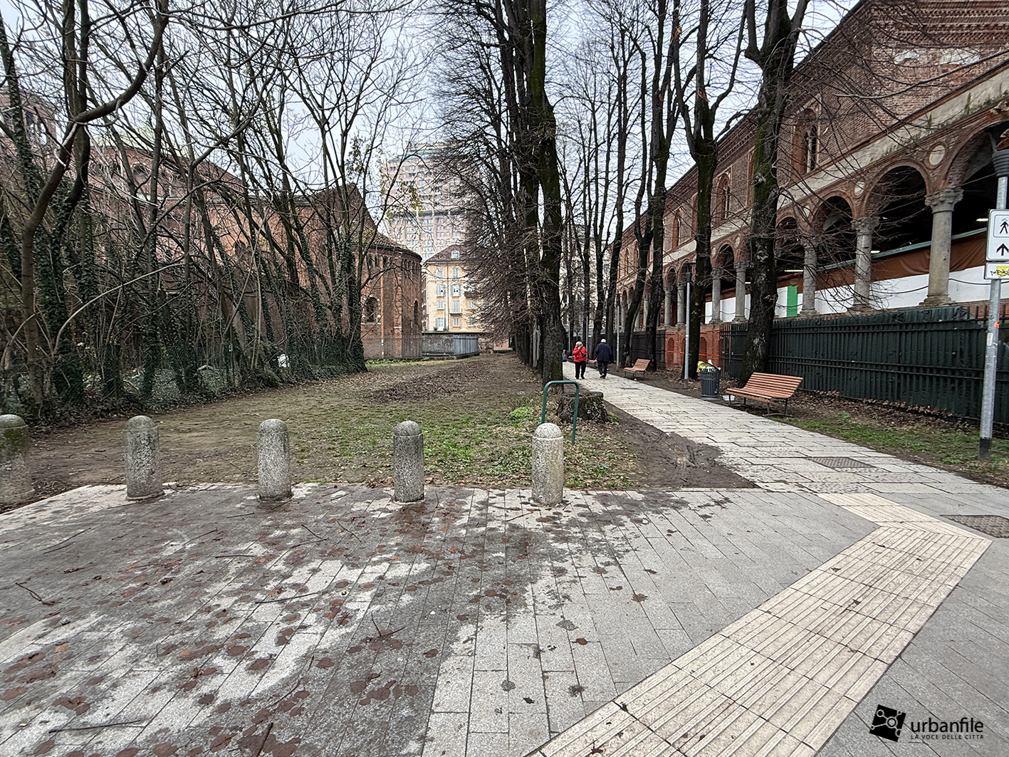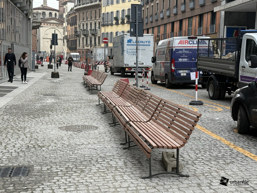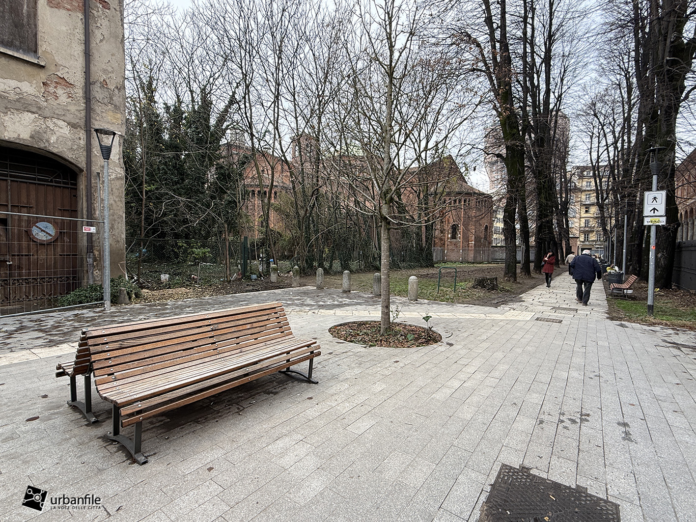 Giungiamo con il nostro giretto fotografico in via Larga, dove finalmente si realizza un sogno: la riqualificazione dello slargo in cui via Larga incrocia via Chiaravalle, via Albricci e via Pantano, da sempre utilizzato, anche questo, come un brutto parcheggio. Dopo la realizzazione della torretta dell’ascensore nel nuovo corridoio del prolungamento dell’uscita della stazione M3 Missori in questo punto, anche il piazzale è stato sottoposto a una riqualificazione totale, con nuove aiuole, alberature e panchine, diventando di fatto un’area pedonale.