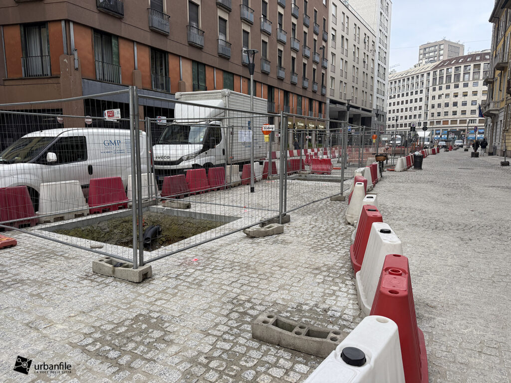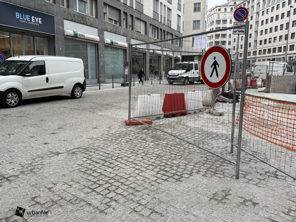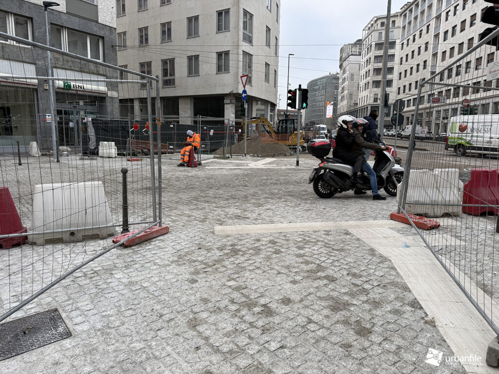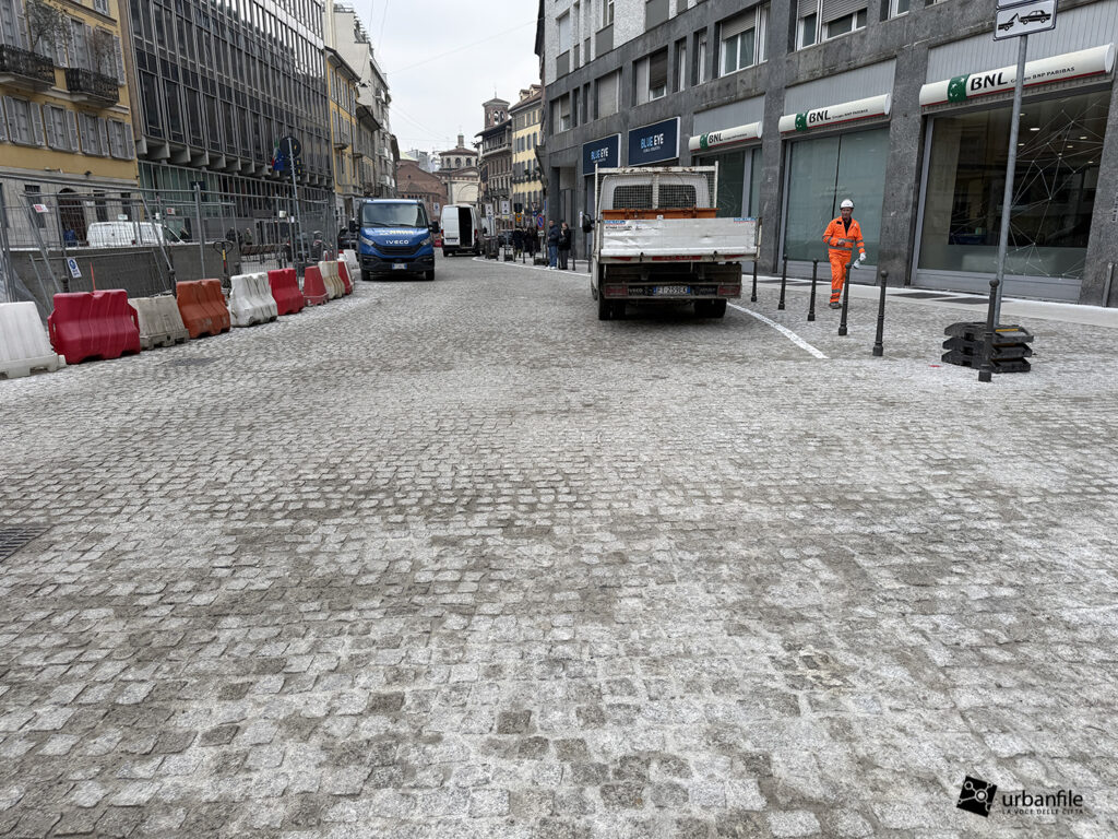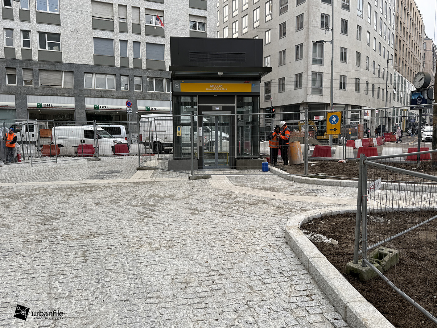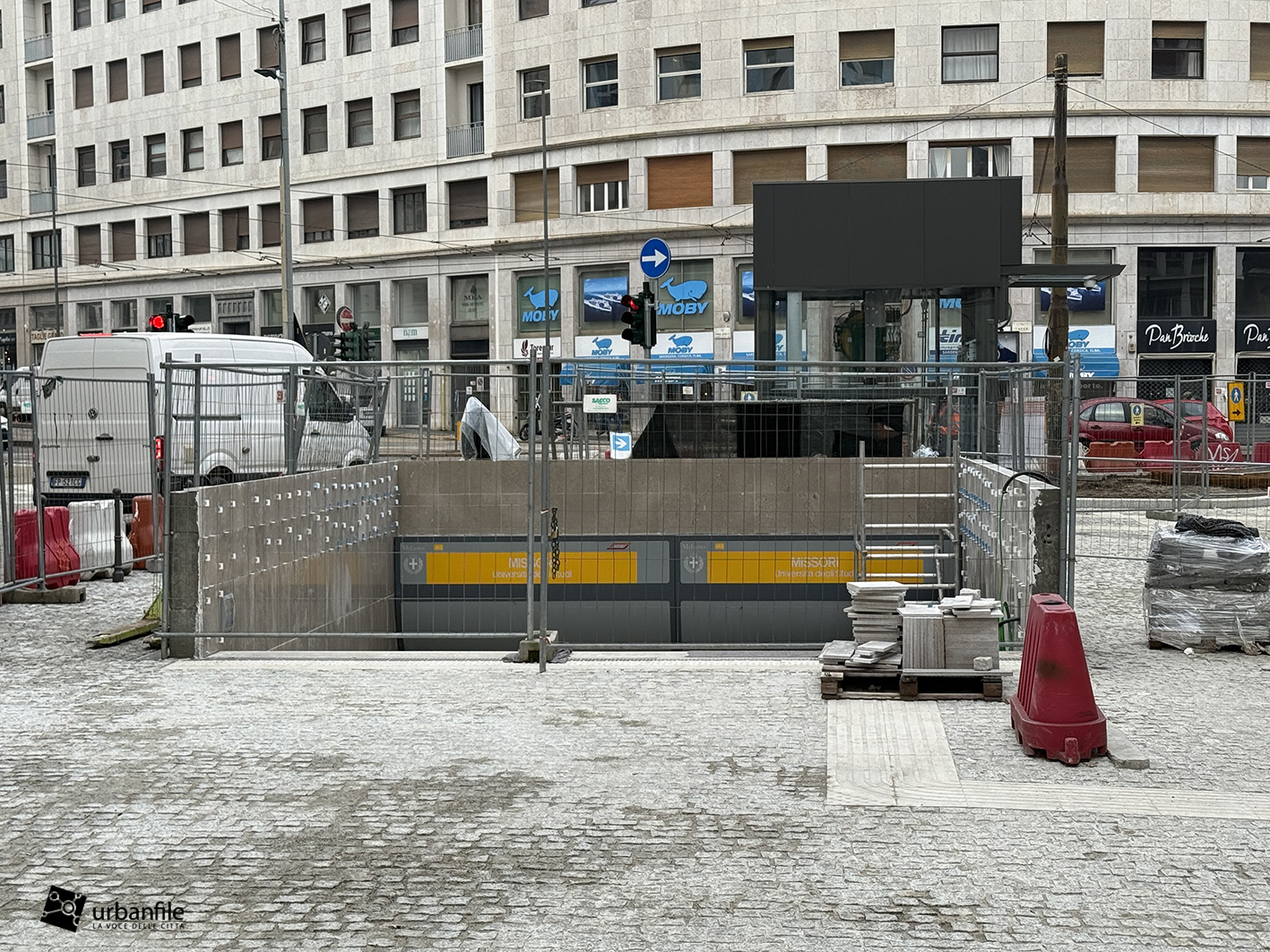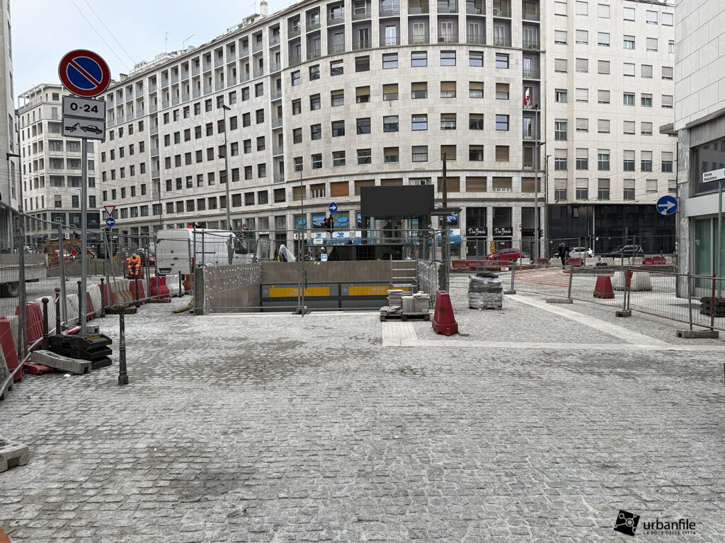 La nuova uscita della stazione M3 Missori è in fase di rivestimento con le lastre di marmo. Sono stati modificati anche i marciapiedi e gli attraversamenti di via Larga e Albricci.