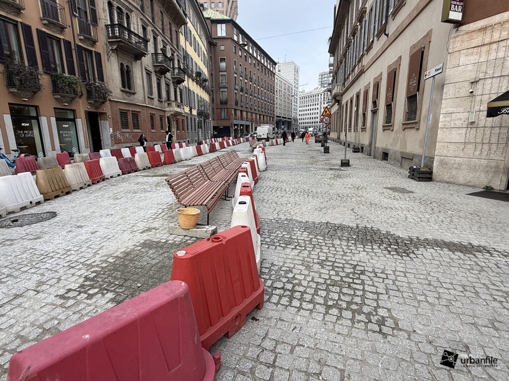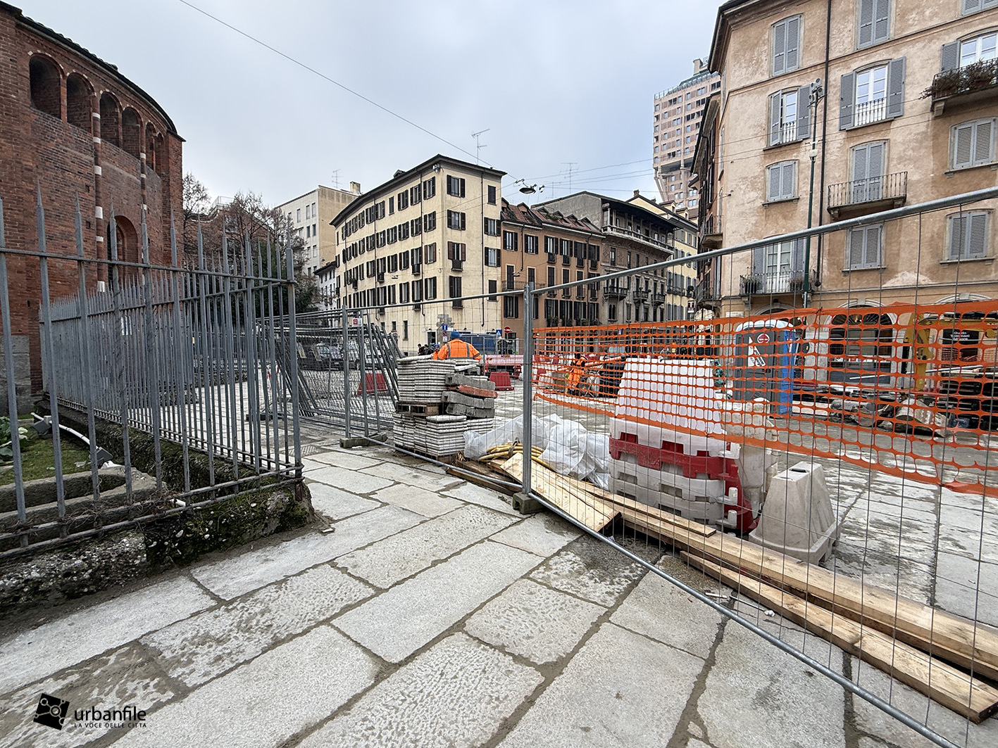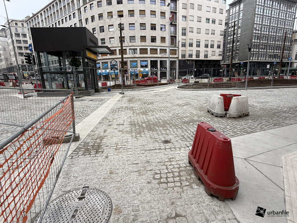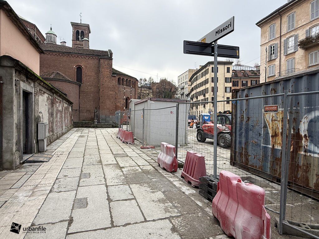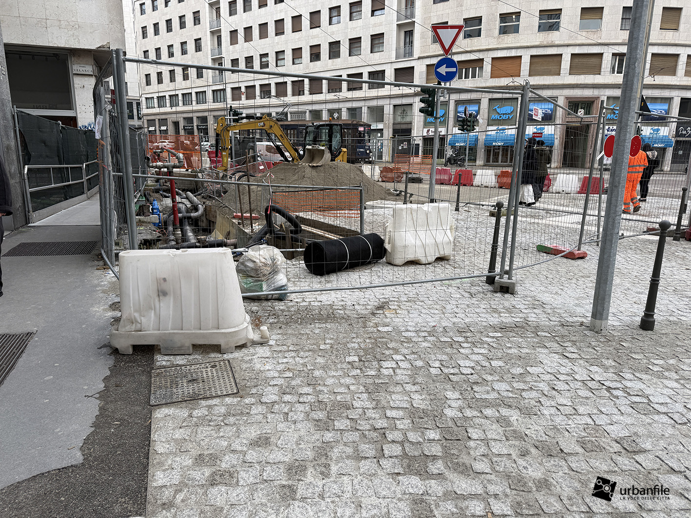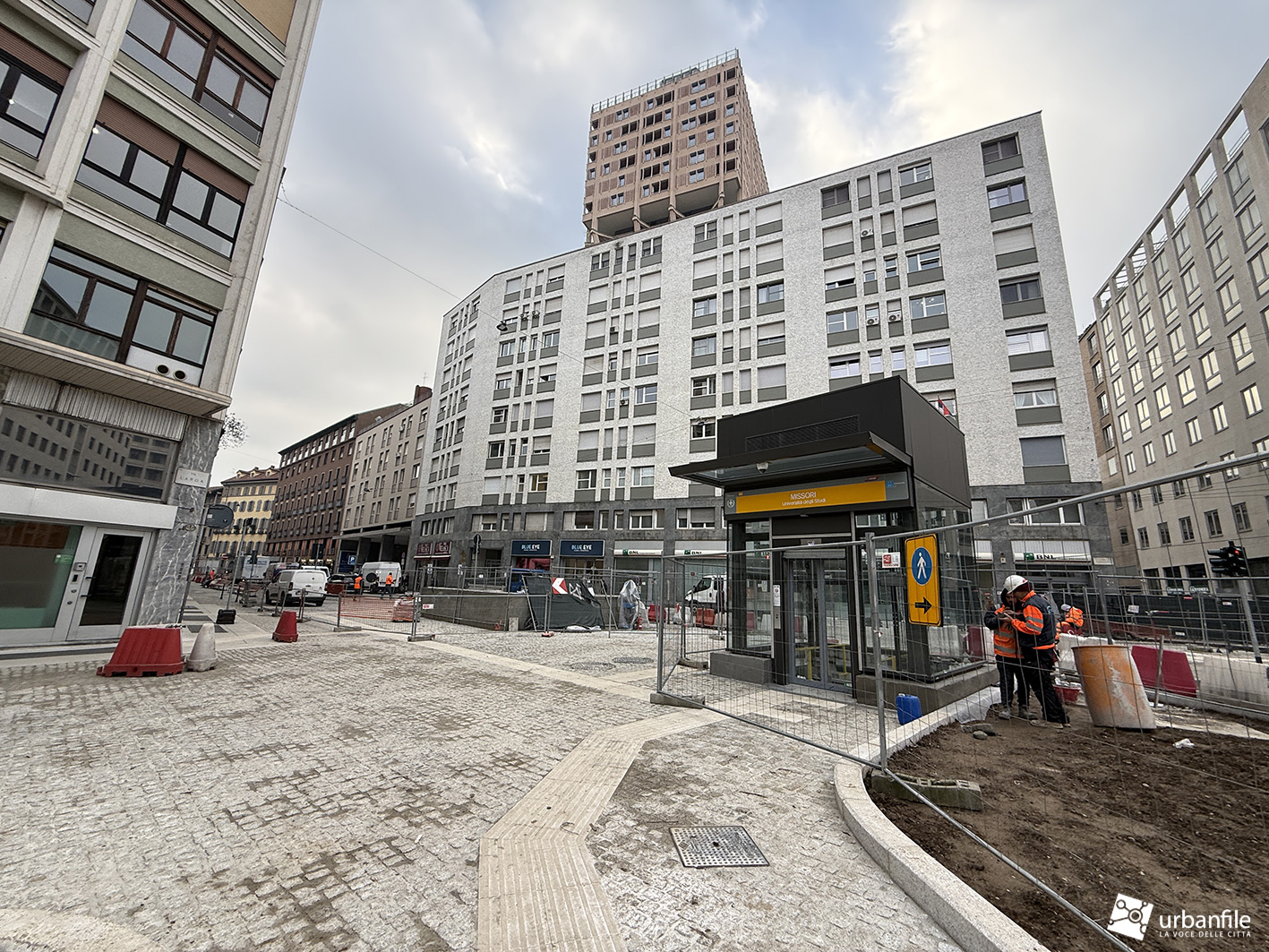 La nuova uscita della stazione M3 Missori è in fase di rivestimento con le lastre di marmo. Sono stati modificati anche i marciapiedi e gli attraversamenti di via Larga e Albricci.