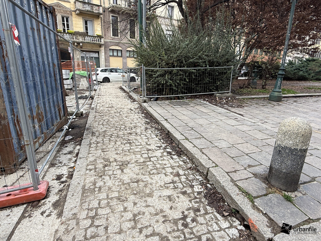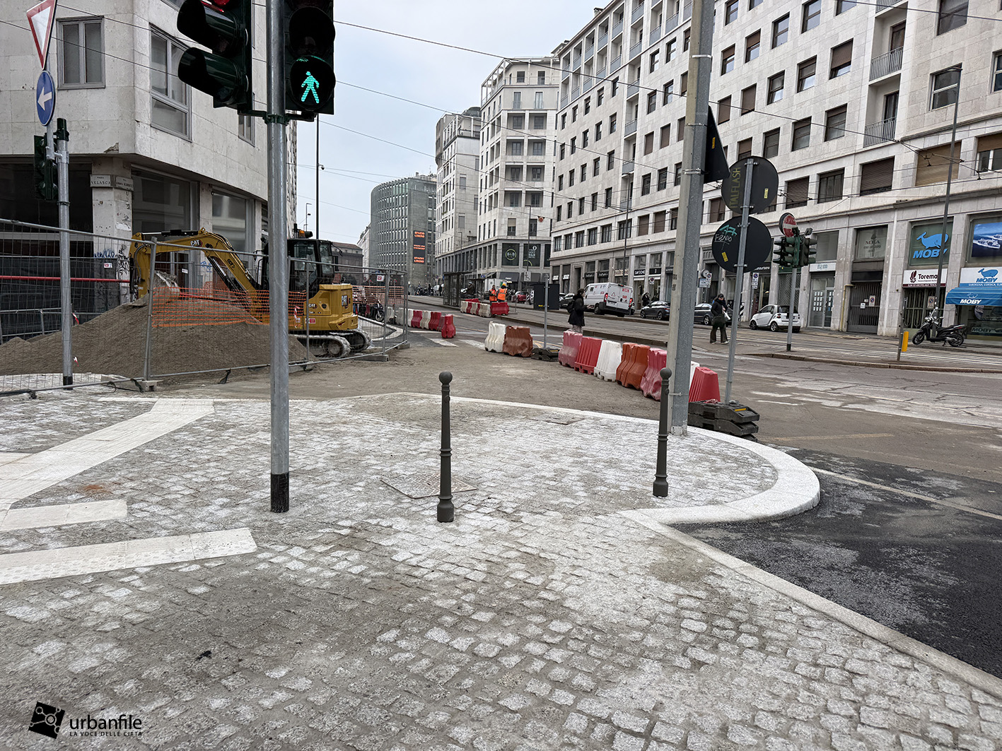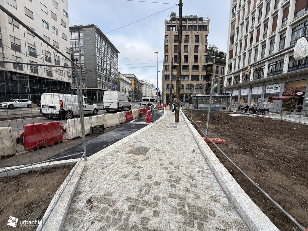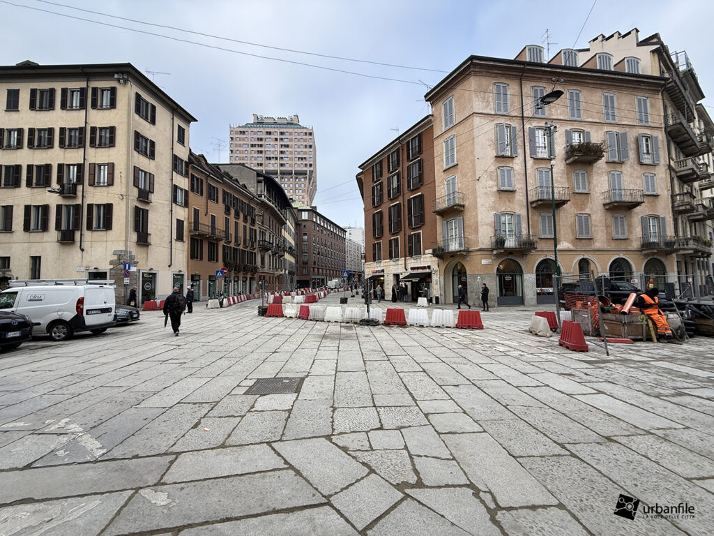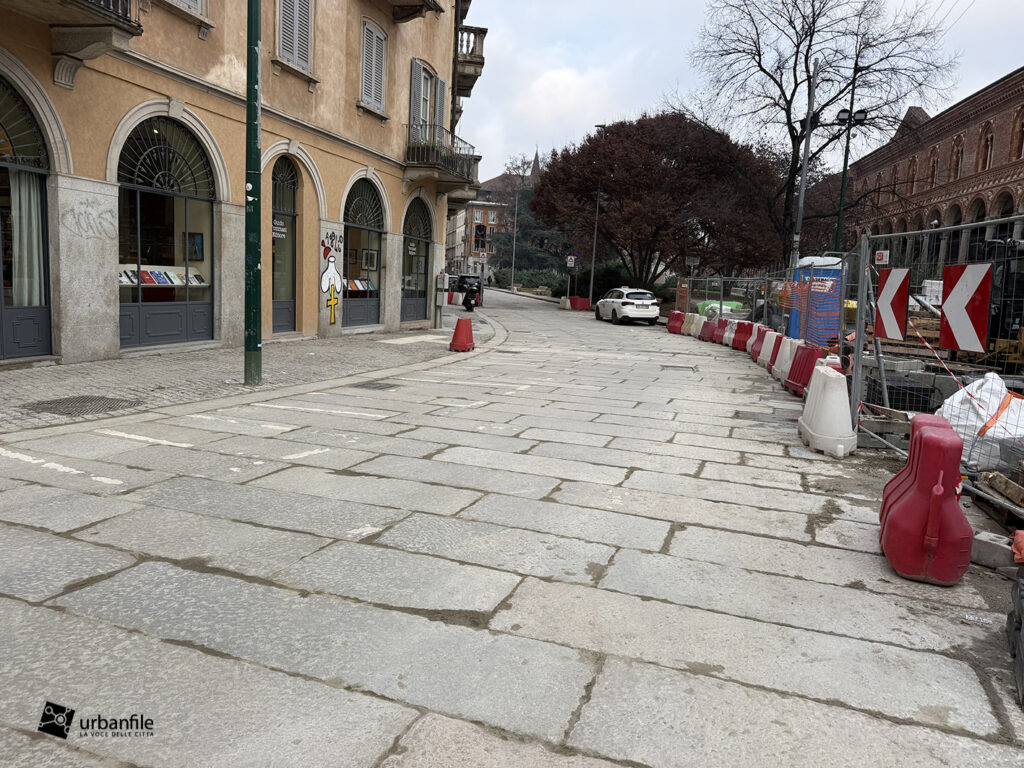 Giungendo in Largo Francesco Richini, possiamo notare che i lavori sono ormai in dirittura d’arrivo. La carreggiata automobilistica di largo Richini è stata pavimentata con cubetti di granito sino all’incrocio con via Chiaravalle.