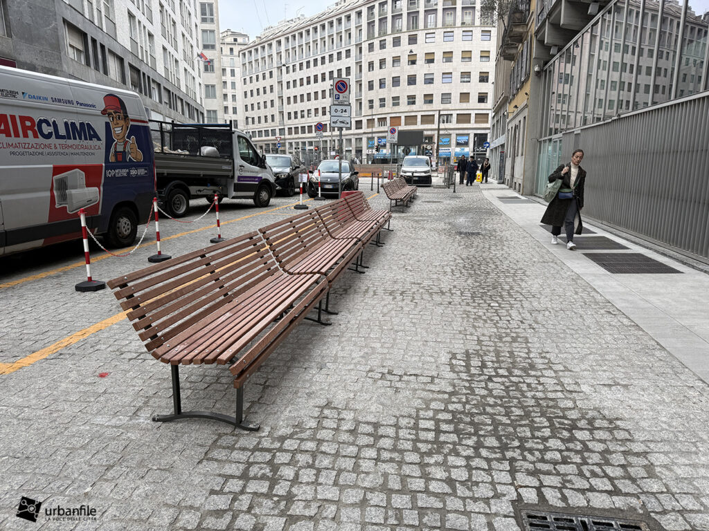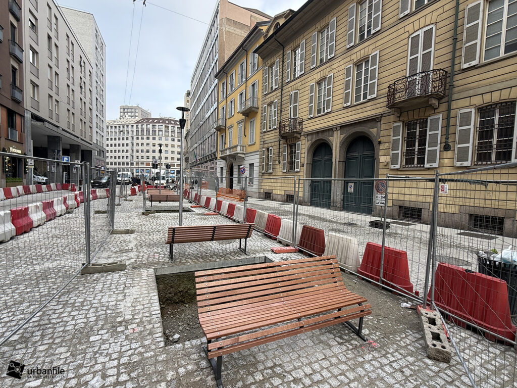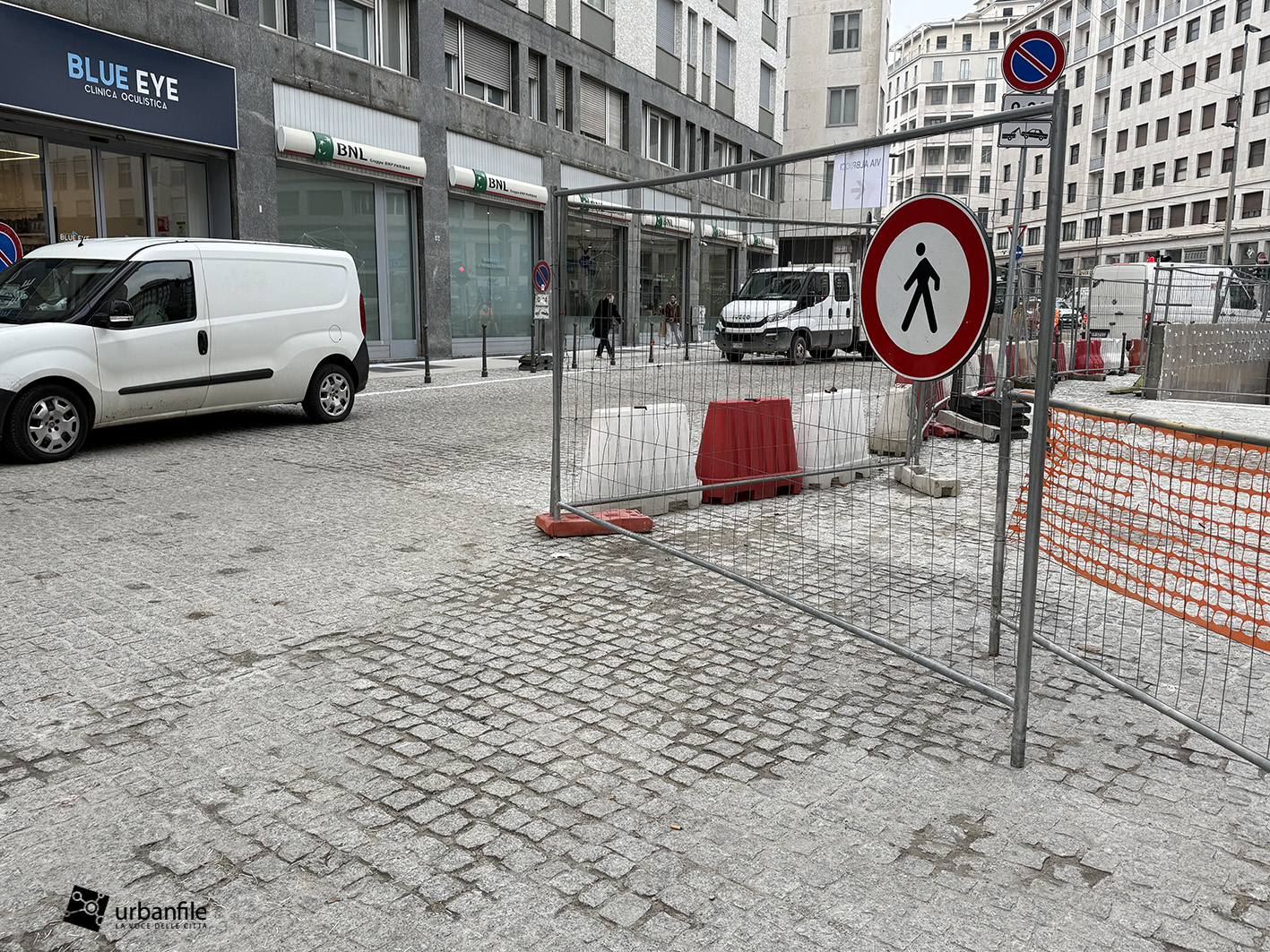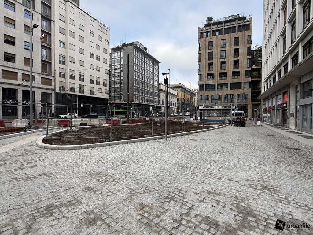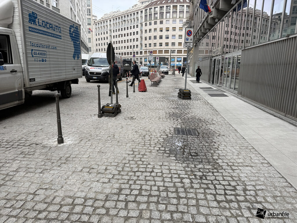 Non vediamo l’ora di ammirare questo tratto della piazza sistemata e pedonalizzata, in precedenza un brutto parcheggio per autovetture. Nella pavimentazione è stata collocata una placca che indica la direzione da prendere per andare alla stazione M3 Missori.