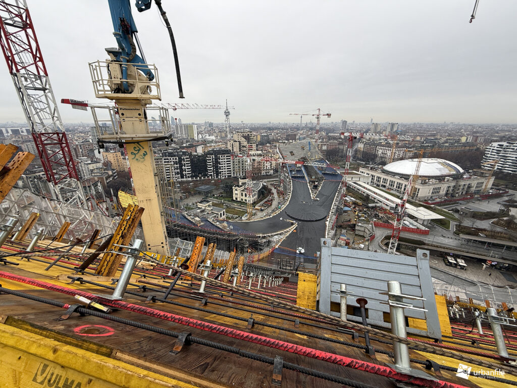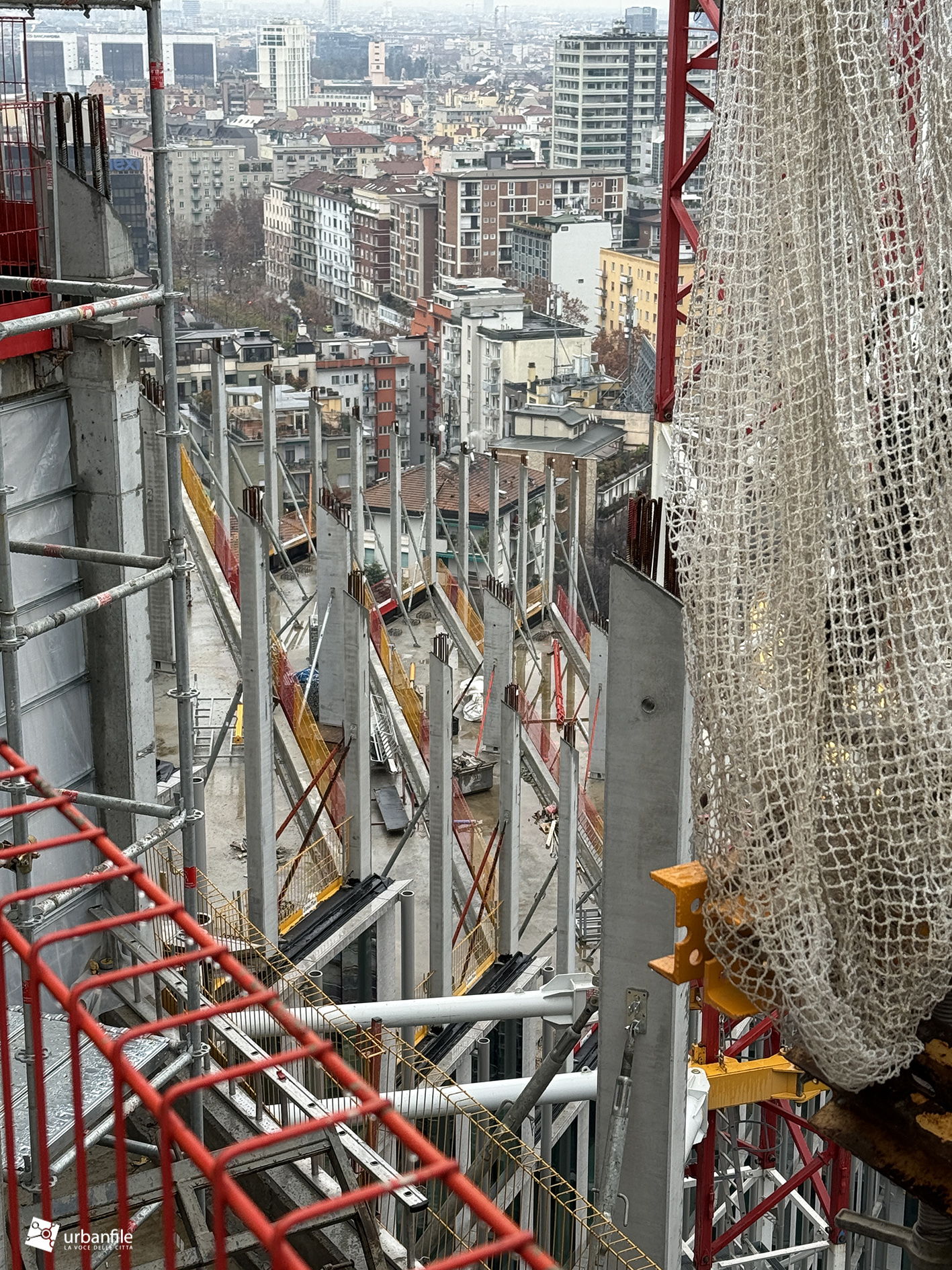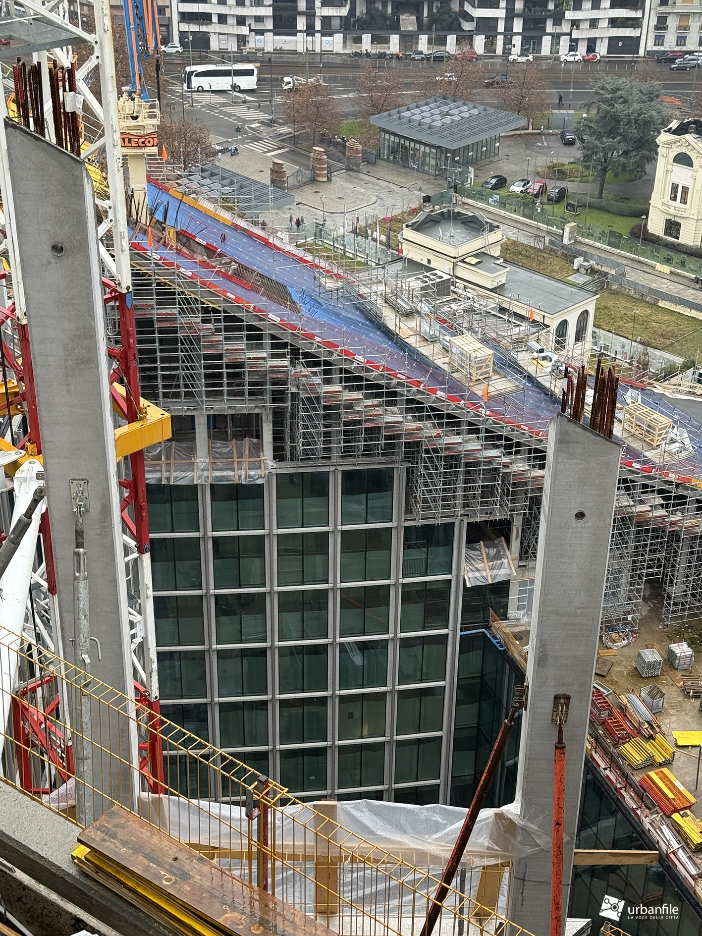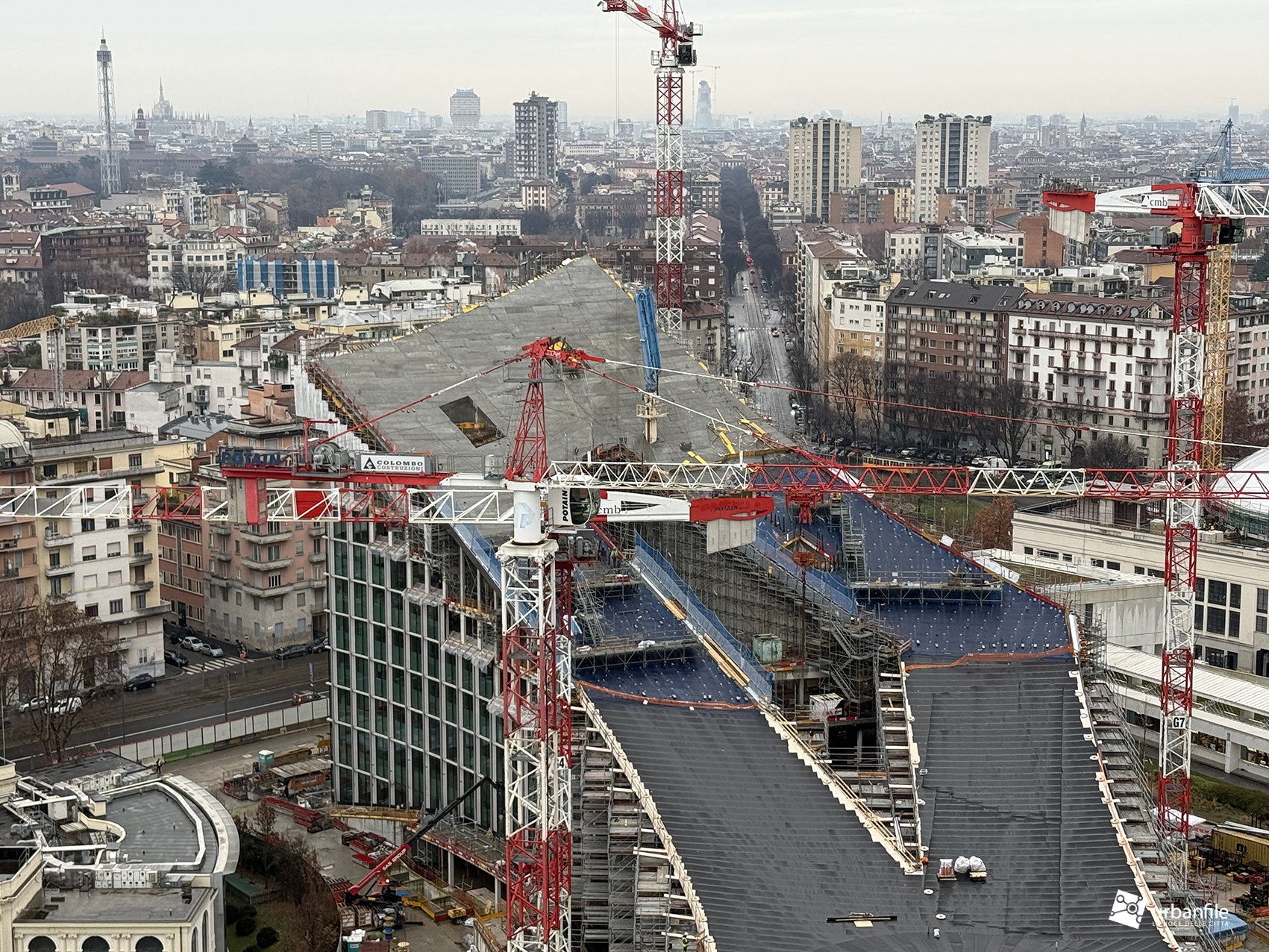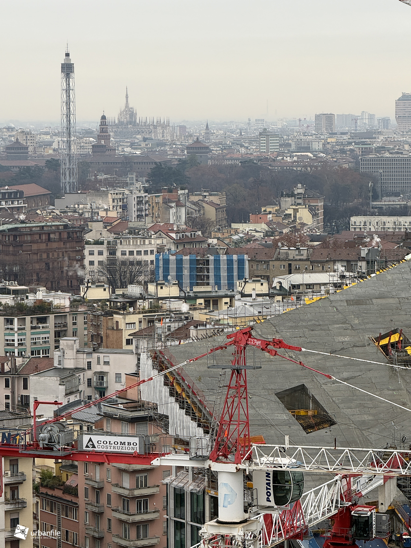 Dopo questa breve panoramica sulla complessità dell’opera, vi portiamo al diciottesimo piano della torre RD, da cui abbiamo potuto osservare il canopy dall’alto. Purtroppo la giornata uggiosa non ha favorito le fotografie, ma ne abbiamo approfittato ugualmente per ammirare il panorama circostante (come la torre A2A in costruzione in lontananza e preceduta dalla dritta e alberata via Vincenzo Monti).