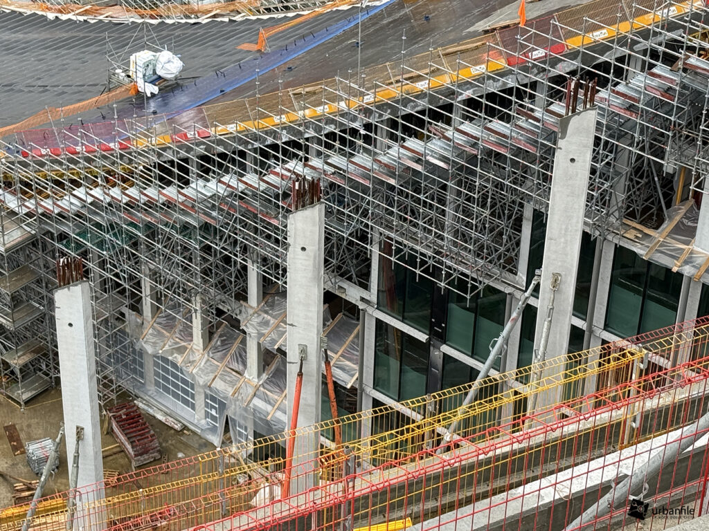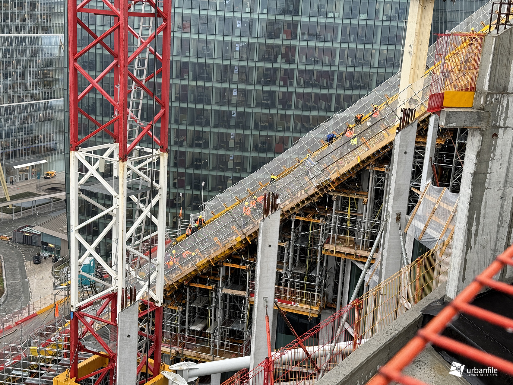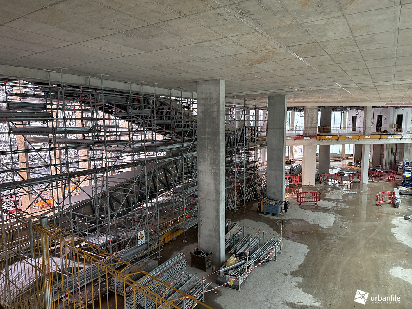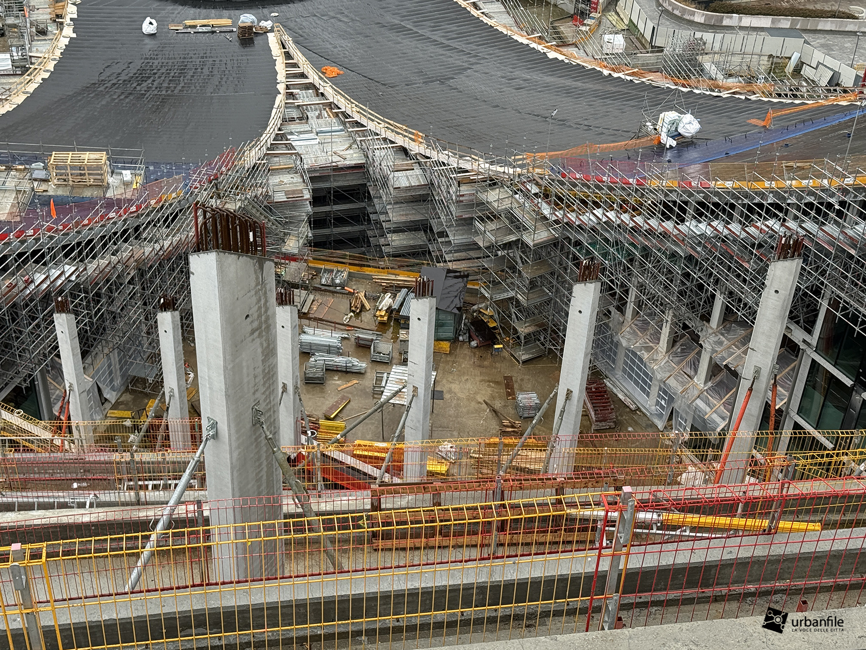 Nella seguente galleria potete vedere la parte centrale del canopy con la parte circolare posta al centro, le colonne che reggeranno il tetto e il cortile interno della torre alta.