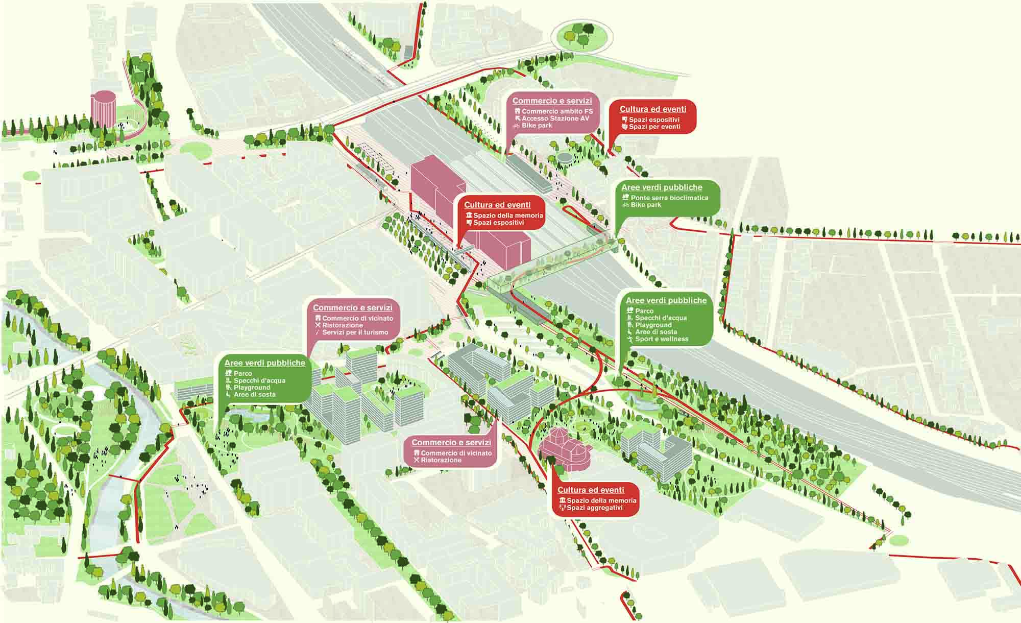 - uno spazio a verde pubblico degli oltre 20 mila metri quadri dello spazio centrale, quello che è già attraversato da un itinerario ciclopedonale che collega viale della Pace con via Tommaseo;