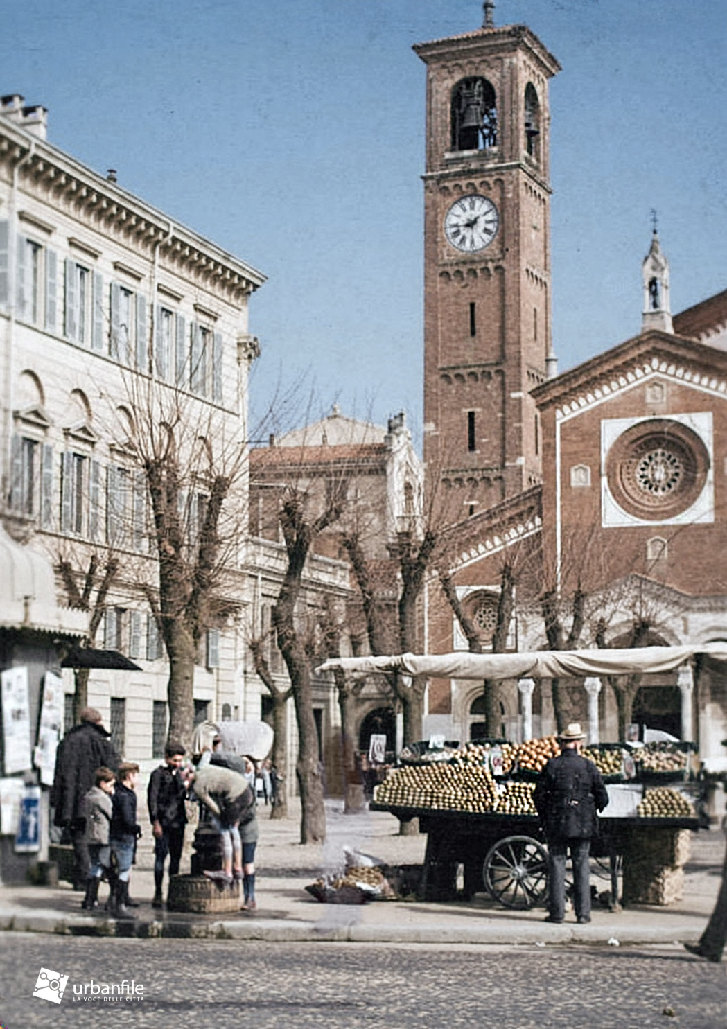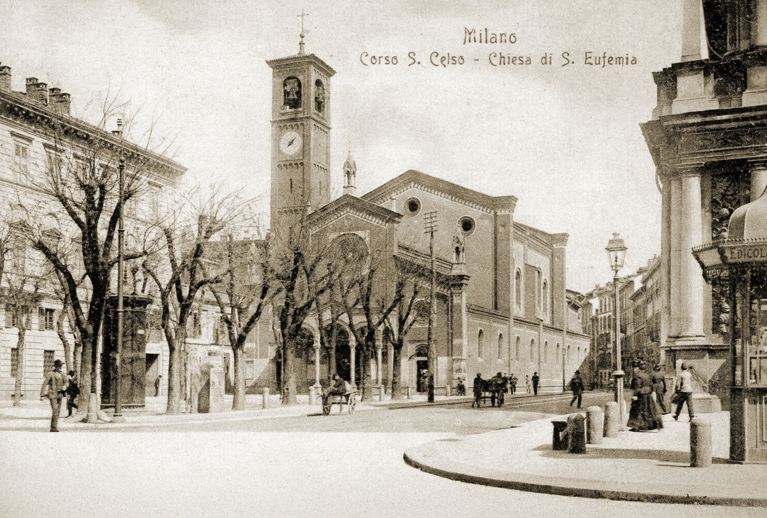Di seguito alcune foto d’epoca ritoccate, che mostrano com’era piazza Sant’Eufemia sino agli anni del dopoguerra. Come molte altre piazze del centro città si presentava come un sagrato rivestito in terra battuta o rizzada (ciottoli di fiume) e con doppio filare d’alberi (forse robinie).