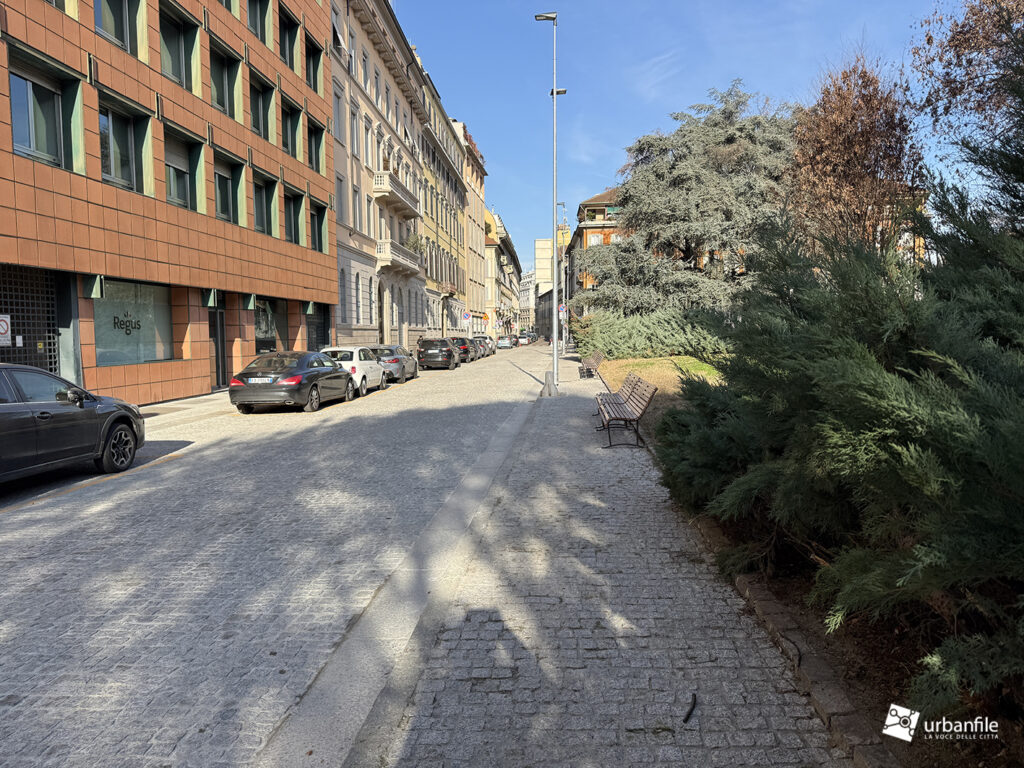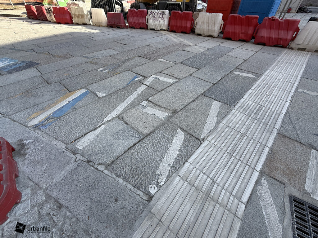 La pavimentazione della via è stata completata come avevamo già visto nello scorso articolo, per ora non è molto comprensibile come verrà, visto che è ancora disseminata di newjersey in plastica, cesate e container, oltre alle troppe auto parcheggiate in maniera disordinata. Al centro sono stati creati 5 fori quadrati dove saranno piantate le nuove alberature.