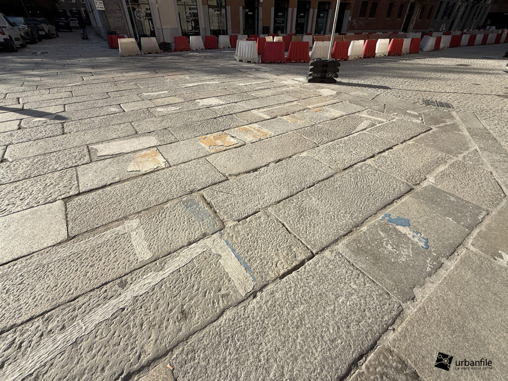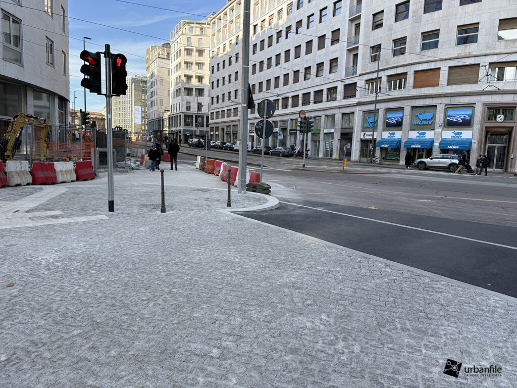 Non vediamo l’ora di ammirare questo tratto della piazza sistemata e pedonalizzata, in precedenza un brutto parcheggio per autovetture. Nella pavimentazione è stata collocata una placca che indica la direzione da prendere per andare alla stazione M3 Missori. (possibile che ci siano sempre auto parcheggiate selvaggiamente?)