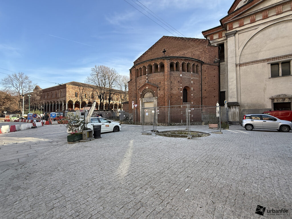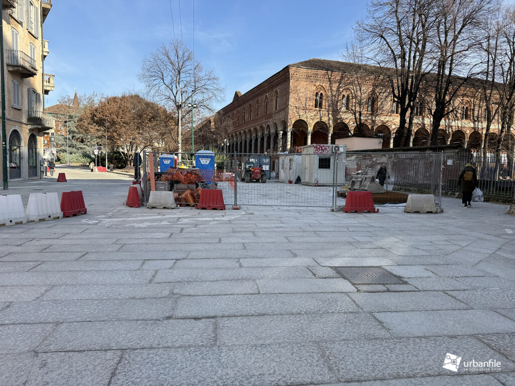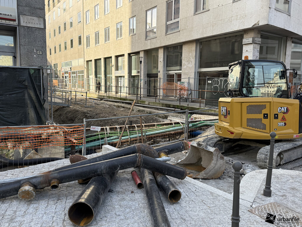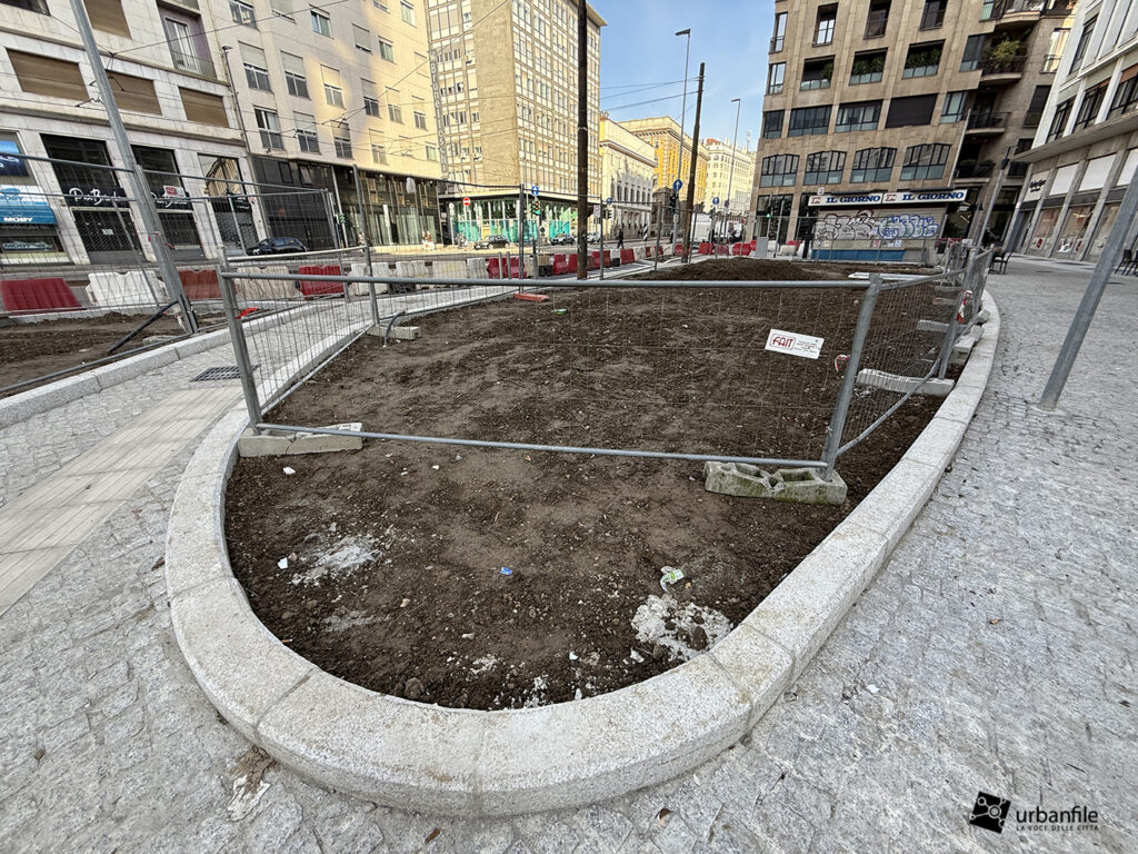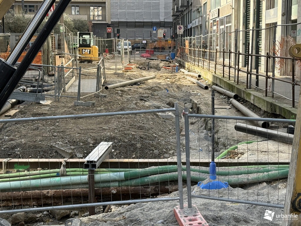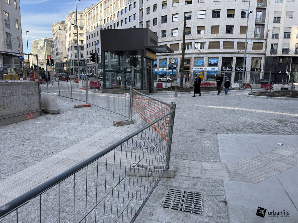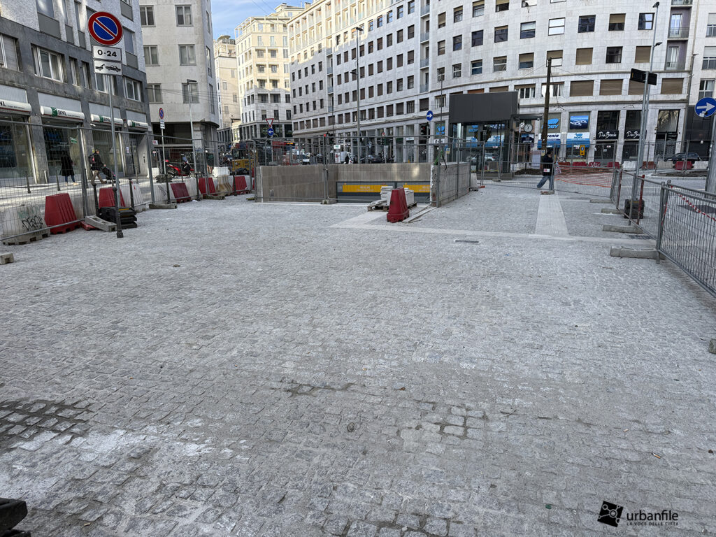 Concludiamo con l’area ancora in cantiere di piazza Velasca, dove nel sottosuolo è stato creato il corridoio che porta alla nuova uscita. Il tunnel di collegamento non è stato ancora aperto ma in superficie inizia ad essere ricoperto dal terreno.