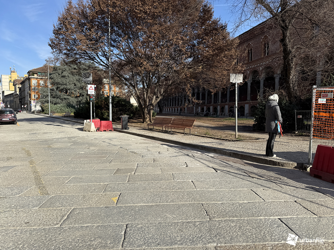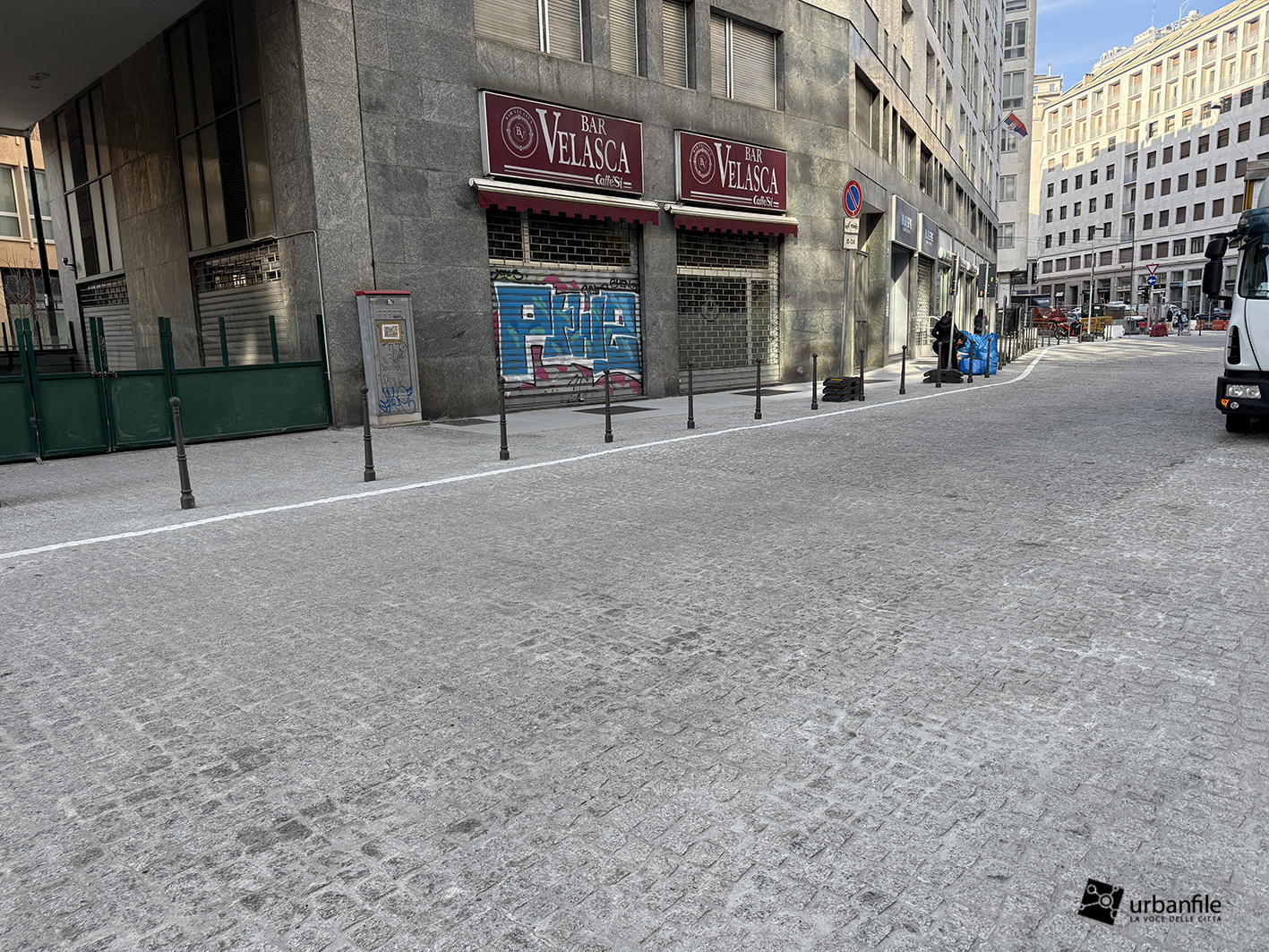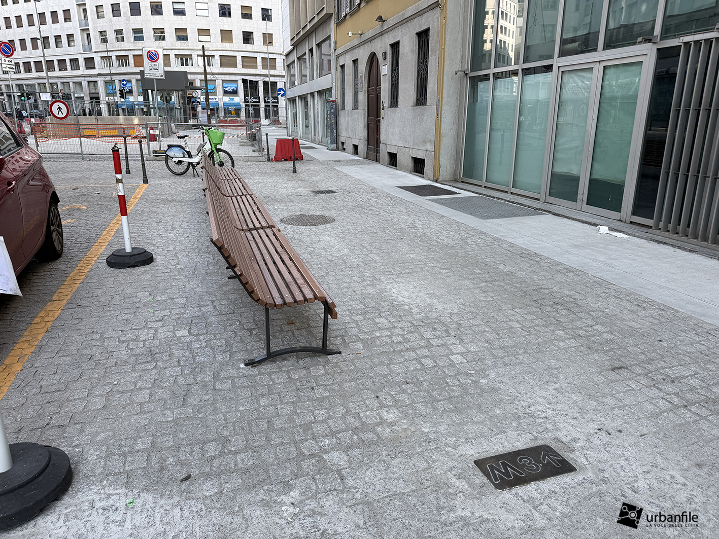 La pavimentazione della via è stata completata come avevamo già visto nello scorso articolo, per ora non è molto comprensibile come verrà, visto che è ancora disseminata di newjersey in plastica, cesate e container, oltre alle troppe auto parcheggiate in maniera disordinata. Al centro sono stati creati 5 fori quadrati dove saranno piantate le nuove alberature.