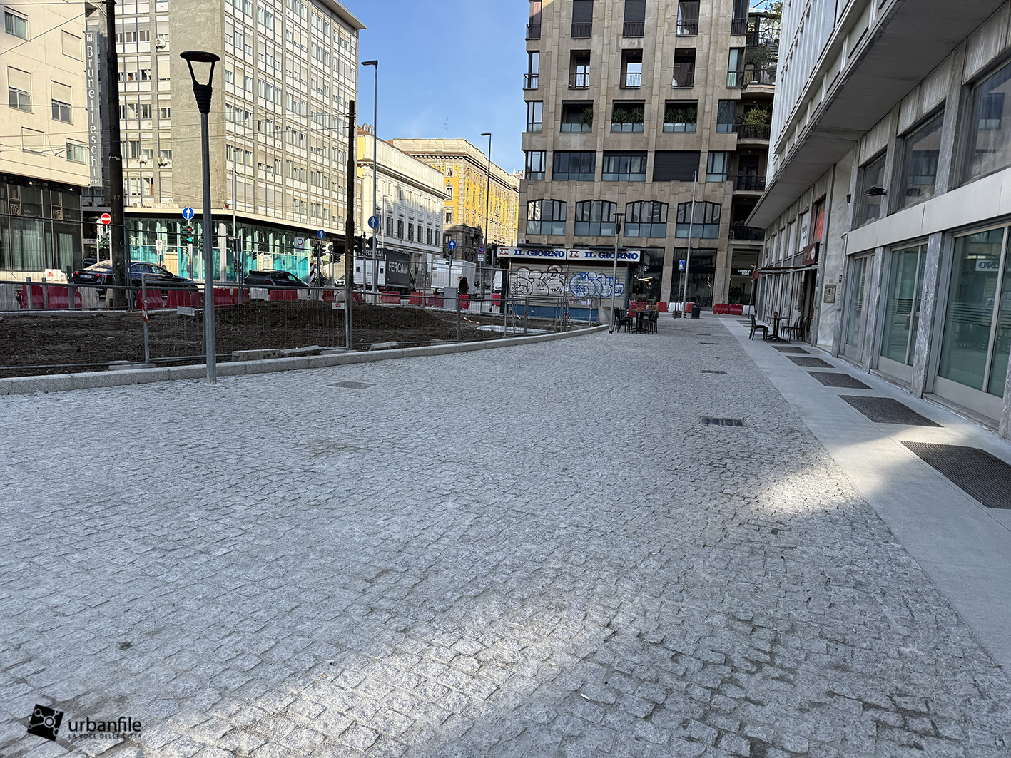 Non vediamo l’ora di ammirare questo tratto della piazza sistemata e pedonalizzata, in precedenza un brutto parcheggio per autovetture. Nella pavimentazione è stata collocata una placca che indica la direzione da prendere per andare alla stazione M3 Missori. (possibile che ci siano sempre auto parcheggiate selvaggiamente?)