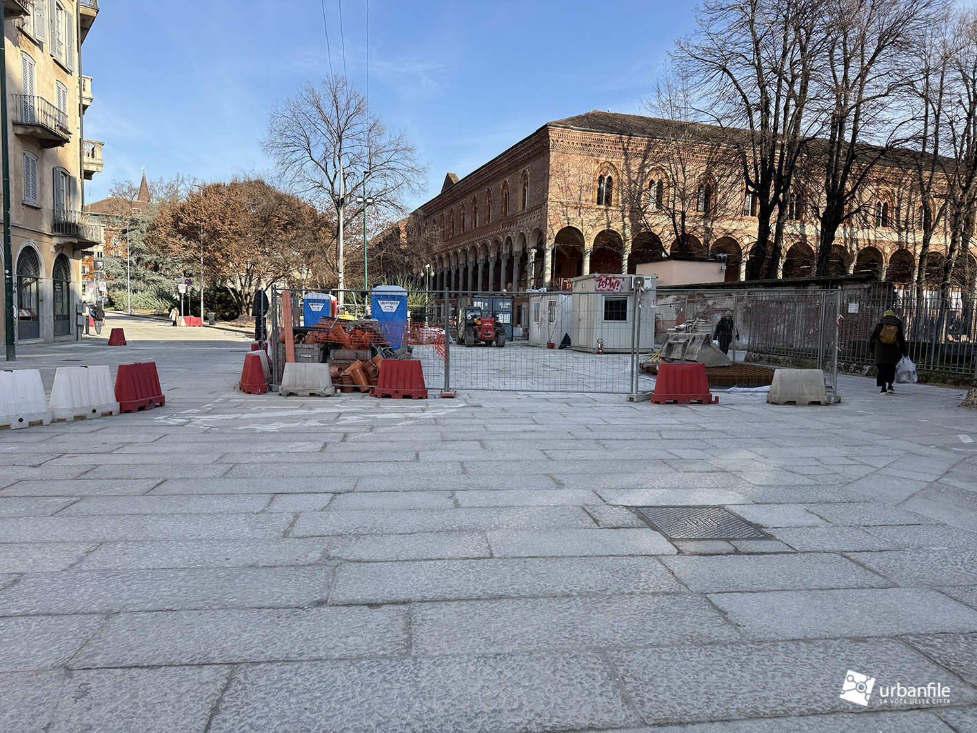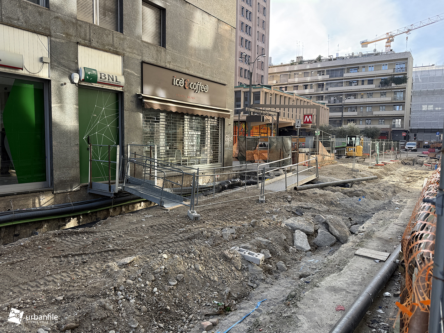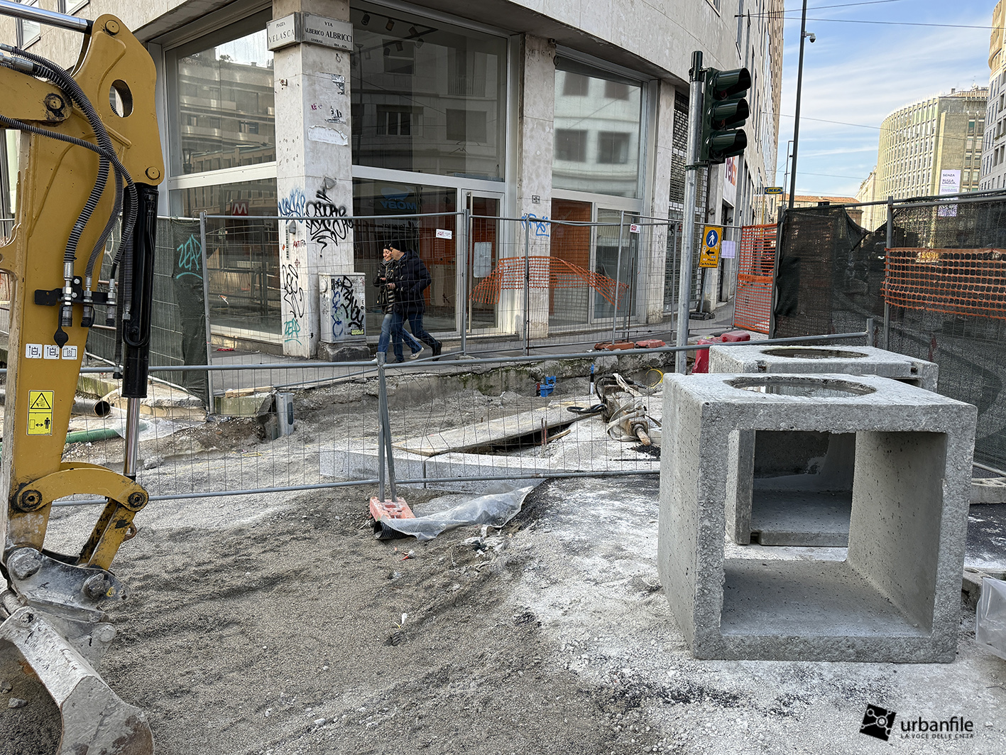 Concludiamo con l’area ancora in cantiere di piazza Velasca, dove nel sottosuolo è stato creato il corridoio che porta alla nuova uscita. Il tunnel di collegamento non è stato ancora aperto ma in superficie inizia ad essere ricoperto dal terreno.