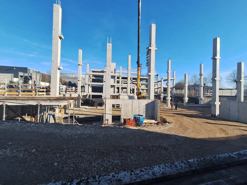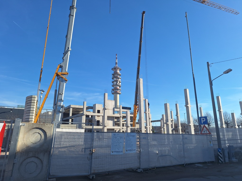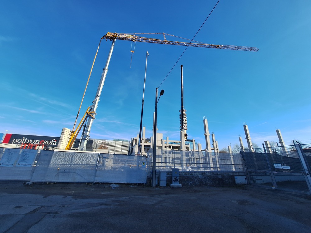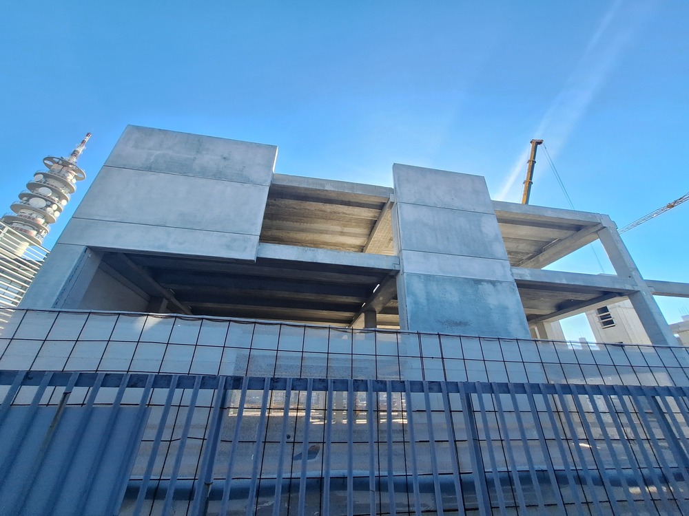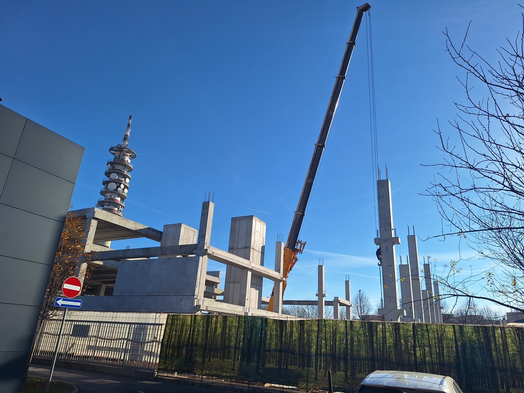 Per la parte est dell’edificio sono state posate tutte le colonne ed ora è in atto la realizzazione delle solette per poi passare alle pareti esterne ed interne. È stato altresì aggiornato il cartello di cantiere con i nuovo render dell’edificio.