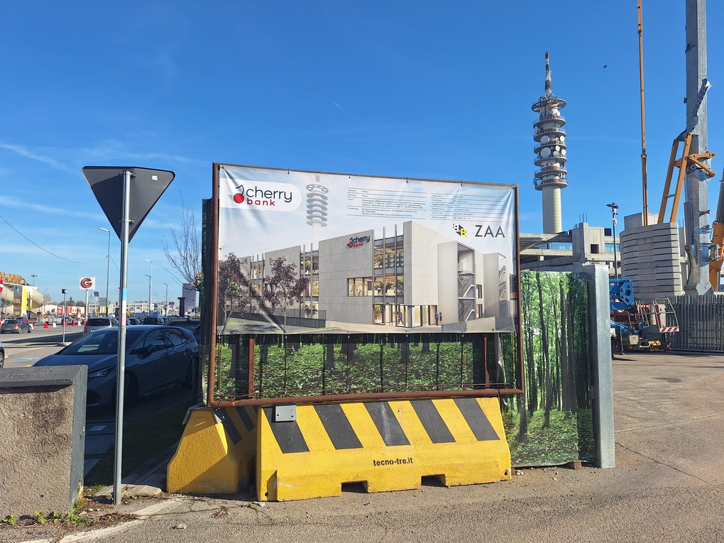 Padova. Aggiornamento fotografico dal cantiere della nuova sede della Cherry Bank nel quartiere della Stanga in via Venezia, di cui avevamo presentato il progetto in questo articolo.