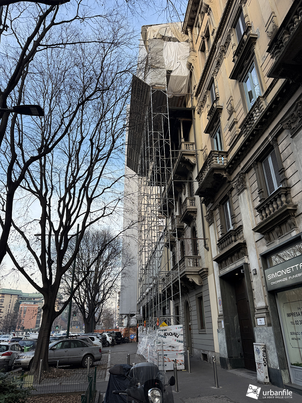 Uno dei due “grattacieli” di via Washington, quello al civico 2, esempio del periodo eclettico o “Beaux Arts” di Milano (quasi déco e liberty), è sottoposto ad un intervento di manutenzione straordinaria che lo riporterà al suo originario splendore.
