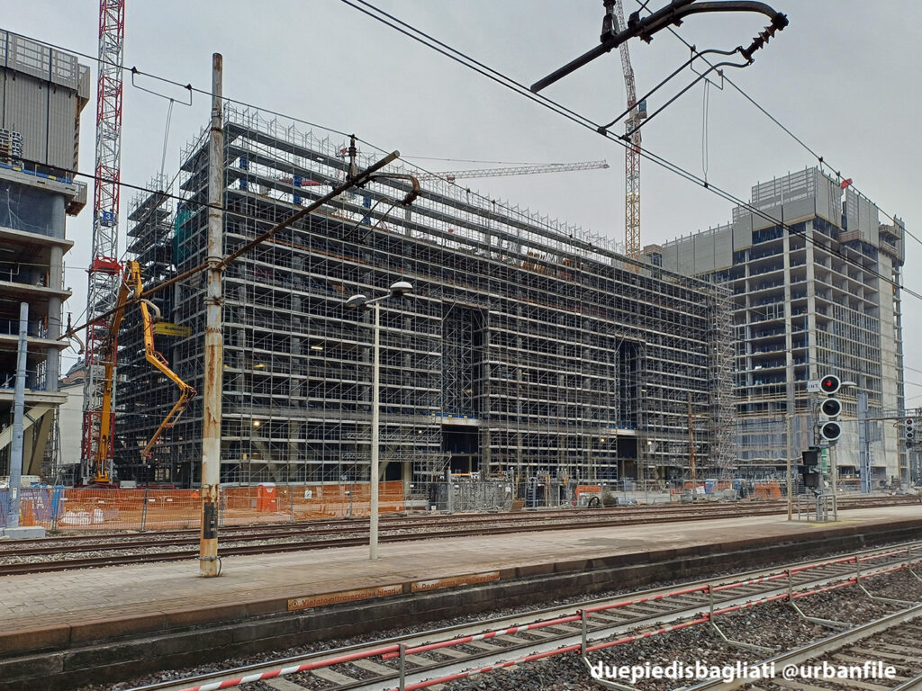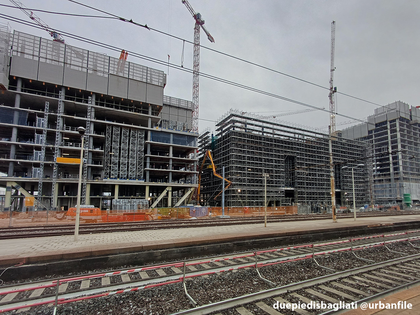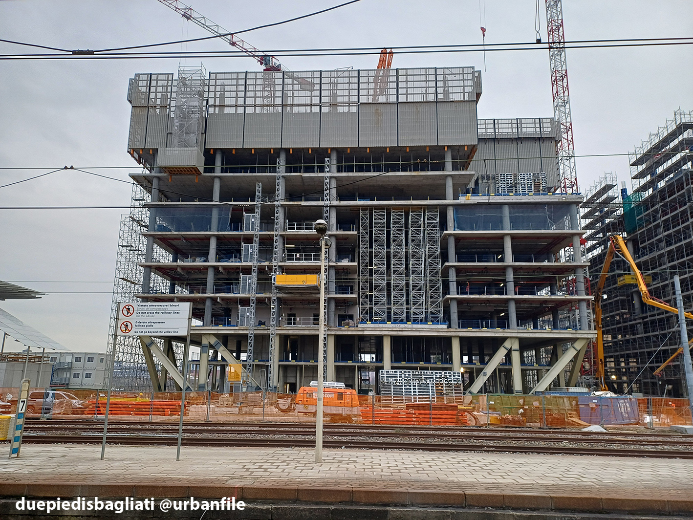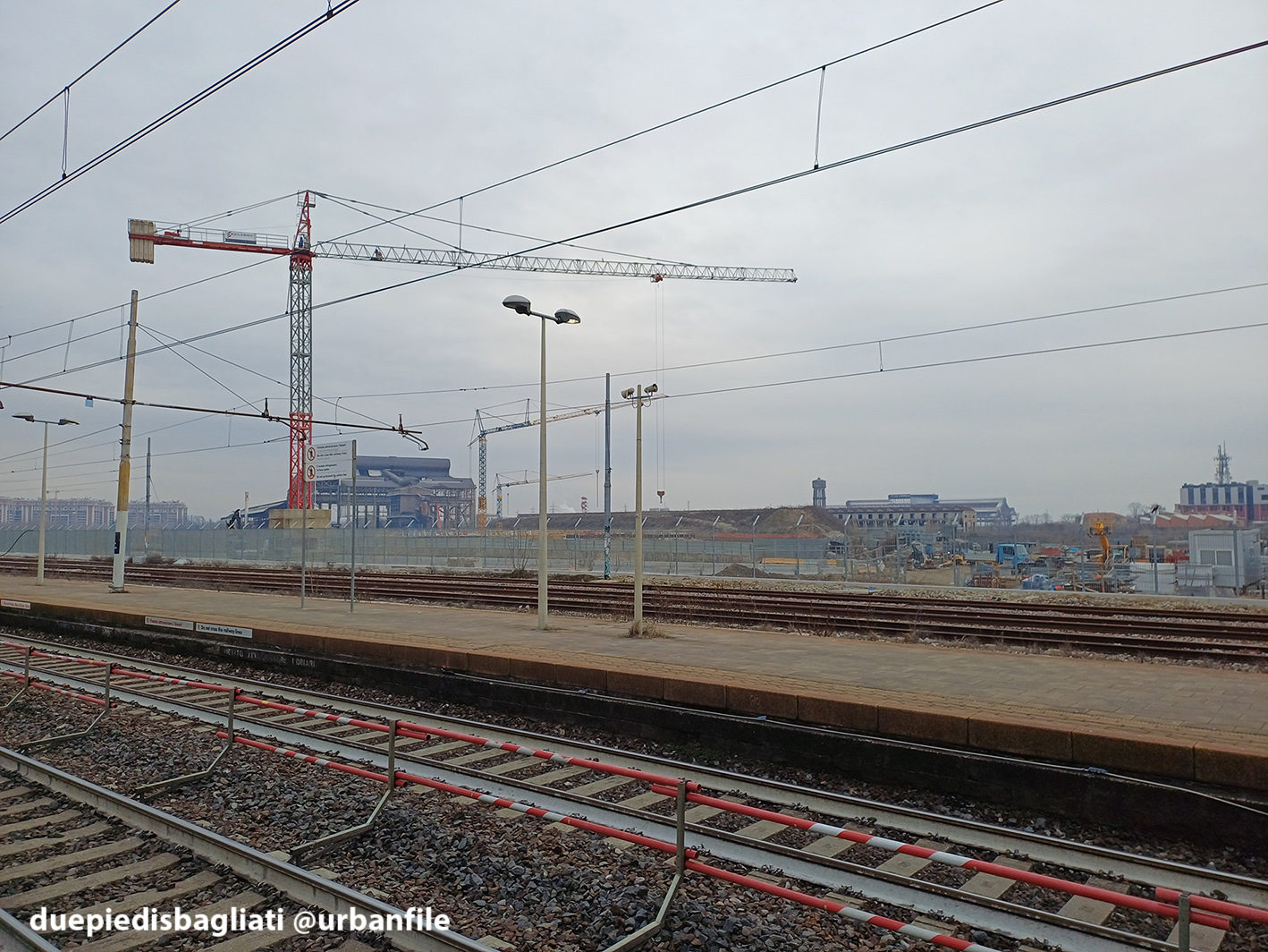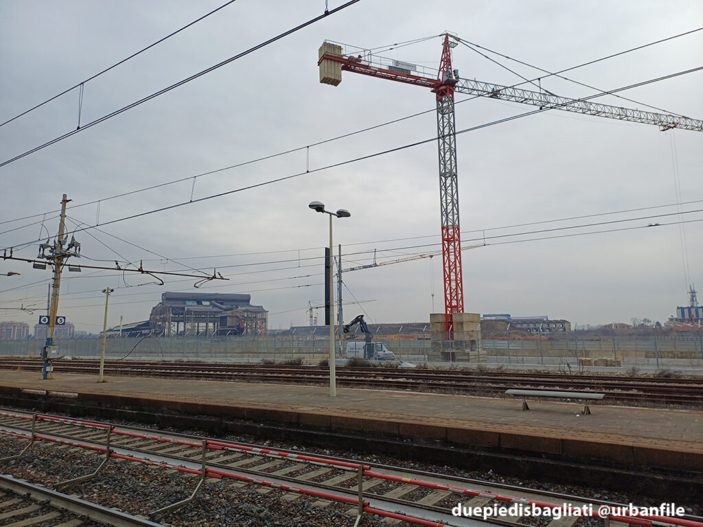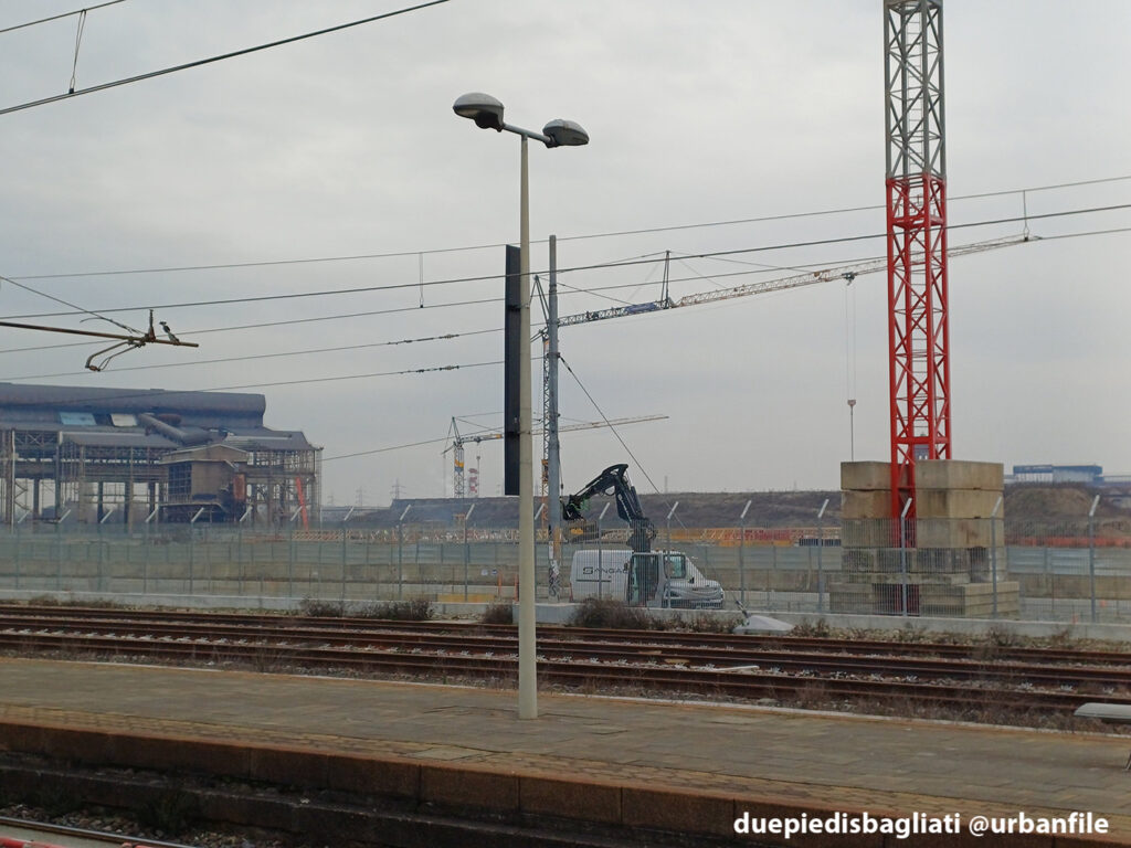 Il cantiere è ripreso da lontano, perché impossibile al momento avere una visione migliore. Su tutto domina la struttura della vecchia acciaieria che sarà mantenuta e restaurata. La città della salute procede all’orizzonte ma dalla stazione si vede poco (idem il lotto più lontano del residenziale in cui c’era del movimento ma del quale non siamo riusciti a fare foto).