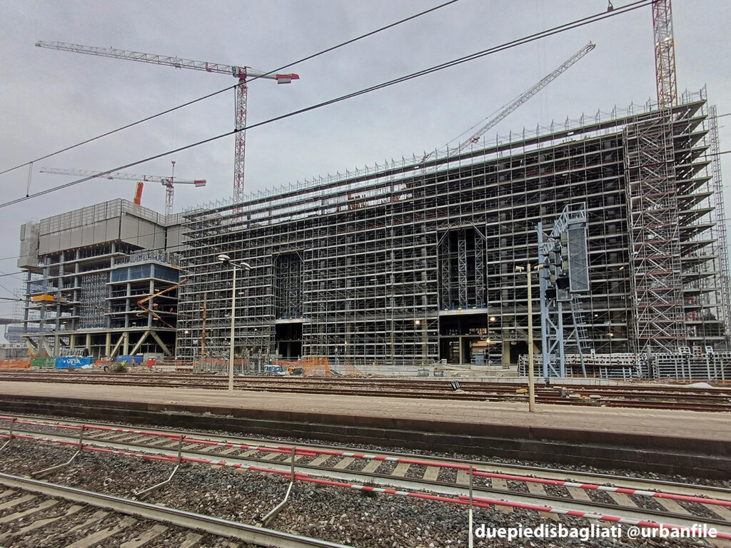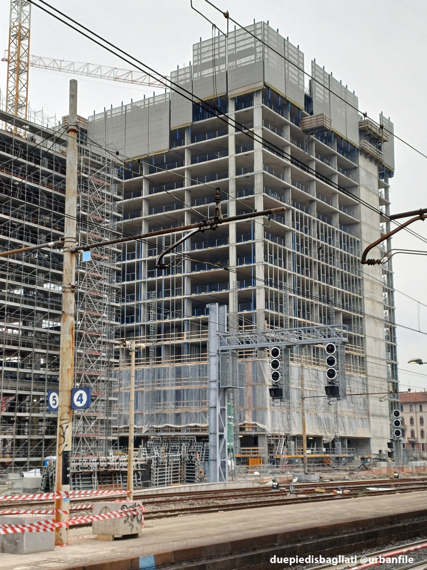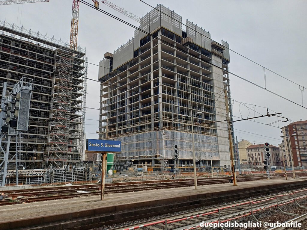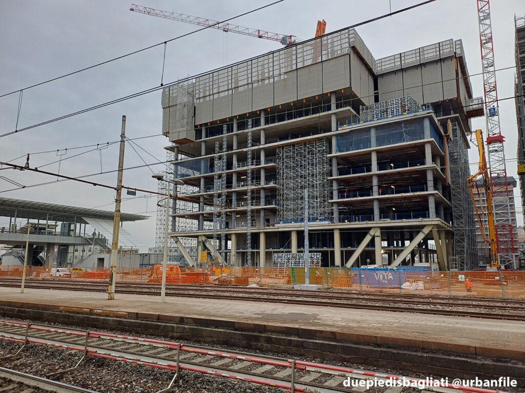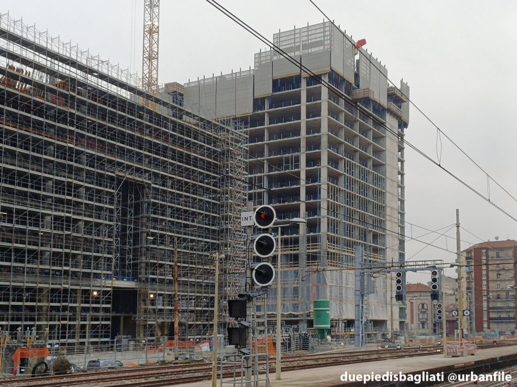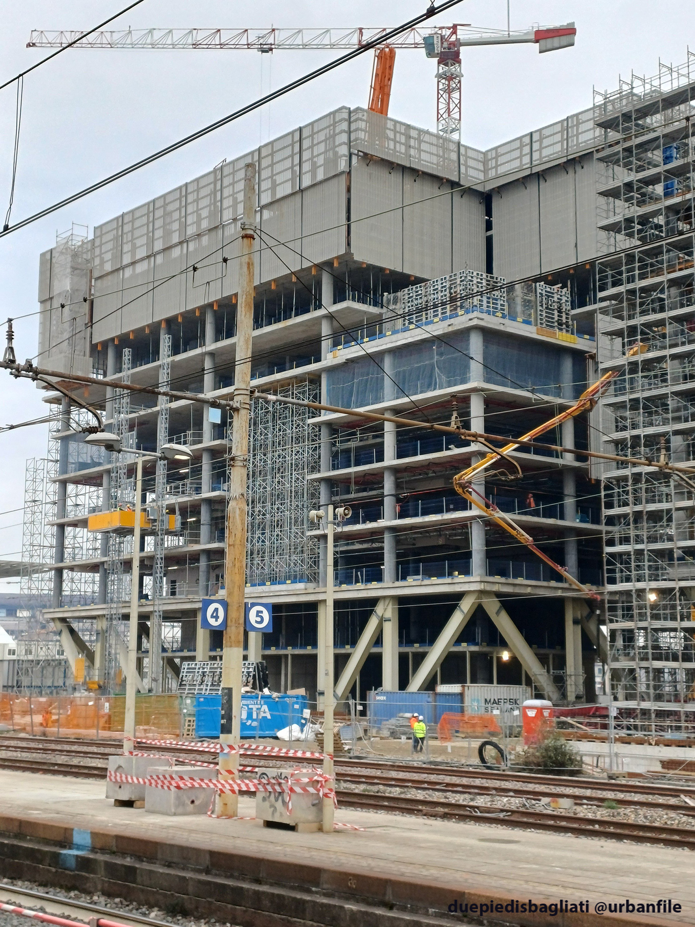 Il cantiere è ripreso da lontano, perché impossibile al momento avere una visione migliore. Su tutto domina la struttura della vecchia acciaieria che sarà mantenuta e restaurata. La città della salute procede all’orizzonte ma dalla stazione si vede poco (idem il lotto più lontano del residenziale in cui c’era del movimento ma del quale non siamo riusciti a fare foto).
