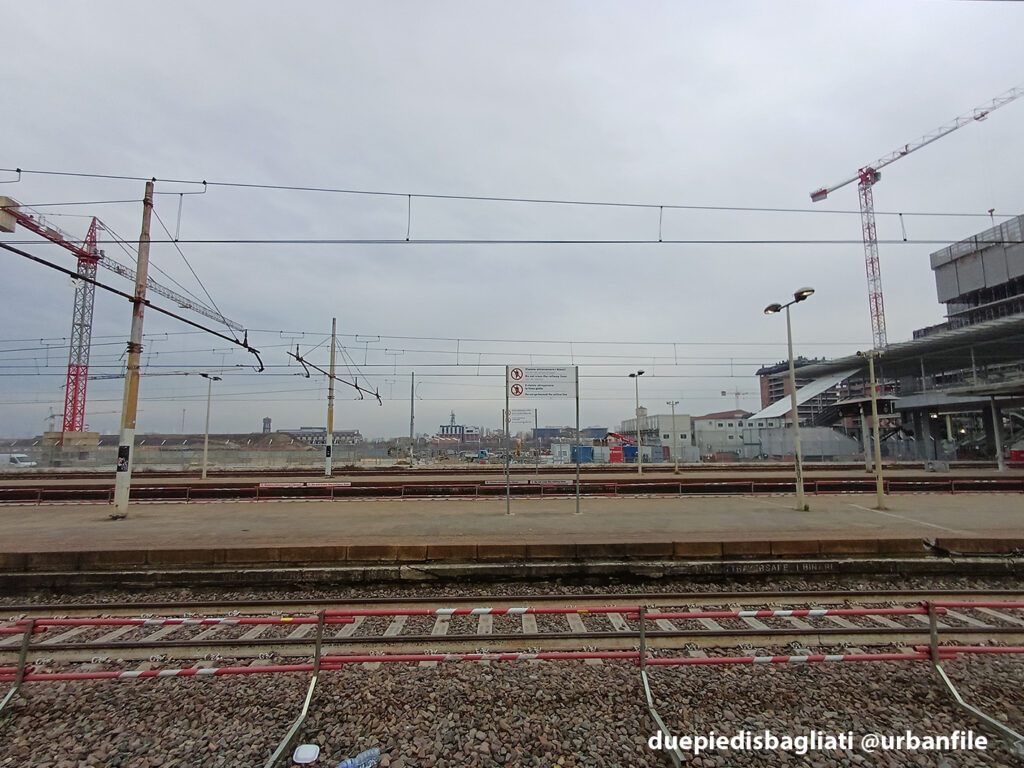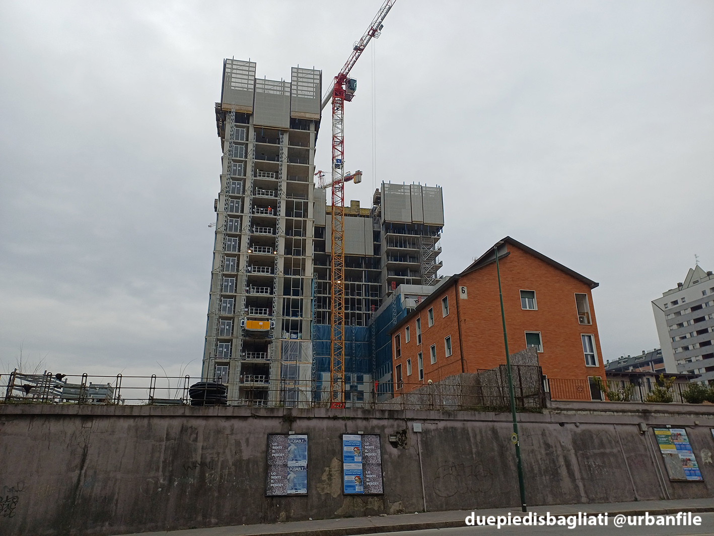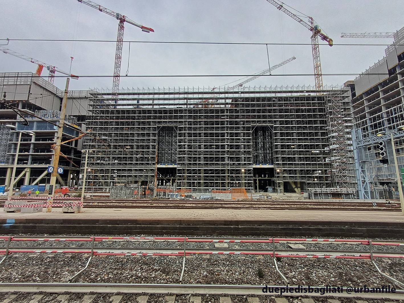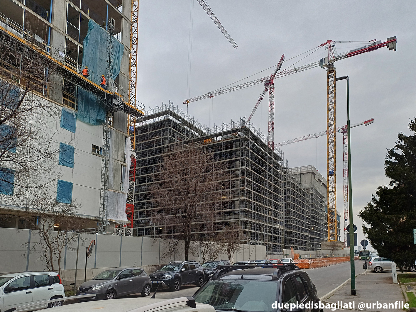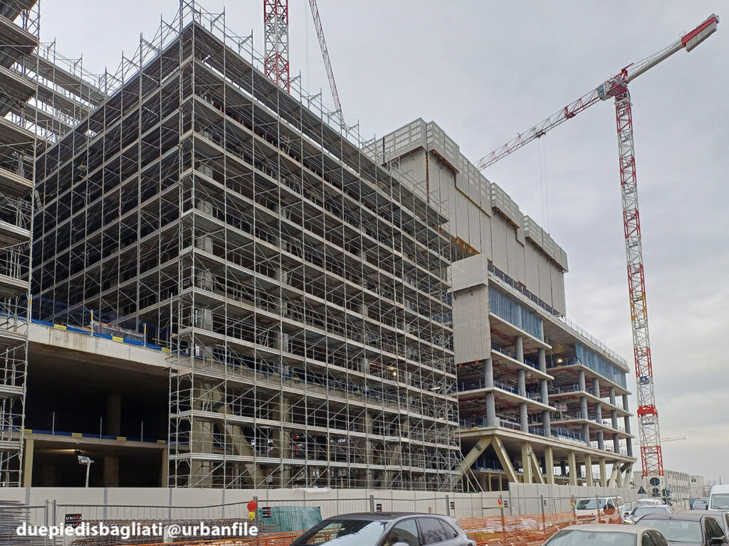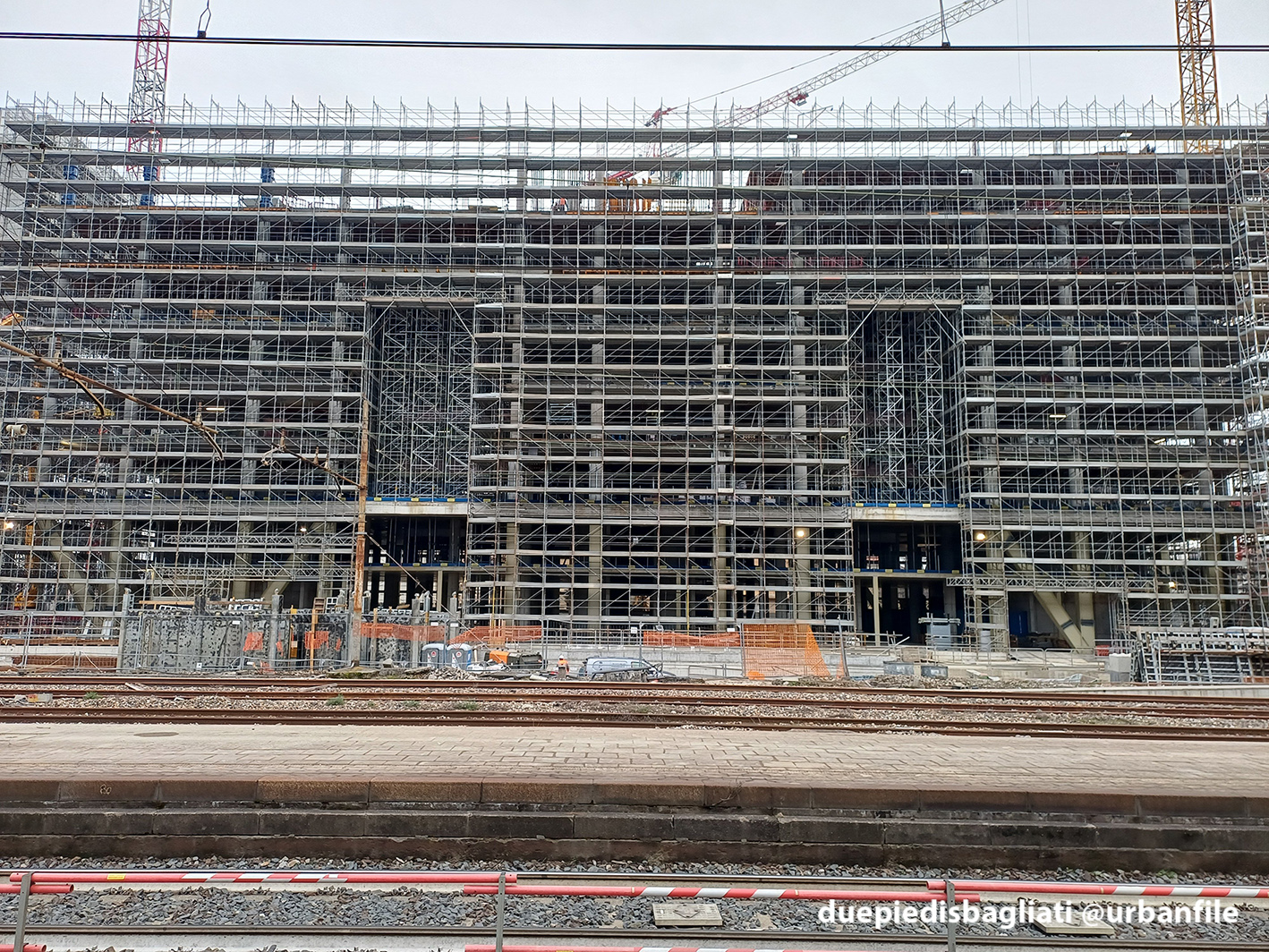 Il cantiere è ripreso da lontano, perché impossibile al momento avere una visione migliore. Su tutto domina la struttura della vecchia acciaieria che sarà mantenuta e restaurata. La città della salute procede all’orizzonte ma dalla stazione si vede poco (idem il lotto più lontano del residenziale in cui c’era del movimento ma del quale non siamo riusciti a fare foto).