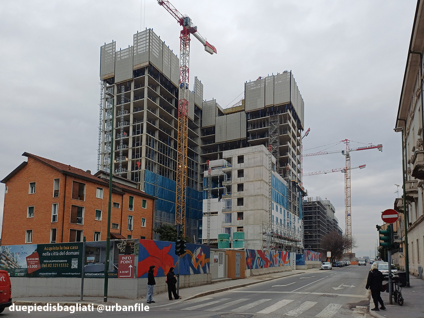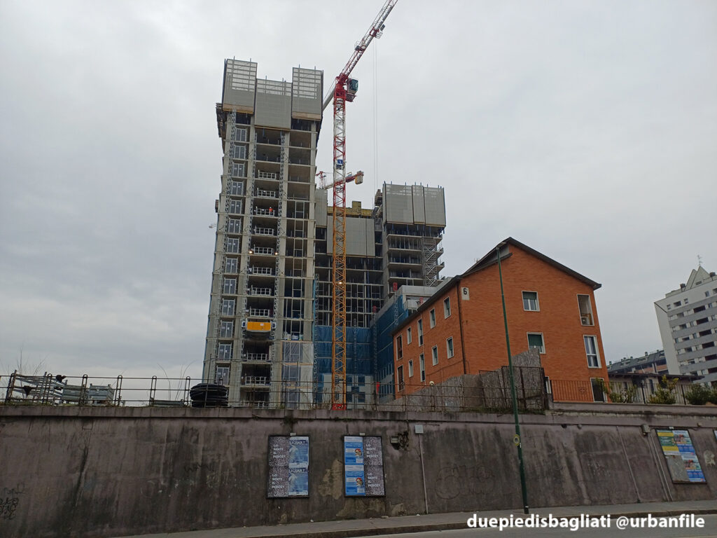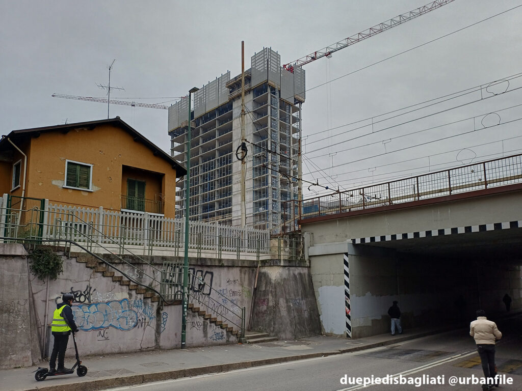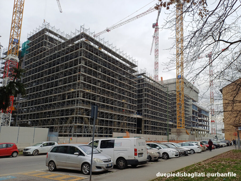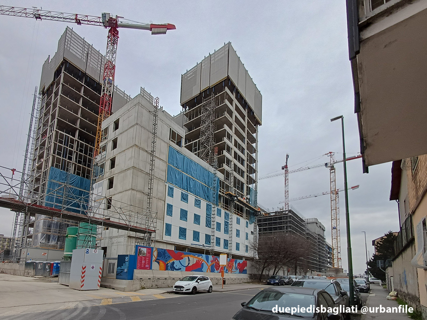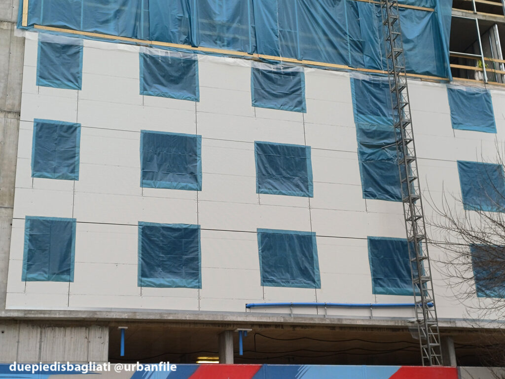 Di seguito il cantiere di via Acciaierie che affaccia anche sull’area della stazione. La parte inferiore dello studentato sembra siano stati montati dei pannelli di rivestimento isolante ai piani bassi.