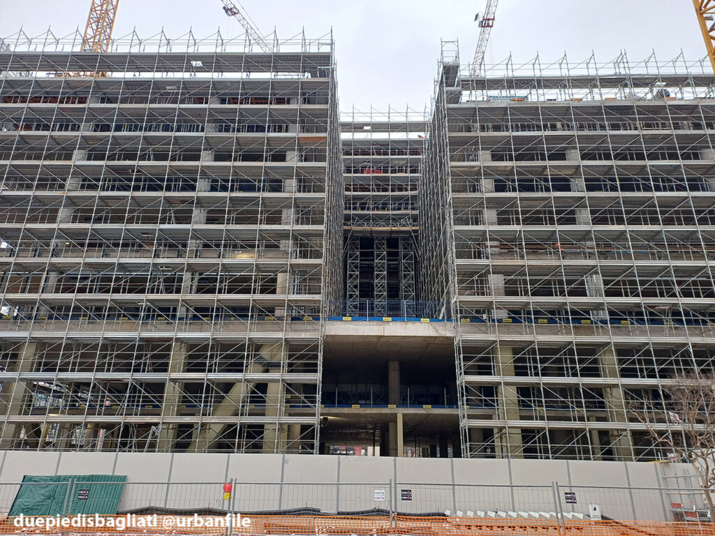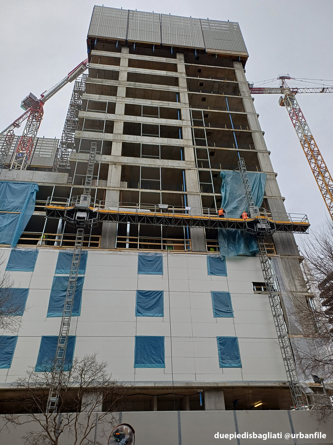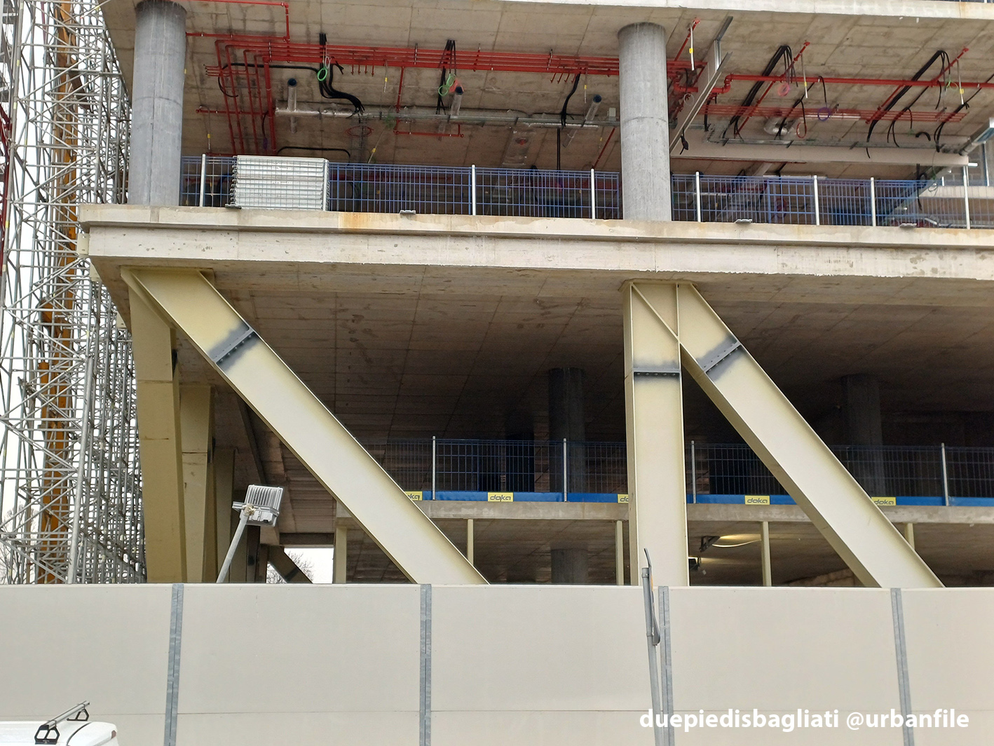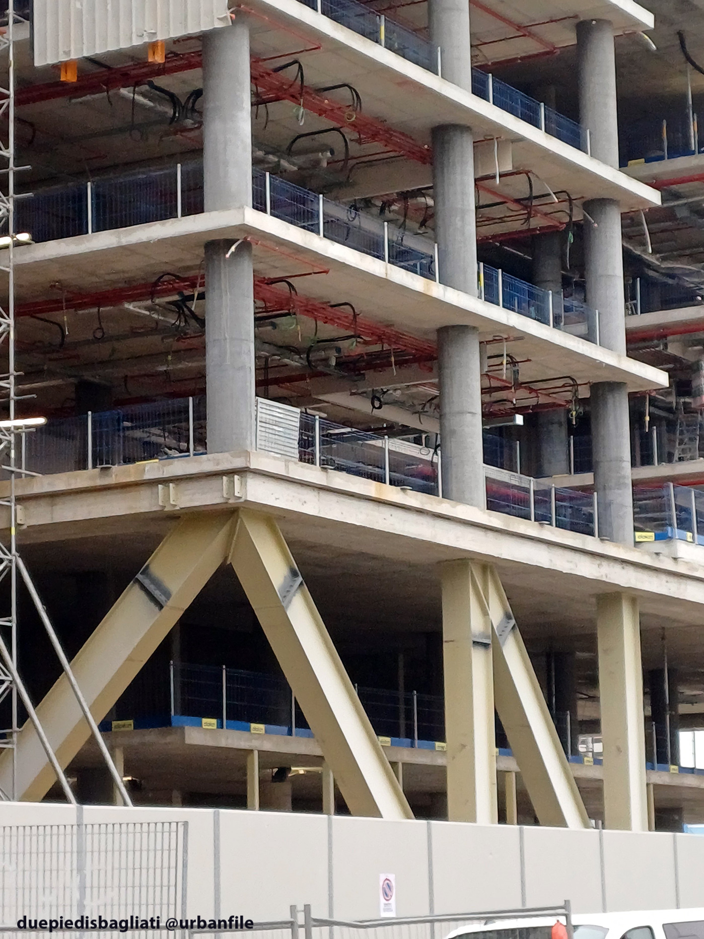I due palazzi proseguono nella loro salita. Particolarmente interessanti i pilastri inclinati di entrambi gli edifici. il palazzo sede del Gruppo Intesa cresce e ora inizia ad avere un bel gioco di volumi. Anche il palazzo per uffici basso sembra interessante tra parti incavate e “tagli” nella facciata.