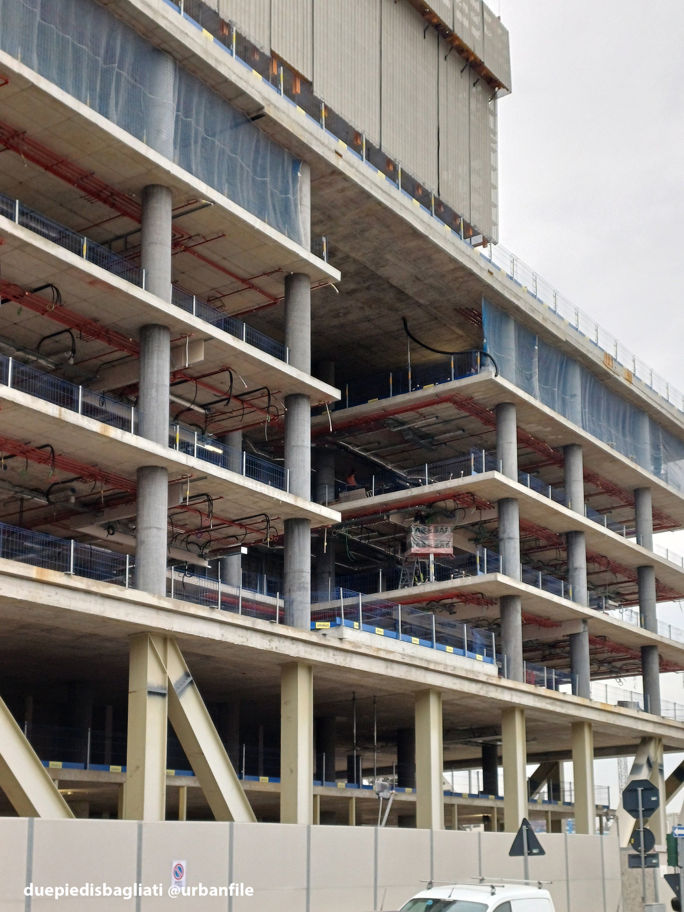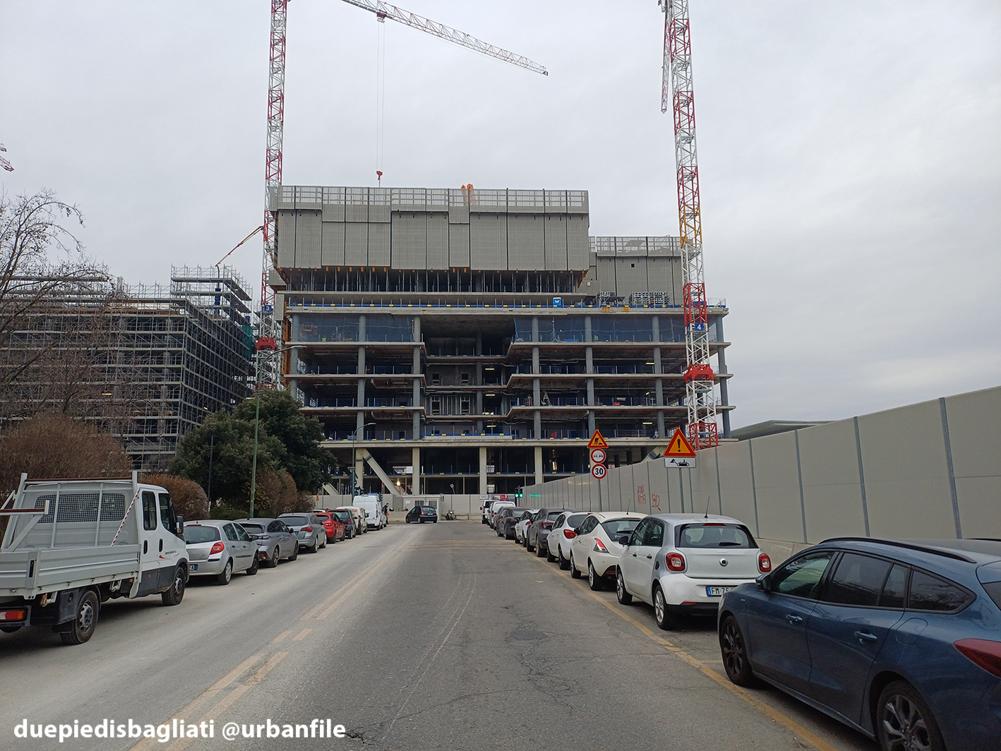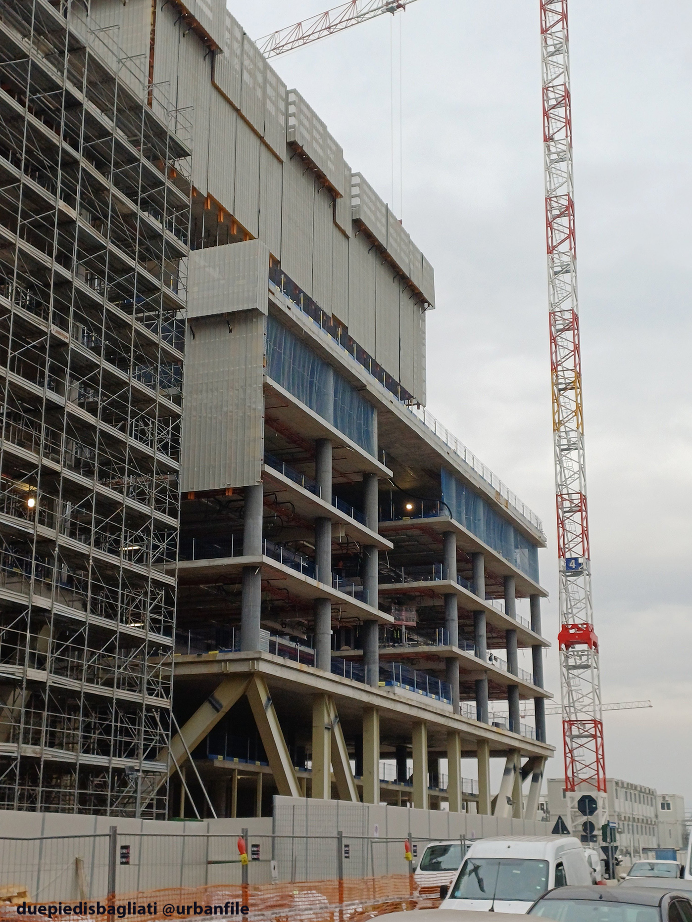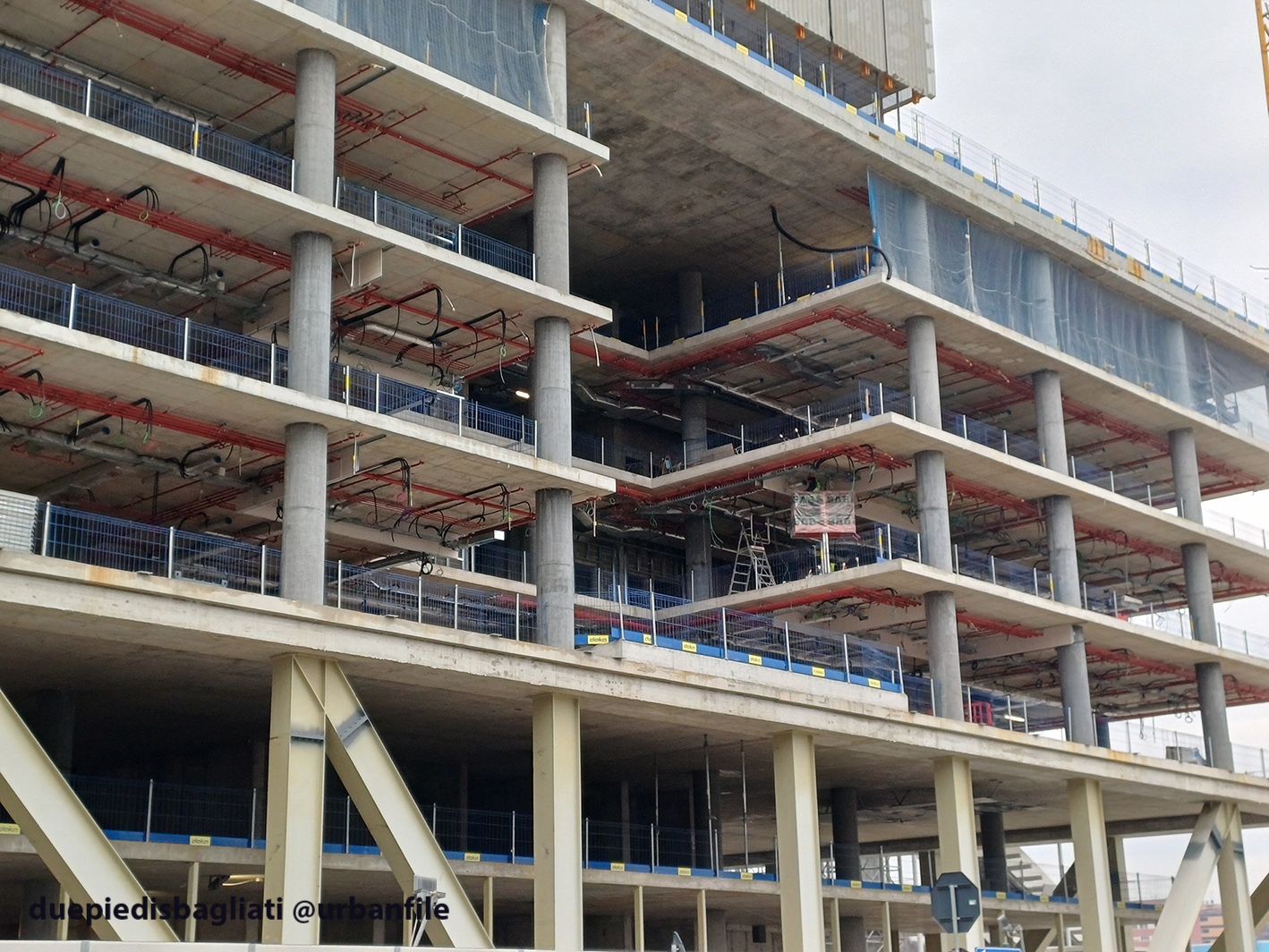I due palazzi proseguono nella loro salita. Particolarmente interessanti i pilastri inclinati di entrambi gli edifici. il palazzo sede del Gruppo Intesa cresce e ora inizia ad avere un bel gioco di volumi. Anche il palazzo per uffici basso sembra interessante tra parti incavate e “tagli” nella facciata.