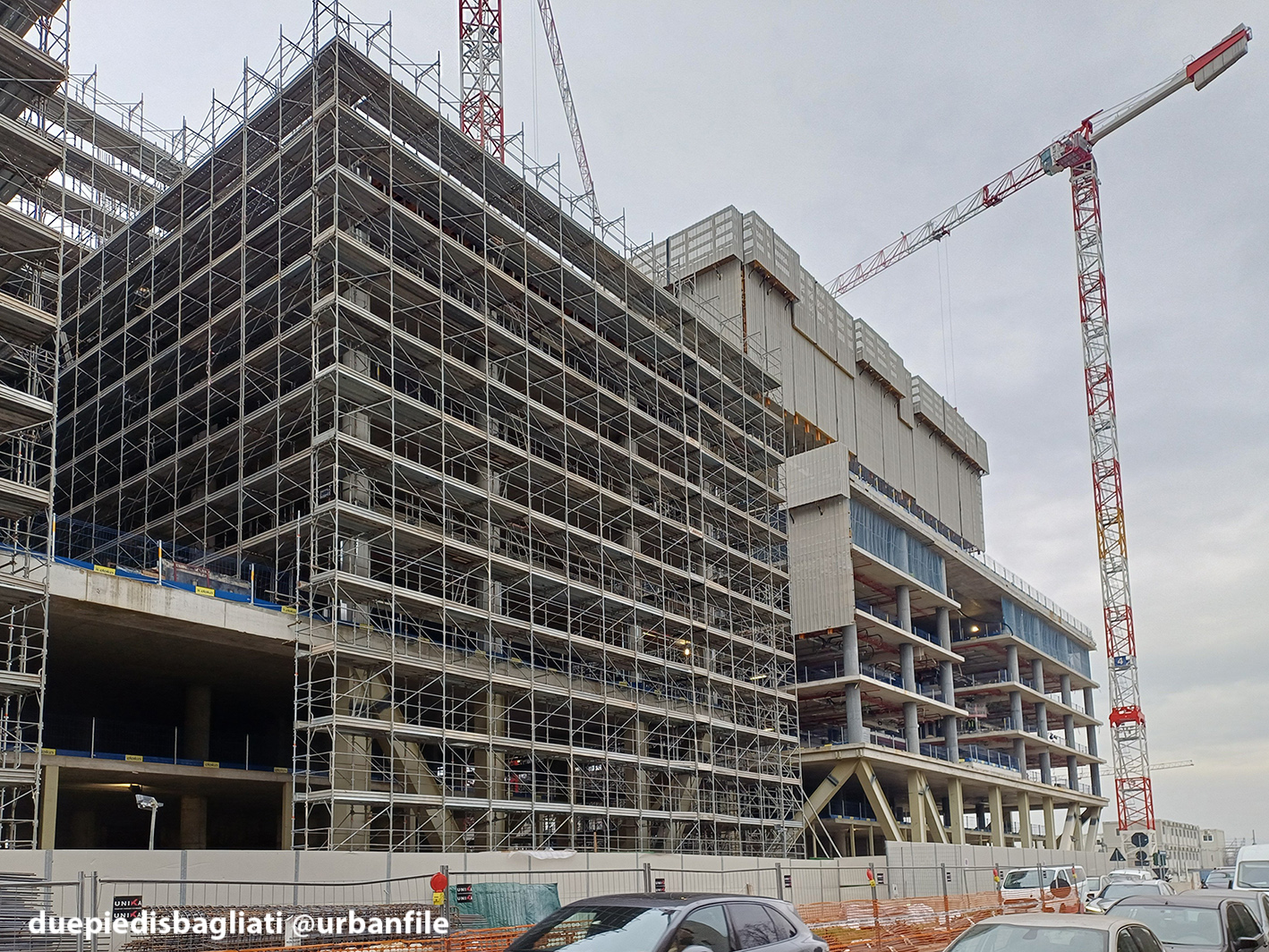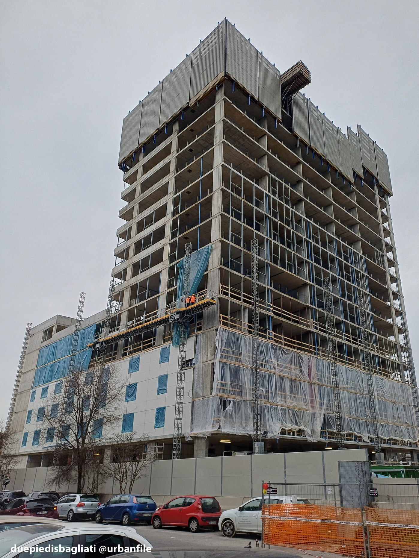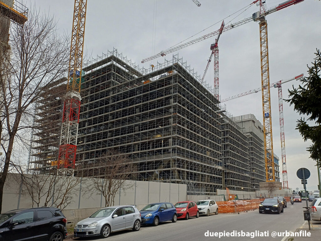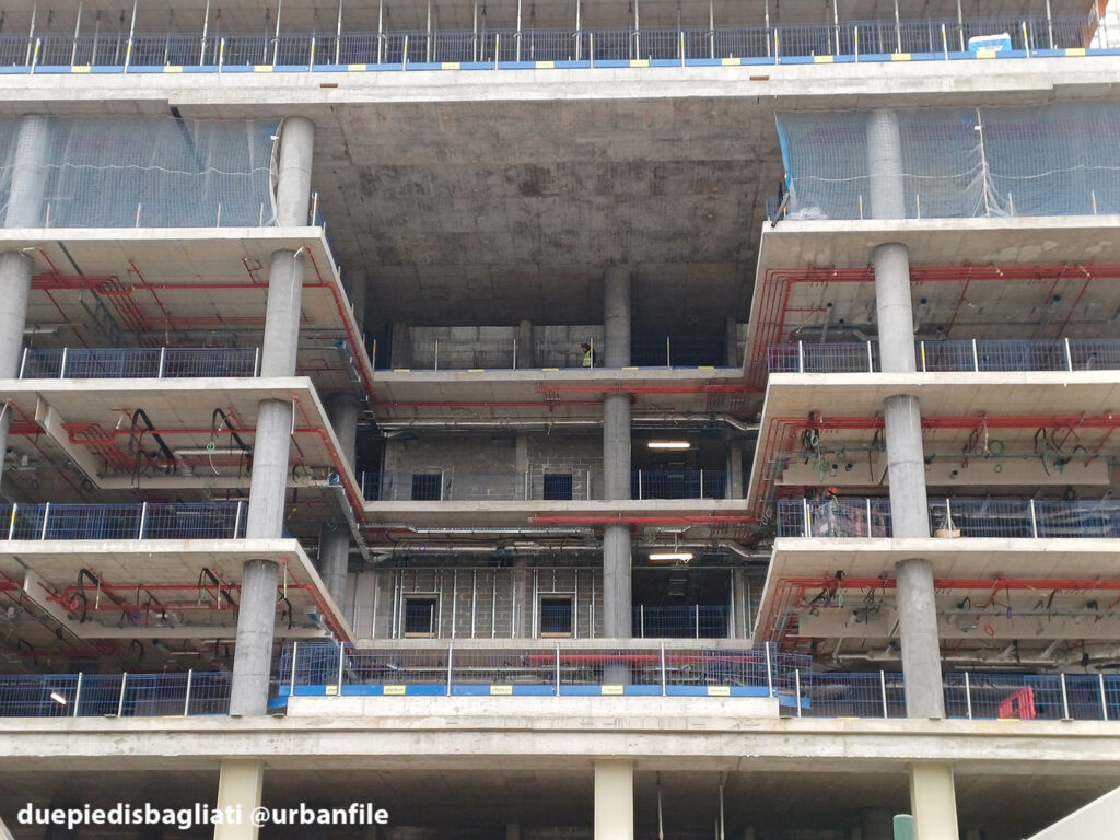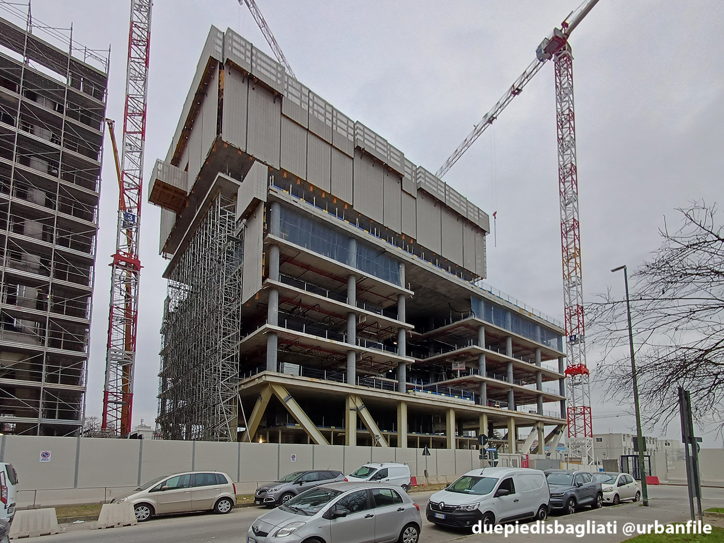 I due palazzi proseguono nella loro salita. Particolarmente interessanti i pilastri inclinati di entrambi gli edifici. il palazzo sede del Gruppo Intesa cresce e ora inizia ad avere un bel gioco di volumi. Anche il palazzo per uffici basso sembra interessante tra parti incavate e “tagli” nella facciata.