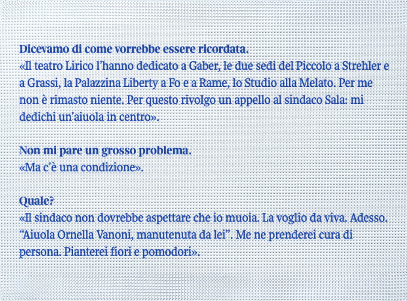 Nata a Milano nel 1934, formata alla scuola di Strehler, protagonista per oltre sessant’anni della scena musicale italiana, Vanoni ha lasciato più di cento album e un’eredità che va oltre i dischi: una lezione di eleganza, libertà e autenticità. Oggi, quella piccola aiuola davanti al Piccolo Teatro non è solo uno spazio verde, ma un luogo della memoria, dove Milano continua a parlare con la voce di Ornella.