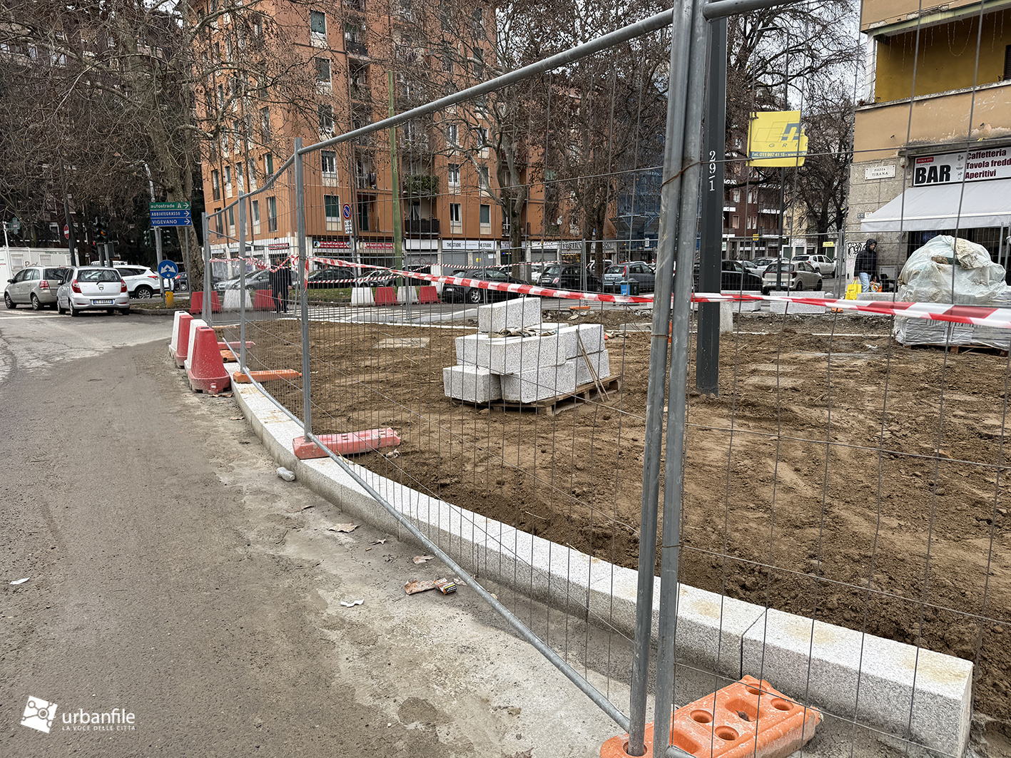Dopo l’incrocio proseguiamo verso piazza Tirana lungo via Segneri, dove il lato pari è mezzo fatto, e in parte aperto al passaggio pedonale, visto che il marciapiede sul lato dispari è interdetto dal cantiere che comunque, lentamente, prosegue. L’area interessata va dall’incrocio con via Dei Sanniti a piazza Tirana.