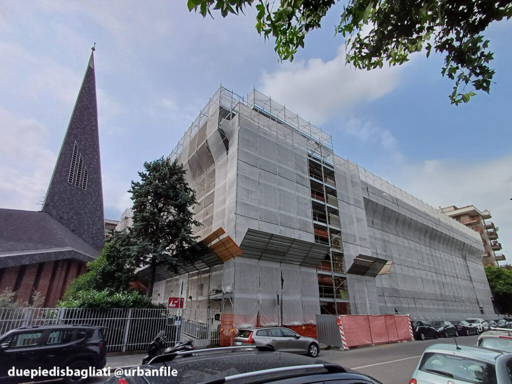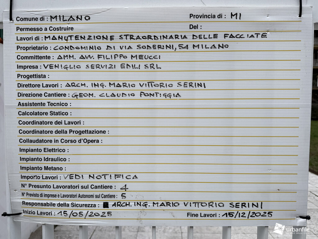 Più che un cantiere nuovo, si tratta di un cantiere per un intervento di manutenzione straordinaria del palazzo di via Luigi Soderini 59. L’edificio è un palazzo residenziale costruito nel 2019 e, guarda caso, come in molti altri casi, dopo neanche dieci anni deve già ricorrere a un intervento di manutenzione straordinaria (recentemente lo avevamo visto anche per il palazzo di via Muratori 13).