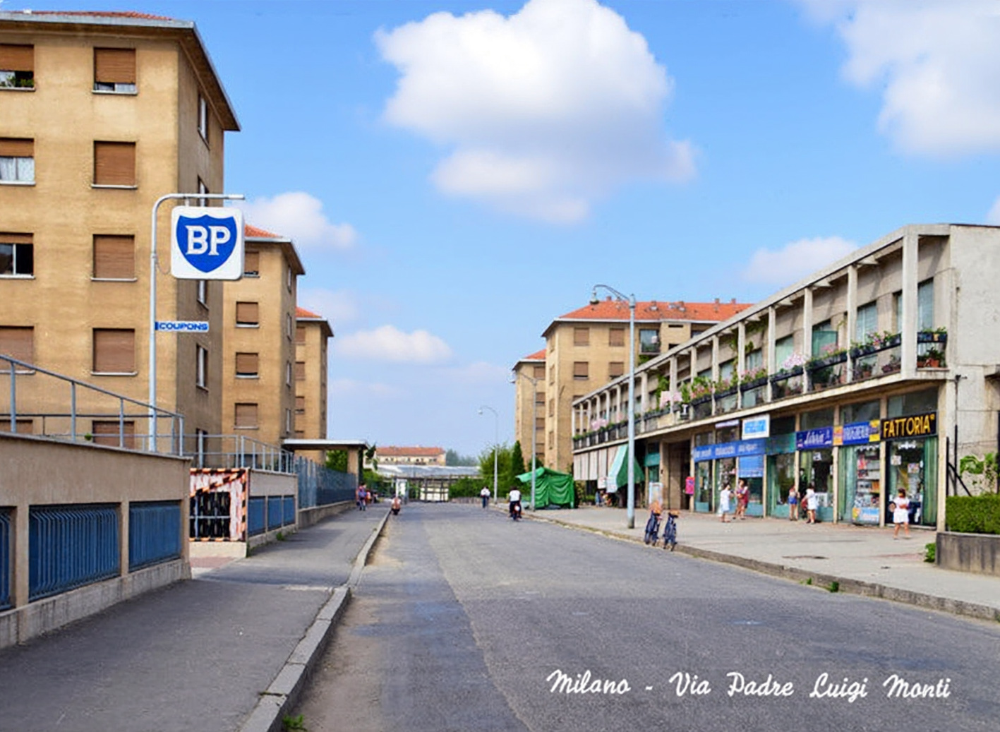 L’area commerciale destinata agli abitanti venne inizialmente concentrata lungo via Padre Luigi Monti, dal civico 18 al civico 24. Qui fu edificata una palazzina di due livelli: il piano terra ospitava le attività commerciali, mentre il piano superiore era adibito ad uso abitativo, presumibilmente destinato ai gestori dei negozi. Contestualmente alla costruzione della parrocchia, sul lato settentrionale dell’edificio sacro venne realizzata una seconda stecca commerciale lungo via Michele de Angelis, a ulteriore servizio del quartiere.