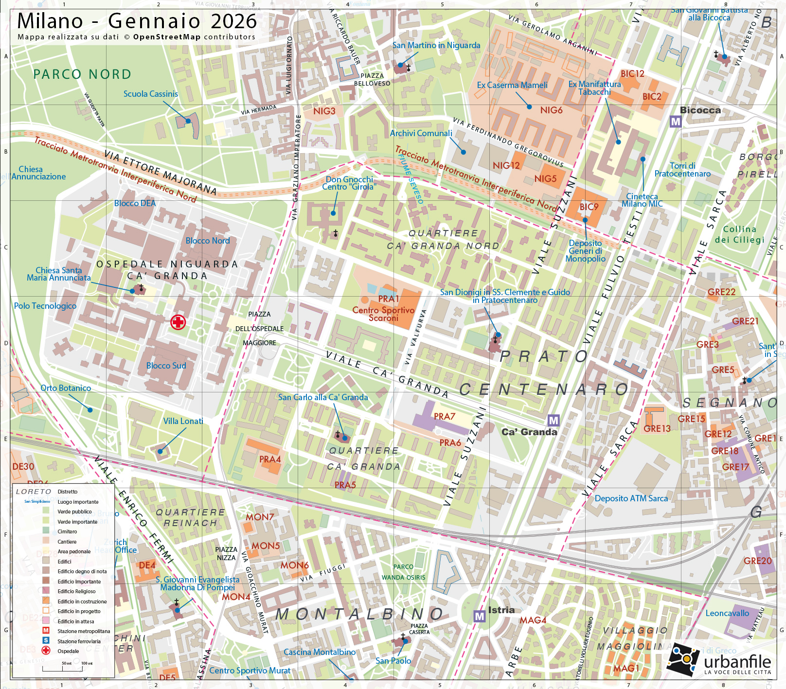 Il quartiere Ca’ Granda fu costruito nell’area dell’antico comune di Pratocentenaro e progettato secondo una maglia urbana regolare, basata su una griglia di vie ortogonali — via Padre Luigi Monti, via Michele de Angelis, via Val Daone, via Val di Nievole e Largo Rapallo — che ancora oggi garantiscono la viabilità dell’intera zona. Gli edifici a stecca risultano attentamente studiati per assicurare ampi spazi di separazione tra i corpi di fabbrica, favorendo al contempo la presenza di aree verdi, tuttora curate dall’amministrazione comunale. Al centro del quartiere emerge la chiesa parrocchiale di San Carlo alla Ca’ Granda, realizzata nel 1960 su progetto dell’architetto Guglielmo Giani, punto di riferimento non solo religioso ma anche urbanistico.