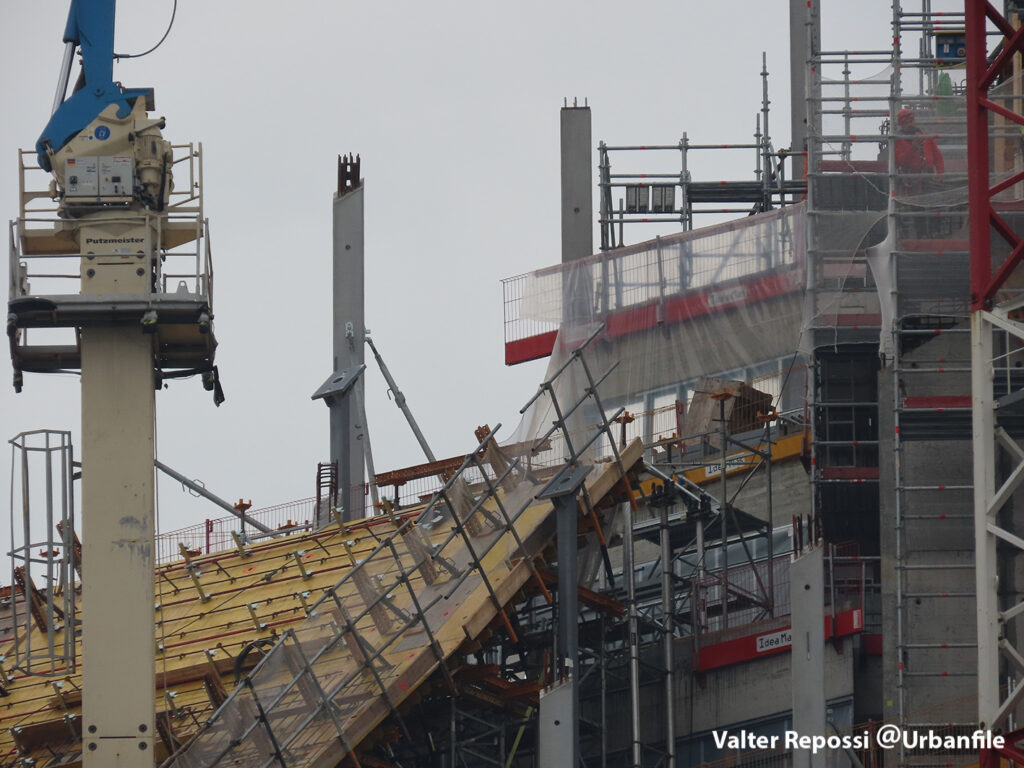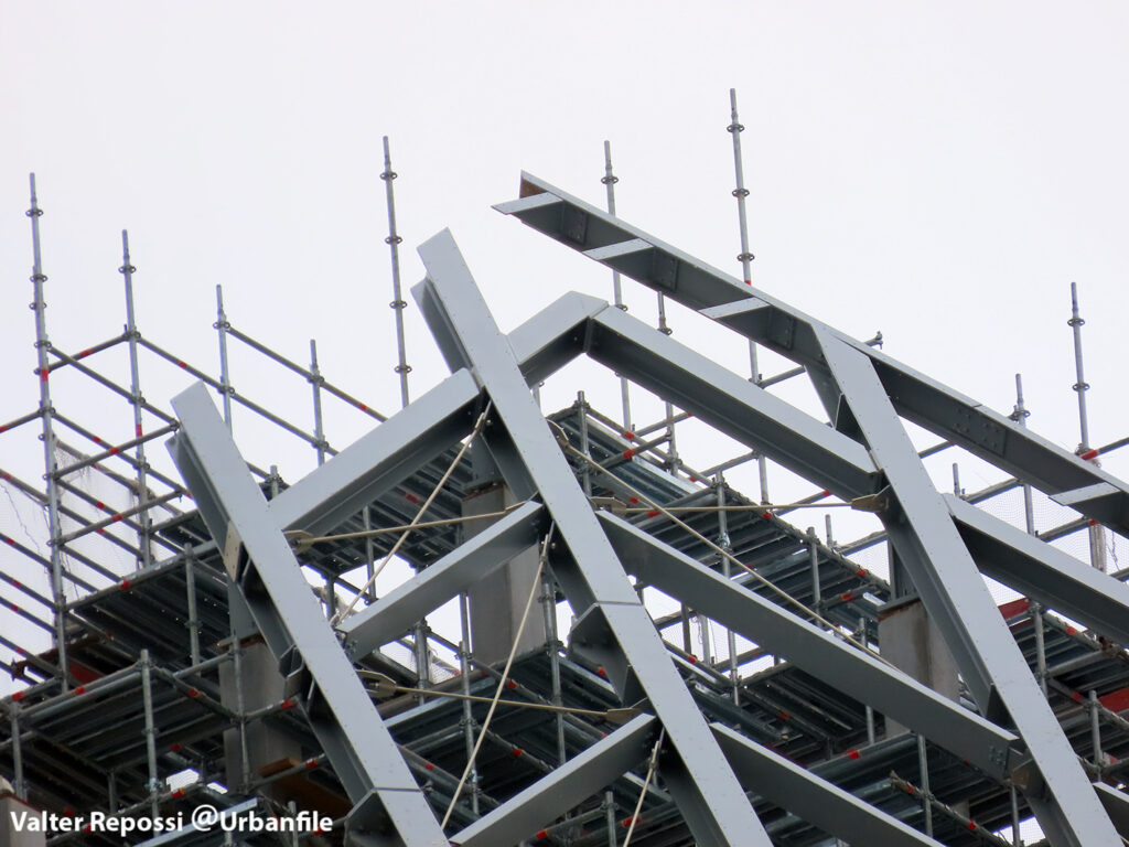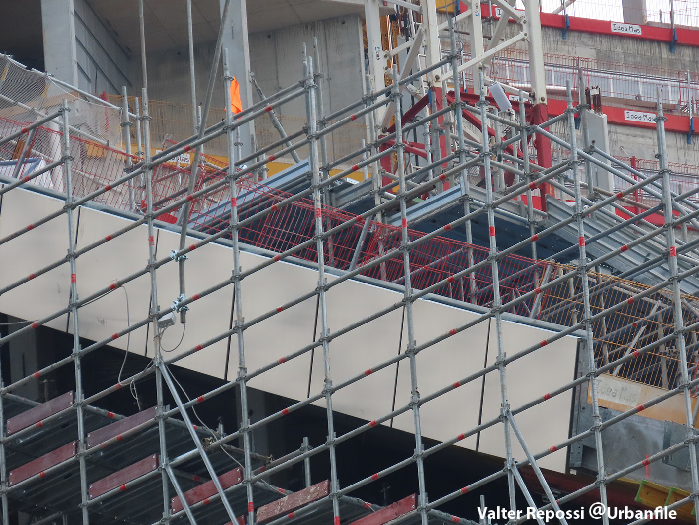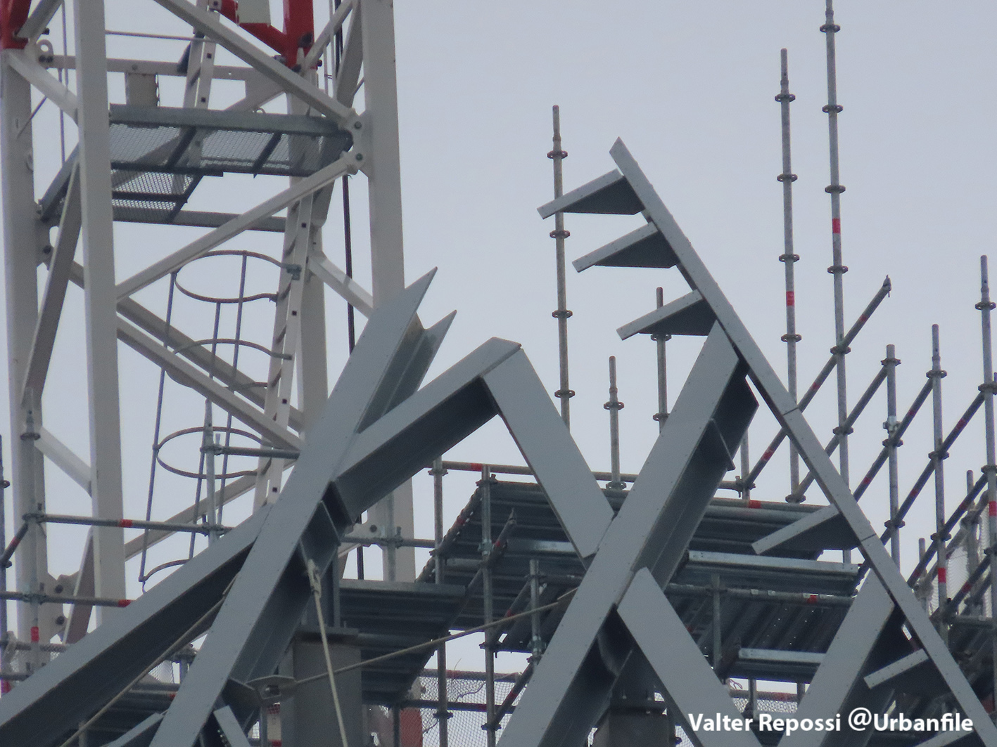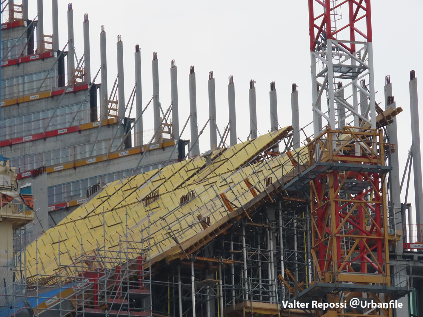 Proseguono i lavori alCityWave, oltre al montaggio delle vetrate delle facciate, anche quelli per completare la copertura del tetto e l’incredibile e complessa tettoia (canopy) che come un “telo” unirà le due torri del nuovo edificio per uffici in realizzazione nell’area verso largo Domodossola.